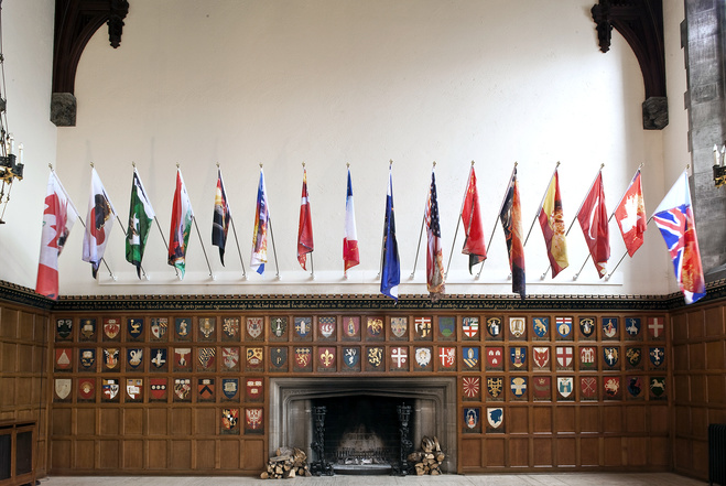36 drapeaux, teinture sur tissu Duralux, aluminium, dimensions diverses.