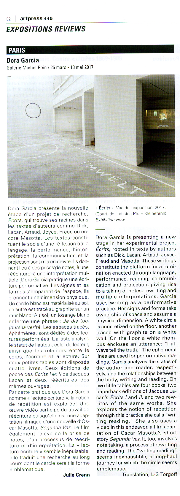 Publié 22 août 2017 à 607 × 1671 in [COMPTE RENDU EXPOSITION] Dora Garcia – Galerie Michel Rein, Paris /// ARTPRESS #445. Les rétroliens sont fermés, mais vous pouvez poster un commentaire