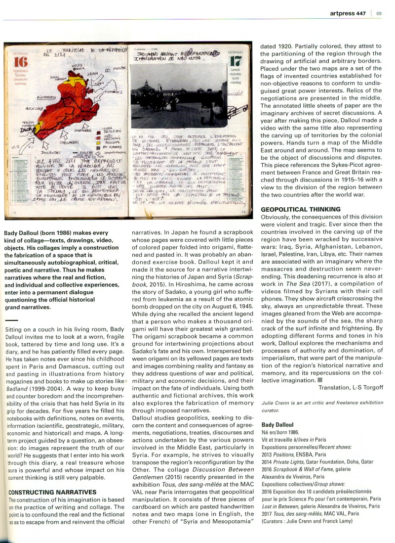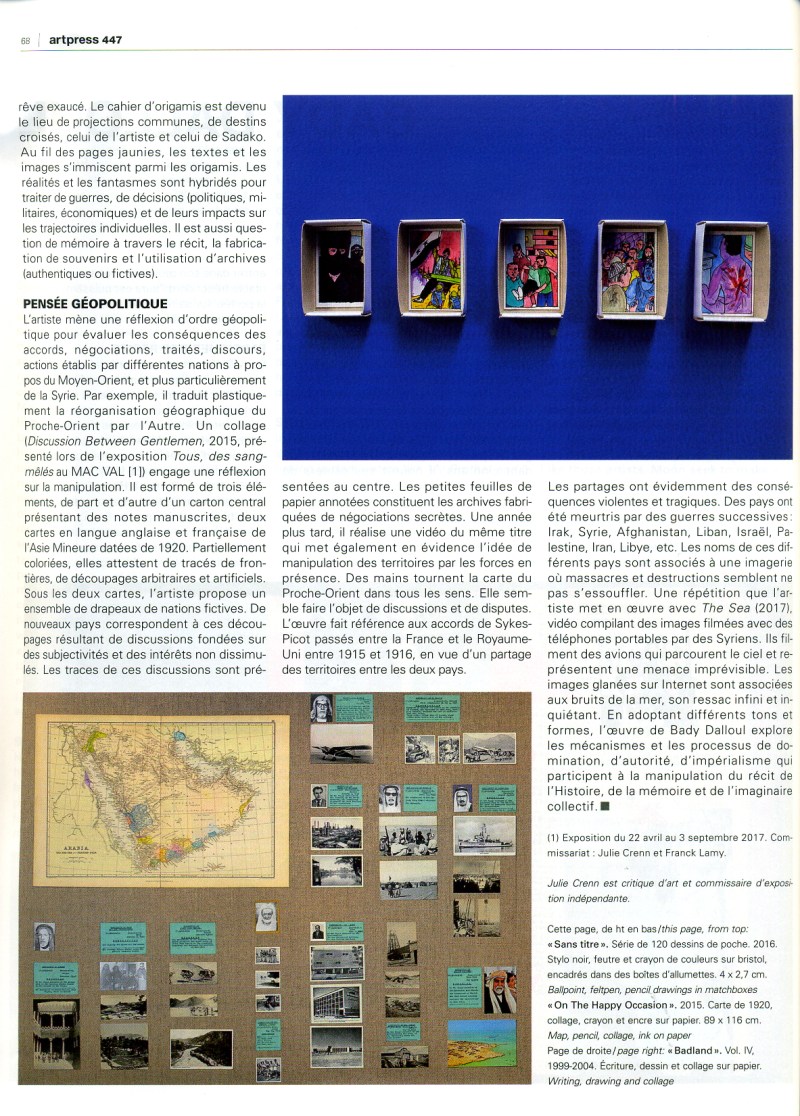 [INTRODUCING] BADY DALLOUL /// ARTPRESS #447 Badland, Vol. IV, 1999-2004écriture, dessin et collage sur papier Discussion Between Gentlemen, 2016Vidéo, carte de 1920, crayons / 9’30 ——————————————————————————————————————– Plus d’informations / + ARTPRESS Partager : Cliquez pour partager sur Facebook(ouvre dans une nouvelle fenêtre) Facebook Cliquer pour imprimer(ouvre dans une nouvelle fenêtre) Imprimer Cliquer pour envoyer un lien par e-mail à un ami(ouvre dans une nouvelle fenêtre) E-mail Cliquez pour partager sur Tumblr(ouvre dans une nouvelle fenêtre) Tumblr Cliquez pour partager sur LinkedIn(ouvre dans une nouvelle fenêtre) LinkedIn Cliquez pour partager sur Pinterest(ouvre dans une nouvelle fenêtre) Pinterest Cliquer pour partager sur X(ouvre dans une nouvelle fenêtre) X J’aime chargement…