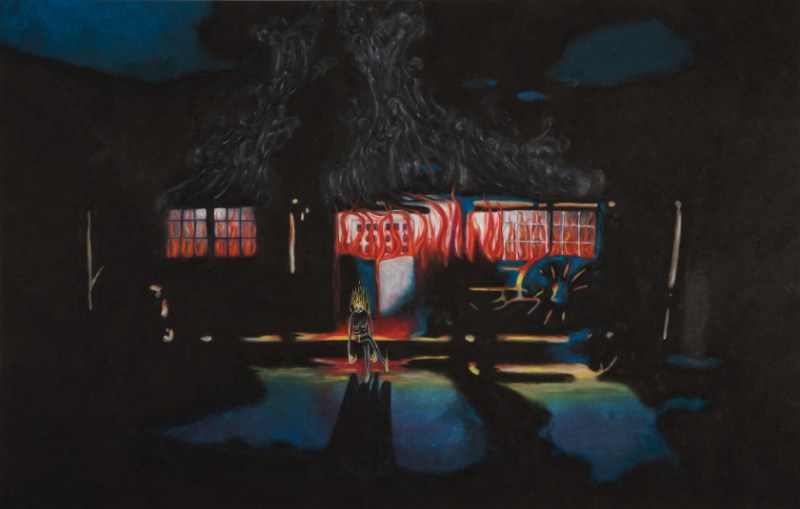 Un récit et un décor au sein desquels Alice Assouline nous invite à nous immerger physiquement. Les peintures grands formats nous enveloppent, tandis que les formats plus modestes et les dessins exigent une attention plus accrue. Aux œuvres murales s’ajoutent des œuvres en volumes qui, elles aussi, participent de la construction d’un paysage mental, d’une autre circulation dans l’espace et entre les corps. Il nous faut y déambuler, contourner les œuvres, les appréhender de toutes parts. Les sculptures, réalisées en collaboration avec des maîtres verriers et céramistes, donnent corps à des motifs présents dans les peintures et les dessins. Nous retrouvons ainsi la petite femme rousse, le miroir en flamme ou encore un étrange pivert en céramique blanche, qui, de son bec, semble transpercer le dessus d’une vieille malle rouge. L’artiste transpose ainsi les images dans l’espace, en leur donnant une réalité tangible, physique et sensible. Les matériaux retenus (la peinture à l’huile, le verre, le bois, la terre émaillée) sont en adéquation avec l’intention plastique de l’artiste : séduire et troubler le regardeur. En ce sens, elle construit et active des pièges. Nous sommes irrésistiblement aimantés par le verre et la terre émaillée, tandis que les peintures de facture séduisante, figurant de lugubres paysages, nous attirent, puisqu’elles posent à première vue la question du sublime : ce qui nous dépasse. Il nous faut alors nous approcher pour cerner les détails, les éléments narratifs, pour saisir une atmosphère énigmatique, un malaise, une inquiétude. Alice Assouline manipule ainsi deux sentiments, l’attraction et le malaise. Entre le rêve et le cauchemar, elle fabrique des espaces de projections où se déploient les peurs et les fantasmes inhérents aux imaginaires collectifs.