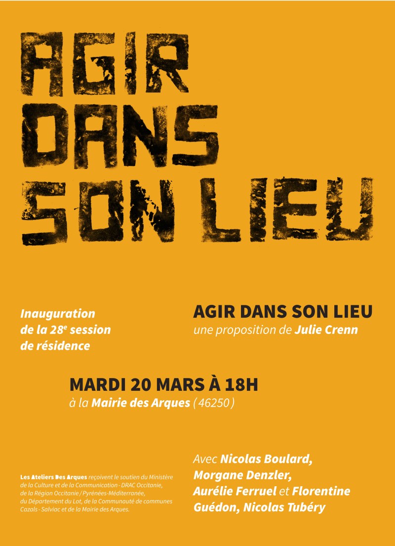 Par la marche et une observation accrue de la construction des paysages, Morgane Denzler déplace le médium photographique pour imaginer de nouveaux rapports à la cartographie.Son expérience physique du paysage donne lieu à une topographie nouvelle, à la fois plastique et mémorielle. Issues de familles d’agriculteurs, Aurélie Ferruel et Florentine Guedon portent un regard sensible sur le monde paysan. Dans une démarche de type sociologique et ethnographique, elles fouillent et hybrident les traditions rurales. En partant de réalités locales, spécifiques au territoire qu’il explore, Nicolas Boulard entremêle la notion de terroir et les principes de l’art minimal. Les installations vidéo de Nicolas Tubéry nous plongent dans l’univers de l’élevage, le conditionnement des animaux, l’économie, le soin, ainsi que la fierté et les difficultés inhérentes aux métiers d’éleveurs. En 2011, Édouard Glissant déclamait « Agis dans ton lieu, pense avec le monde ! ». Le titre et l’ambition du projet empruntent à la pensée de Glissant qui nous invite à agir, à penser, à comprendre et à nous indigner. [Julie Crenn]