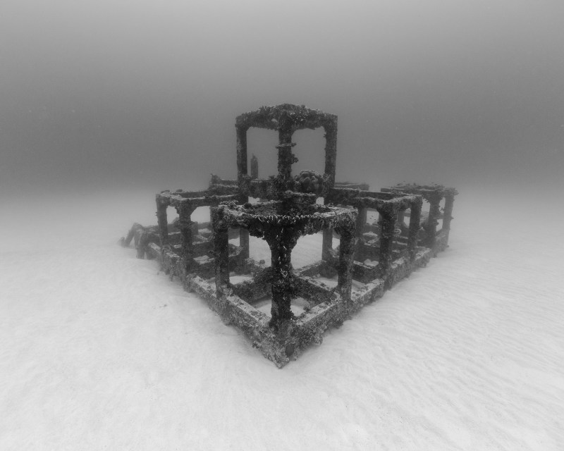 La nouvelle exposition de Nicolas Floc’h nous plonge, au sens propre comme au sens figuré, dans un paysage immergé, celui des fonds marins. Elle constitue à la fois le résultat de plus de sept années d’exploration de paysages mal connus, mais aussi les prémices d’une recherche au long cours. Une recherche protéiforme mêlant photographie, sculpture, peinture et performance qui se déploie dans chacun des espaces du FRAC Bretagne. Dès l’entrée, nous sommes confrontés à La Tour Pélagique (2008), une œuvre formée d’un filet de pèche monumental (125 x 125 x 300 mètres) plié et compacté. Il prend une forme rectangulaire dont les mesures correspondent à celles de la Tour Eiffel. Deux constructions humaines sont confondues dans leurs échelles. Le filet de pèche renvoie à l’espace marin que Nicolas Floc’h explore depuis de nombreuses années pour en comprendre le fonctionnement, le rayonnement, les mystères, l’importance et l’urgence. La première galerie est consacrée aux Villes Immergées, un travail de reconnaissance et d’inventaire des récifs artificiels. Les fonds marins en compte plusieurs milliers de ces villes englouties (pas moins de 20 000 au Japon), constituées de constructions en béton, géométriques et modulaires. Les récifs sont des habitats qui participent à la préservation et la régénération de la faune et la flore marine. À la manière des Becher, l’artiste photographie, sans aucun artifice lumineux, les architectures sous-marines. Les photographies en noir et blanc font état de motifs et de formes qui rappellent celles de l’art minimal. Dans l’espace d’exposition sont disposées au sol une quarantaine de sculptures en béton qui reprennent les formes des modules photographiés. La plongée est visuelle et physique. Un rapport accentué dans la seconde salle, où les sculptures et les photographies des paysages sous-marins de l’île d’Ouessant adoptent des formats plus généreux. Le regardeur entre dans l’image pour en apprécier la profondeur, le grain particulier, le silence. Les deux premières salles sont dominées par le blanc, le noir et le gris. Une gamme chromatique qui renforce à la fois les valeurs objectives et documentaires du projet, qui apporte également une lecture plus critique quand à l’état alarmant des mers et des océans. L’exposition est intitulée Glaz, un terme breton désignant la couleur de la mer, un camaïeu allant des bleus vers les verts. Une couleur indéfinissable, insaisissable, à laquelle Nicolas Floc’h a souhaité trouver une traduction plastique. Dans la grande galerie, les murs sont entièrement recouverts d’un pigment bleu extrait d’un phytoplancton (une cyanobactérie). Nous sommes immergés dans la couleur bleue. De part et d’autre de l’espace, deux œuvres se font face : près de l’entrée, un néon représente le dessin des mouvements et des gyres du Gulf Stream ; plus loin, l’artiste a installé un bioréacteur lumineux à l’intérieur duquel se développe le phytoplancton. La lumière, de part et d’autre de l’espace, croise les bleus et les verts, formant une peinture productive. L’exposition entremêle avec subtilité les courants artistiques, les médiums, mais aussi les préoccupations esthétiques, scientifiques et politiques.