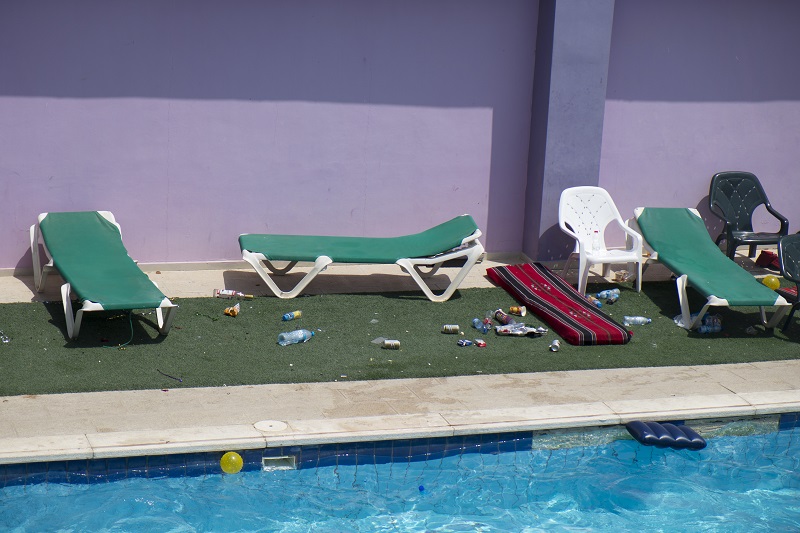 Entre 2013 et 2014, alors qu’elle était étudiante à l’école des Beaux-arts de Nancy, Julie Deutsch part en échange à Jérusalem. Une fois sur place, elle prend rapidement conscience de l’histoire, des réalités et des enjeux d’un territoire hautement complexe. Elle quitte Jérusalem et l’université israélienne pour s’installer Bayt Sahur (Cisjordanie), situant ainsi son engagement. La jeune artiste décide de revenir en Palestine en 2015. Les œuvres, réalisées sur place ou bien par la suite, traitent inévitablement d’un contexte spécifique, d’une région qu’elle est amenée à expérimenter et à tenter de comprendre. Les photographies et les vidéos se rapportent à des problématiques qui existent au Moyen-Orient et bien au-delà. À travers la rencontre de paysages, Julie Deutsch construit une réflexion sur le territoire, l’appartenance, la frontière, la propriété, la violence, l’exil, le passage, la résistance, la mémoire, le langage, le traumatisme et le corps. Face aux images, il nous est difficile de situer et d’identifier la scène. Le plus souvent, l’appartenance géographique ou culturelle n’est pas flagrante. Une double lecture nous est proposée. Une photographie intitulée Paradise Hotel (2015) pose une volonté de trouble et de déterritorialisation. Sur un fond de bâtiment peint en mauve très clair se détachent des fauteuils en plastique blanc disposés sur une moquette verte le long d’une piscine. Une fête a eu lieu. Les ballons jaunes, les cannettes, les bouteilles et autres sachets jonchent au sol. Il nous est quasiment impossible de localiser la scène. Un petit matelas rouge à bandes noires constitue pourtant un indice. L’image a été prise dans la cour intérieure d’un hôtel situé en Cisjordanie, dans le désert de Jéricho. Un lieu où les individus issus des différentes communautés palestiniennes se retrouvent pour se détendre et faire la fête ensemble. Un hôtel, comme un no man’s land, un « paradis » artificiel où le divertissement est permis pour quelques heures.