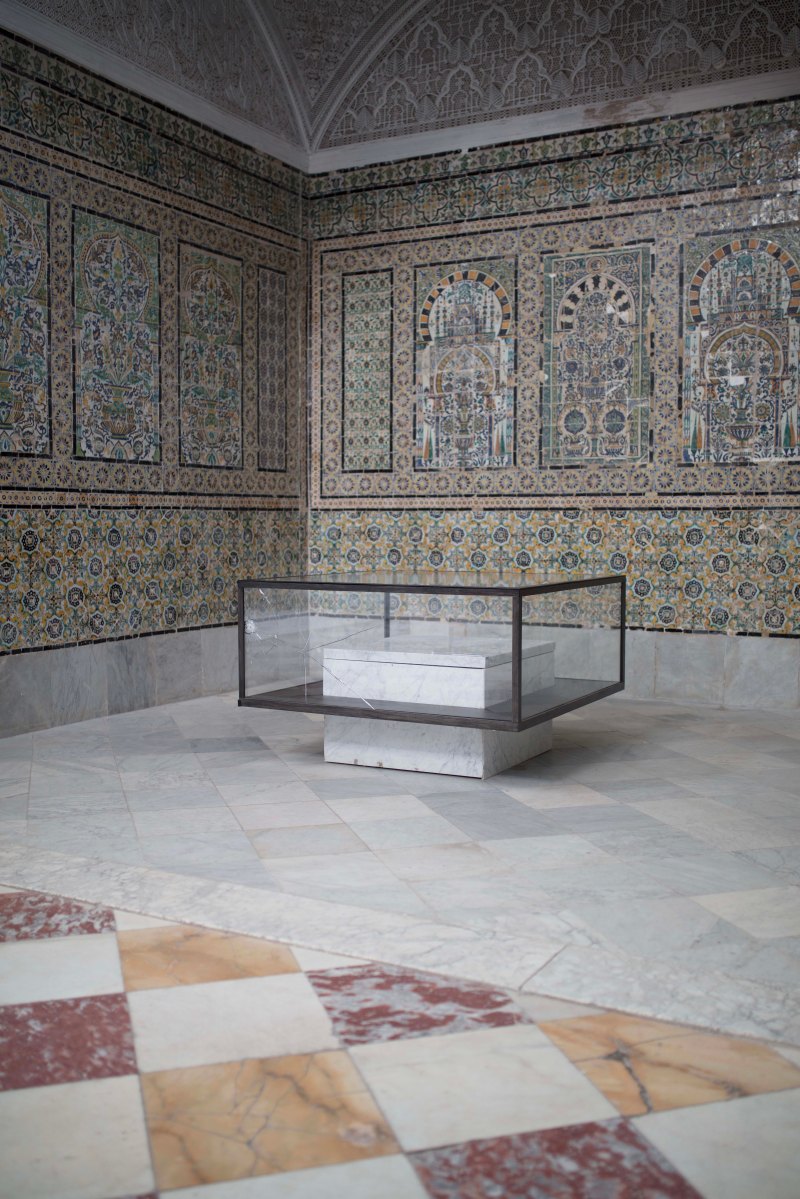 Les œuvres de Julie Deutsch reposent sur l’observation d’une violence qui opère à tous les niveaux. La violence, dans sa représentation flagrante, y est pourtant rarement évidente. Elle est induite par la présence de signes. La photographie intitulée Le Rendez-Vous (2018) montre un nuage de fumée dans une végétation broussailleuse. Phénomène naturel ou artificiel ? L’image a été prise à Bil’in (Cisjordanie, Palestine) où chaque semaine a lieu une manifestation contre la colonisation. Les manifestations pacifistes y sont violemment réprimandées par l’armée israélienne. Le village est devenu un point de rendez-vous entre les membres des différents groupes et partis, mais aussi avec les journalistes. Le nuage lacrymogène traduit la tension et l’évènement qui se jouent dans ce rassemblement hebdomadaire. La violence apparaît de manière plus ouverte dans Le Bien des absents (2016), une série de 48 photographies de 48 maisons situées à Lifta, un village palestinien situé sur les pentes de Jérusalem-Ouest. Pour survivre au massacre, les habitant.e.s fuient Lifta en 1947. Pour les rendre inhabitables, les maisons abandonnées sont volontairement bombardées en 1948. Deux années plus tard, les terres des habitant.e.s de Lifta sont confisquées du fait de leur absence.[1] Les images présentent des trous béants dans une terre enneigée. Le paysage est traumatisé par le conflit. De même, l’œuvre intitulée Patère d’argent, présentant au centre la compétition entre Apollon et Marsyas dans un concours musical ; sur les anses, sacrifice à Dionysos et scène bachique. 1 r s. Bizerte (2018) s’empare également de la survivance des stigmates de la violence. La photographie, réalisée au musée du Bardo à Tunis, isole une vitrine disposée dans une salle richement ornée de marbre et de carreaux de céramique. En prêtant une attention particulière à l’image, nous nous apercevons que la vitrine dont les vitres sont fêlées par des impacts de balles, est vidée de son contenu. Le musée a choisi de conserver les traces de l’attaque terroriste du 18 mars 2015. Un attentat qui a coûté la vie à vingt-quatre personnes. La patère – l’objet précieux – a disparu, seul son cartel subsiste au centre de la vitrine. Le mobilier blessé se fait alors mémorial d’un trauma collectif.