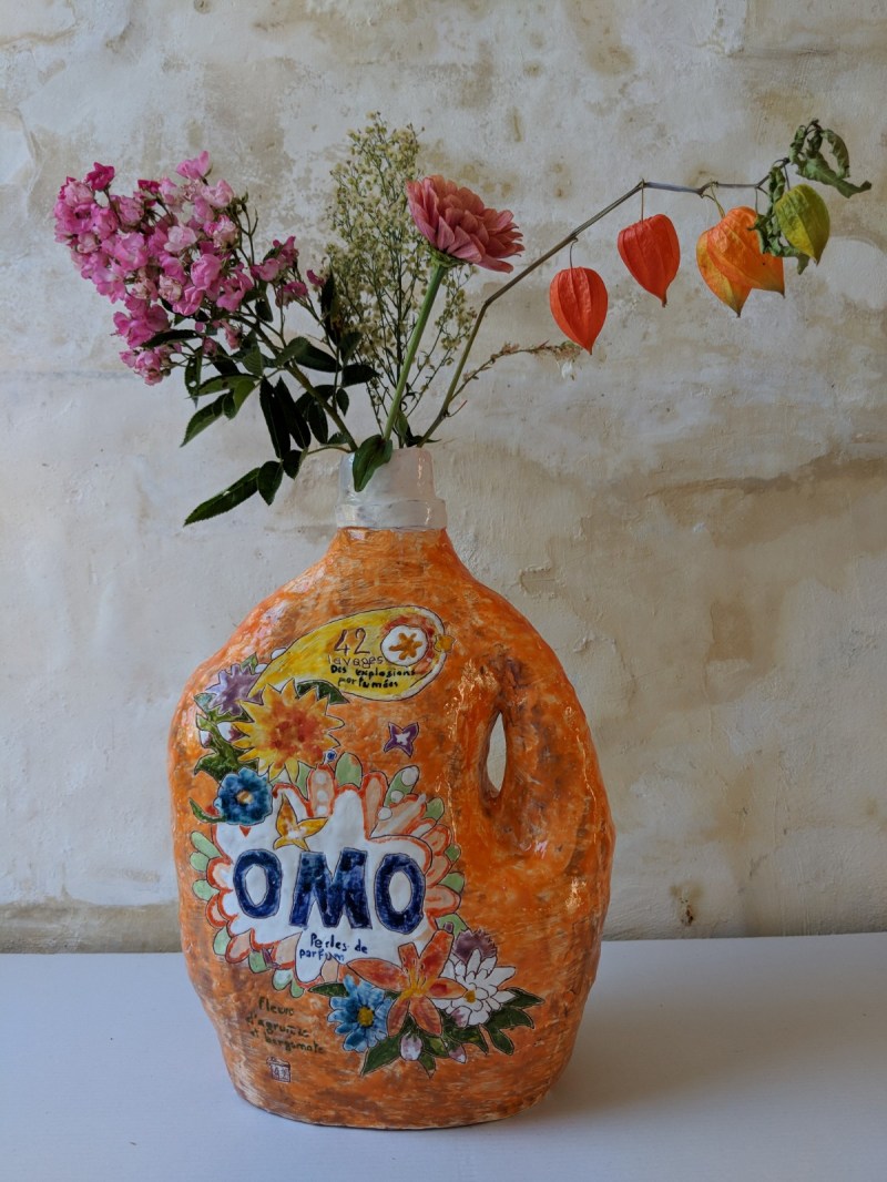 Suzanne Husky donne des formes et des matériaux au pouvoir-du-dedans. Ses œuvres traduisent une attention inquiète envers un ensemble de comportements, de décisions politiques et de dérives menant à la destruction du Vivant. Ces dérives, structurées par le système patriarcal et néolibéral, sont activées par des choix et des gestes quotidiens : faire ses courses au supermarché, conduire une voiture, faire la lessive, faire le ménage, acheter des vêtements, construire une maison ou partir en vacances. La manière dont nous agissons et consommons au quotidien comporte un ensemble de conséquences dont l’impact est plus ou moins visible, plus ou moins pérenne sur notre environnement. En ce sens, Suzanne Husky travaille à partir de bouteilles de détergent (lessives, eau de javel) et produits alimentaires (huiles). En respectant les objets originaux (formes, couleurs, textes, motifs), elle réalise ainsi des vases en faïence émaillée. Parce qu’elle utilise des terres locales, des teintures et des couleurs naturelles, l’artiste manifeste une conscience des enjeux éthiques et politiques de sa réflexion plastique. Chaque vase accueille des bouquets de fleurs sauvages qui exacerbent les paradoxes. Le champ lexical, les motifs floraux et les couleurs participent d’une séduction trompeuse : promesse d’exotisme, de senteurs rares, de bien-être, de santé et de voyage. Les représentations florales et végétales subliment les ingrédients chimiques. Le packaging truffé de contradictions mêle l’exotisme aux principes de précautions. Les logos noirs, rouges et orange présentent des flammes, des têtes de mort et autres signes de danger auxquels la grande majorité des consommateurs ne prêtent pas attention.
