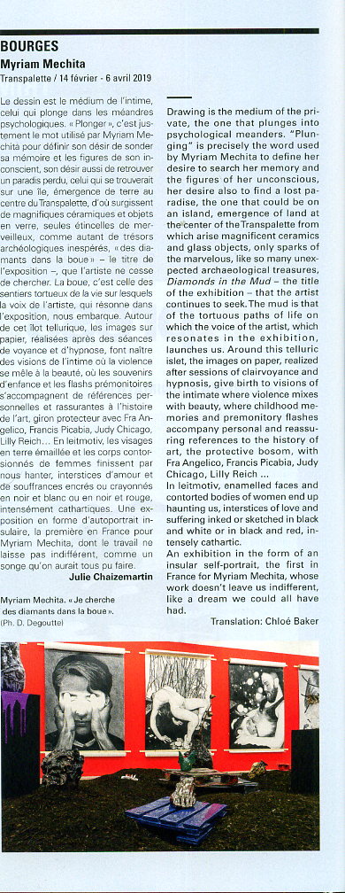 Dans les hauteurs du centre d’art, les murs sont noirs. Myriam Mechita présente des assiettes comportant des portraits et des autoportraits. L’objet domestique devient le support de révélations enfouies, de présences gênantes, de regards appuyés. Au dernier étage, la série Tu vas comprendre (2012-2018) est réunie. Les dessins rouges et noirs résultent de conversations avec une voyante. Il s’agit d’images surgissantes, d’images persistantes, d’images obsédantes. Des diamants dans la boue. Les images proviennent d’un imaginaire sans frontière : ethnologie, cinéma, histoire de l’art, éléments autobiographiques, fantasmes, actualités, références à l’Histoire. Je cherche. Dans la terre, le bronze, le verre ou à la surface du papier, Myriam Mechita représente ce qui est inscrit dans nos corps, dans nos mémoires. Elle figure les secrets, les pulsions, les dénis, les non-dits, les désirs, les peurs, ce qui dérange, ce que nous fuyons. La recherche est infinie, la boue incarne la brutalité, l’intensité, l’effroi. Les œuvres de Myriam Mechita traduisent un cri étouffé, un hurlement confiné dans un espace inconnu qui ne connaît aucune limite. Le vaste territoire d’une mémoire engourdie par le poids de violences et de souffrances transtemporelles. Le vivant est pensé dans sa globalité en dessinant des flottements entre les civilisations, les époques, les vivants et les morts, les genres, les réalités. Je cherche. Myriam Mechita sonde et regarde le Vivant avec une lucidité déconcertante. Dans les boues profondes et difficiles de nos histoires, elle cherche le merveilleux qui se cogne inévitablement à l’horreur. La beauté coexiste à la laideur, les diamants à la boue.