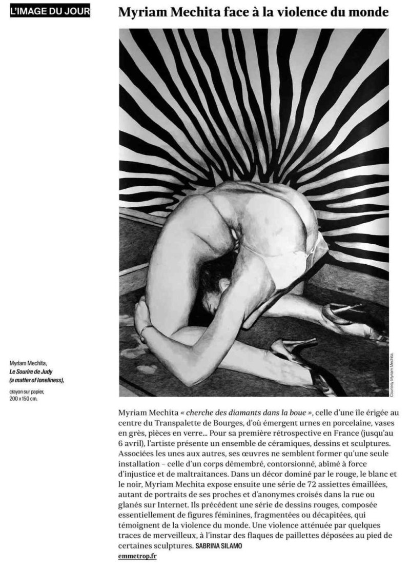 Dans une œuvre vidéo de Myriam Mechita, inspirée par Les Diaboliques de Georges Clouzot, une voix de femme, la voix d’une femme, Je cherche des diamants dans la boue. La phrase ne m’a pas quittée. Ces mots contiennent la pensée plastique de l’artiste. Son travail est là : une recherche permanente de beauté dans un monde désespérément violent. Myriam Mechita est une artiste tellurique. Ses œuvres proviennent de la boue, une matière concrète qu’elle manipule pour réaliser les œuvres en céramique (sculptures, vases, assiettes). La boue est aussi une matière immatérielle, un espace symbolique qui englobe les violences de nos existences passées et présentes. Par les dessins, les céramiques, les œuvres en bronze ou en verre, Myriam Mechita donne corps à ces violences. Les œuvres convoquent une palette d’émotions extrêmes : intensité, beauté, peur, colère, magie, merveilleux, amour, mort, bestialité, douceur, explosion, jouissance et solitude. Des émotions à la fois paradoxales et complémentaires qui nous envahissent. Je cherche des diamants dans la boue. De la terre, à la mine de graphite, du bronze, du verre, les matériaux proviennent de la terre, ils sont liés à des énergies, des propriétés physiques et chimiques, des légendes, des mythes, des récits que l’artiste mêle aux siens, aux nôtres. Elle dessine ou sculpte des corps, humains ou animaux, fragmentés, amputés, violentés. Je cherche. Les yeux noirs, un pied disloqué, une main d’enfant isolée, une tête de chien, une patte enchaînée, les membres des différents corps forment une conversation impossible. Les corps, monstrueusement magnifiques, sont les réceptacles de nos histoires, de nos héritages visibles et invisibles.