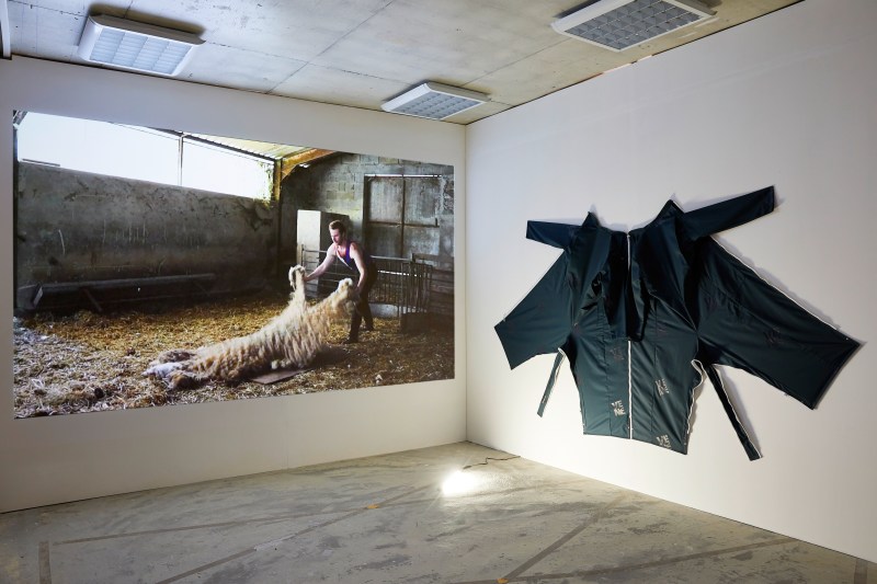Dans le second espace de la galerie sont présentées deux œuvres qui se font face : Sans titre et Champion. La première est réalisée à partir du vêtement de travail des paysans, une combinaison verte devenue commune à tou.te.s. En attachant deux combinaisons l’une à l’autre, Morgane Denzler donne à voir la métaphore d’une peau de paysan. Tels une toison ou un corps disséqué, elle est déployée au mur. En nous approchant, nous constatons que le tissu est parsemé de logos : VENE. « Viens » en Occitan, un appel traditionnel au troupeau. Morgane Denzler met en lumière les relations contractuelles et/ou de dépendance entre les pratiques intensives et l’industrie agroalimentaire. Ce système, visant à un productivisme outrancier, a conduit une large partie du monde paysan vers un état de fragilité extrême. En contrepoint, Champion (2018) présente Loïc Leygonie, tondeur professionnel de moutons, mais aussi champion de France de la tonte. Dans le Lot, Morgane Denzler a filmé un jeté de toison, qui, lors d’un concours, est noté par un jury selon les critères très précis. Diffusée sous la forme d’un GIF, la vidéo forme une boucle, un élan vital qui manifeste le déplacement des gestes et des savoir-faire. La tonte, acte nécessaire à la survie du mouton, est aussi devenue un sport, un rituel collectif où les gestes de travail trouvent de nouvelles résonnances.