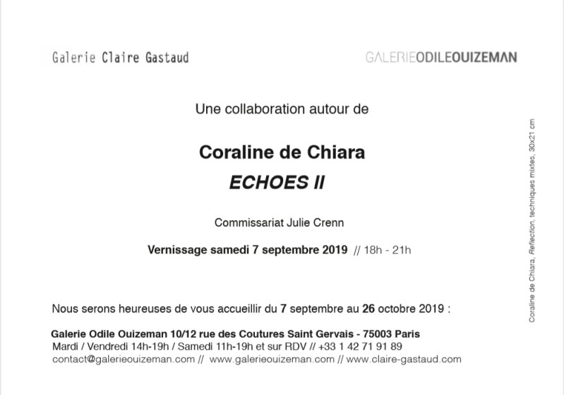 Après avoir accueilli Echoes dans son espace de Clermont-Ferrand, la galerie Claire Gastaud rejoint la Galerie Odile Ouizeman pour une nouvelle collabaration autour de l’artiste Coraline de Chiara.