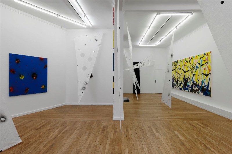 Noël Dolla a longtemps pratiqué l’escalade. « Perché au plus haut de la falaise, on regarde parfois ses pieds avec le désir de voler. »1 Il s’agit alors de se dépasser – physiquement et psychologiquement – dans l’ascension, d’accepter la part d’inconnu inhérente à l’aventure, « de ne jamais faire marche arrière et d’essayer d’éviter le repentir. » Le jeu, la contrainte et l’expérimentation sont des outils pour toujours parvenir à bousculer les codes établis, pour déconstruire le bon ordre calme et rassurant, pour désobéir afin que la peinture ne s’évanouisse pas silencieusement entre le rideau, la table basse et le canapé.