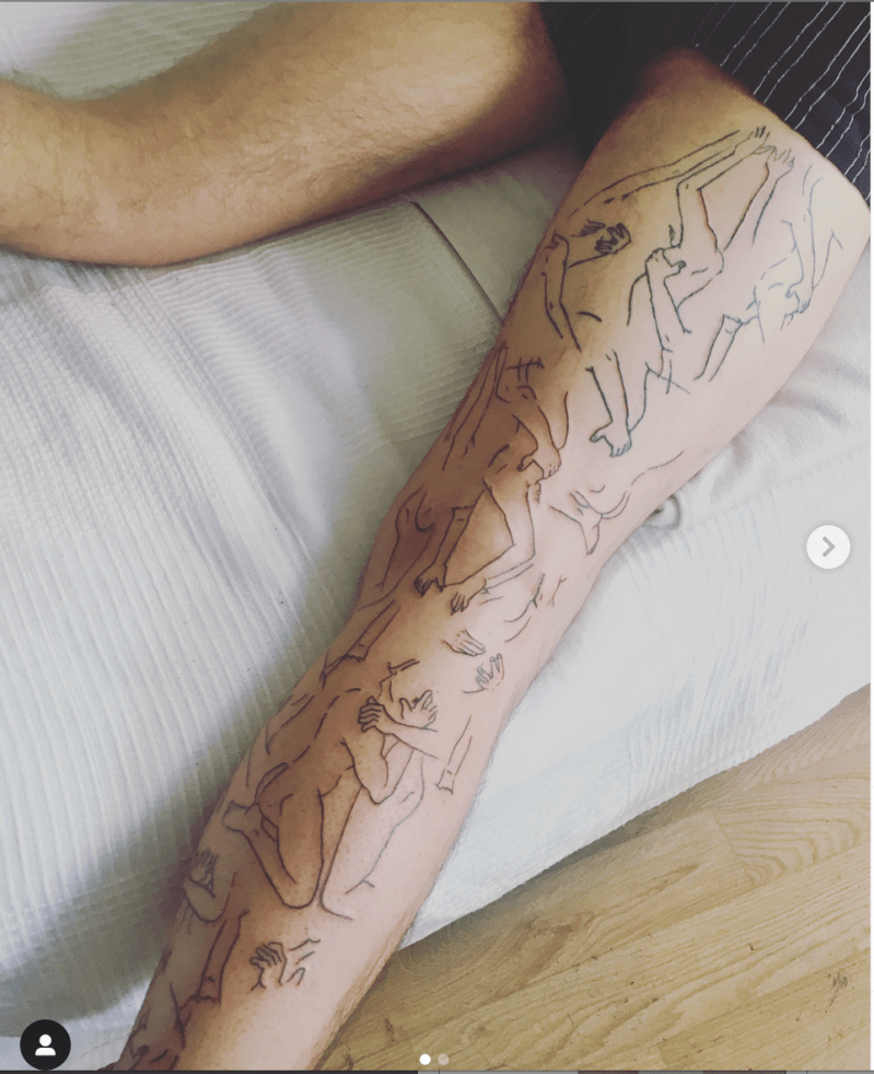 Très tôt elle commence par écrire et dessiner. Dans un petit carnet, elle figure l’intimité de corps, le sien, ceux des autres. Chaque jour, comme un rituel, elle réalise un dessin érotique. Le trait est graphique. Le dessin est une écriture à part entière. Une écriture des corps. « Un safe place pour moi ». Avec une totale liberté, l’artiste y traduit en effet une conscience de son corps, de ses désirs, de ses fantasmes et de ses envies. « J’invoque les choses pour qu’elles existent. » Au fil du temps, la vision personnelle devient collective puisqu’elle a créé des groupes de discussions sur les réseaux sociaux afin de récolter les témoignages d’autres femmes. Ensemble, les dessins forment un journal non idyllique de corps et de désirs pluriels. Des carnets, aux feuilles de papier, les dessins sont transposés aussi sur les corps. Safia Bahmed-Schwartz tatoue à même les peaux des dessins préexistants ou bien de dessins pensés avec l’autre. L’acte indélébile génère selon elle un empowerment « dans la douleur, la confiance et l’érotisation ». Parallèlement, l’artiste expérimente la peinture sur toile, sur tissu ou sur papier. Elle participe à des sex parties durant lesquelles elle prend des notes et réalise des croquis. « La nudité n’y est pas obligatoire, je n’ai vu aucun corps complètement nu. Ce qui, d’un point de vue systémique, est d’ailleurs intéressant : sexe n’est pas égal à nu, et nu n’est pas égal à sexe. »[1] Il s’agit pour elle de documenter des moments éphémères où différentes formes de corps et différentes formes de sexualités cohabitent dans un même espace-temps. En résultent des fresques et des tableaux où les corps s’entremêlent sans distinction de genre, d’âge, de race ou de classe. L’orgie devient le lieu de l’intersectionnalité, d’une liberté sans borne et sans norme. Les corps nus et graphiques n’y sont pas identifiables, pas catégorisables. Les peintures sont réalisées à partir de deux couleurs, l’outremer et le blanc, pour annuler les binarités et au contraire visibiliser la pluralité des corps. « Quand je dessine un couple, par exemple une femme noire et un homme blanc, c’est noir et blanc, trop manichéen. » Par ailleurs, le bleu et le blanc participent de l’idée du souvenir, de l’archive, d’une persistance de la mémoire. Si les dessins et les peintures ont une existence autonome, Safia Bahmed Schwartz transforme leur échelle pour leur donner une forme spatiale au moyen de fresques ou de décors permettant une expérience physique des œuvres.