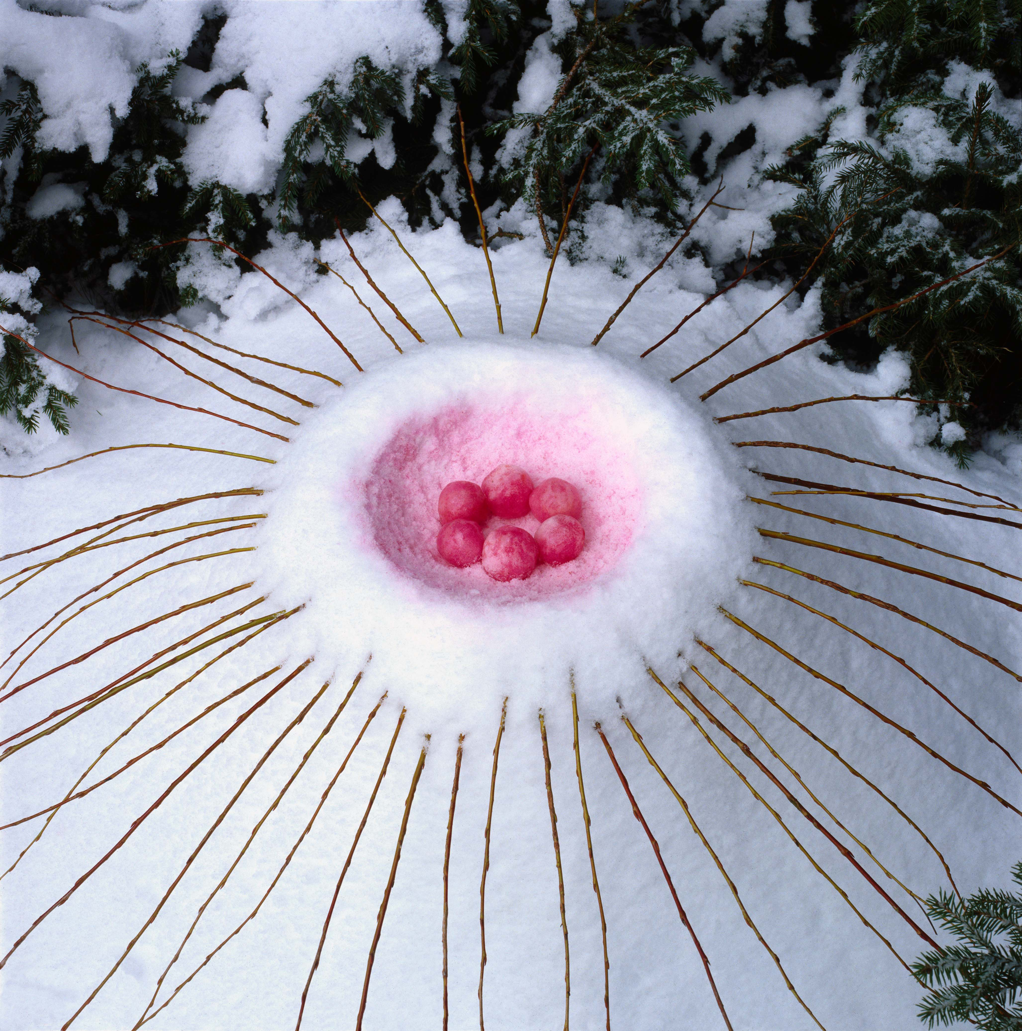 6.Nid de Neige, haute bavière, 1993,neige, baguettes de saule, boules de neige colorées avec du jus de baies d’orbier, courtesy galerie-gastaud.com