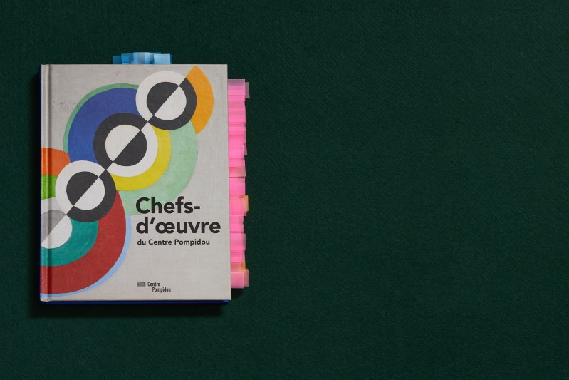 « Ce n’est pas une seule page qui manque dans les livres d’une histoire de l’art qui serait concrètement collective et inclusive. J’ai choisi cet ouvrage publié en 2017 qui présente une petite partie de la collection du Centre Pompidou. Le choix des « chefs-d’œuvre » est symptomatique de la pensée patriarcale. Symptomatique d’une histoire de l’art écrite et formée par les dominant.es. Une histoire excluante. Alors, j’ai placé des marques pages roses aux œuvres des hommes, des marques pages bleus aux œuvres des femmes. L’écart est visuellement flagrant. Si ma mémoire est bonne, seulement six marque-pages bleus. Alors, il va nous falloir quitter la pensée binaire pour écrire notre histoire de l’art où tous les corps s’extraient enfin de l’invisibilisation et du silence : racisés, queer, trans, intersexes, gros, précaires, invalides, malades, féministes. »