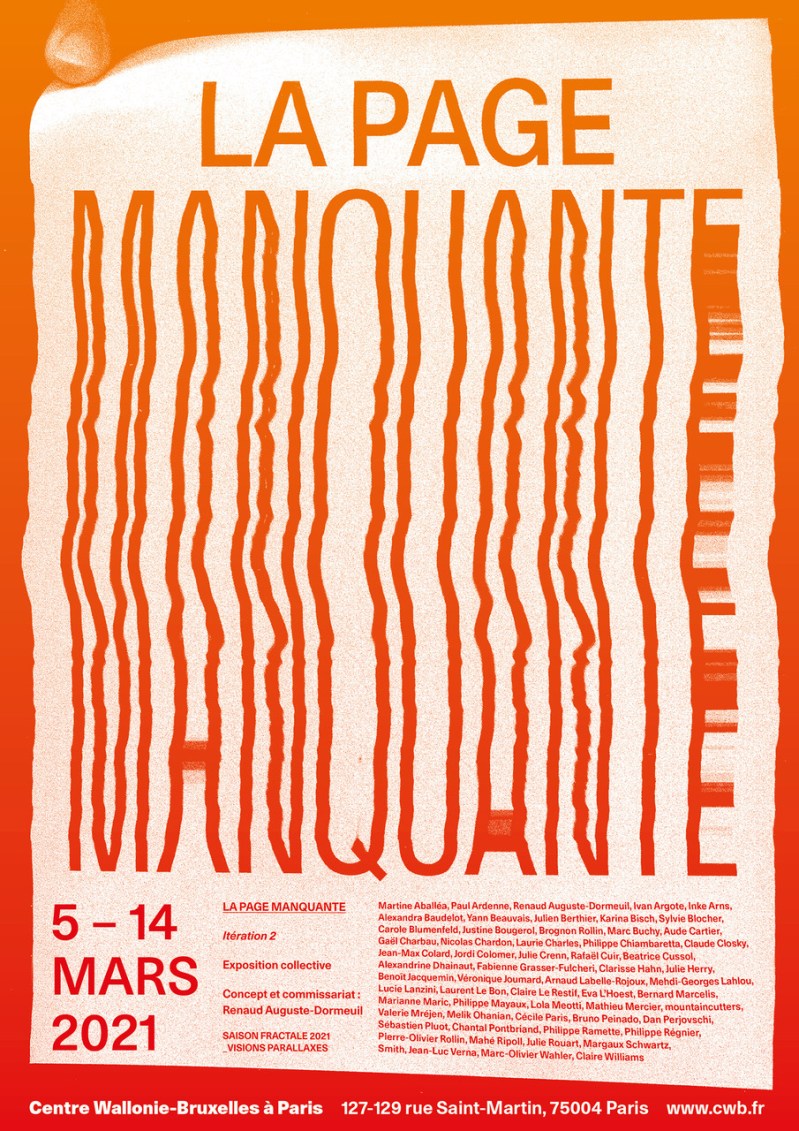 A la faveur de sa Saison Fractale_Visions Parallaxes – paramétrée par la valeur heuristique du désordre et de la dynamique de la théorie du chaos, le Centre Wallonie-Bruxelles/Paris vous convie à une itération – en mode belgo-français – du projet La Page Manquante, implémenté par Renaud Auguste-Dormeuil en 2019 au Musée des Moulages de l’hôpital Saint-Louis à Paris en collaboration avec Marc-Olivier Wahler. Pour ce second opus, des plasticien.ne.s basé.e.s en Wallonie, à Bruxelles et en France y sont convié.e.s.