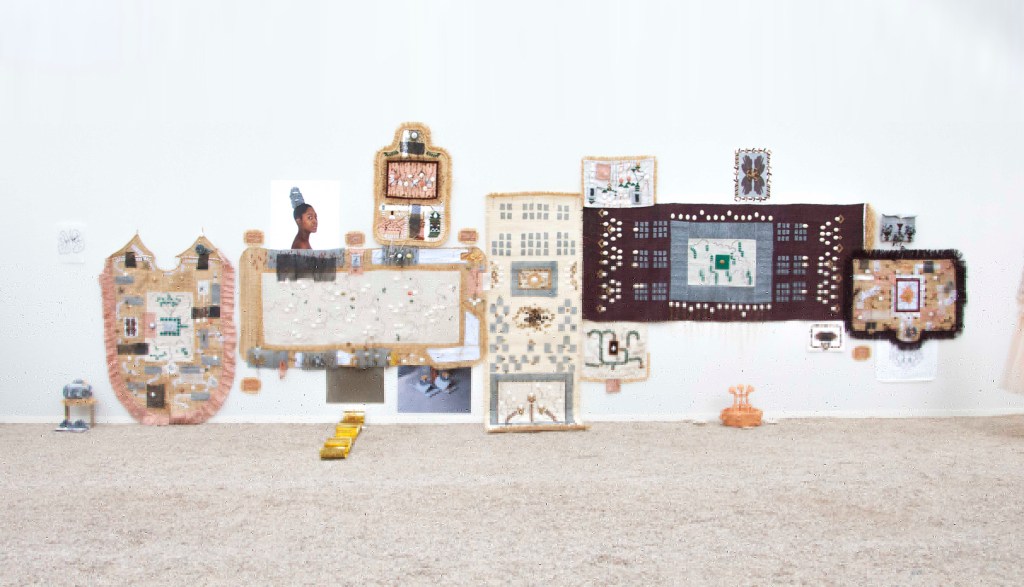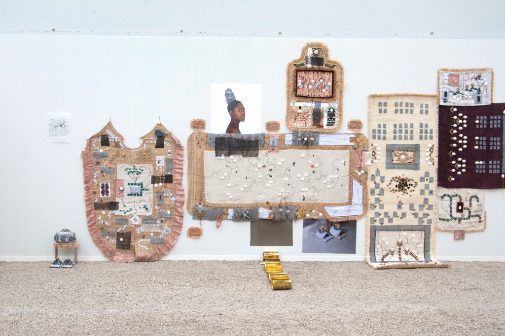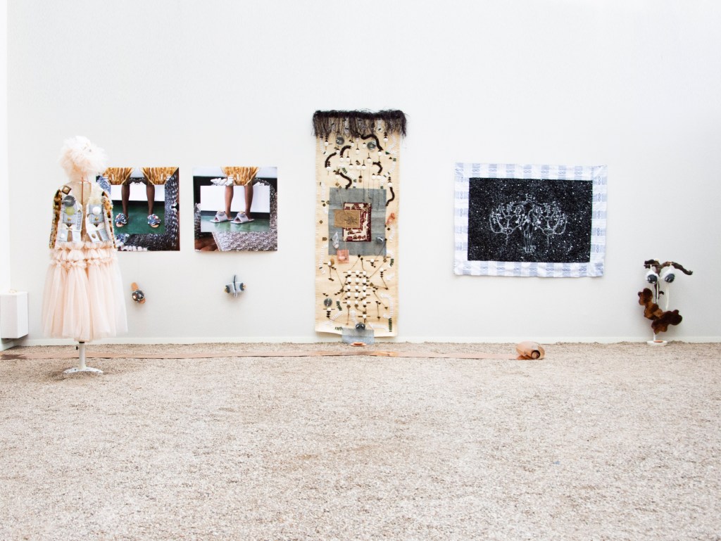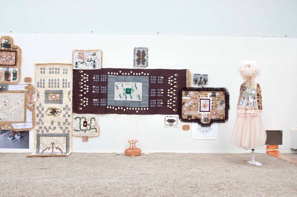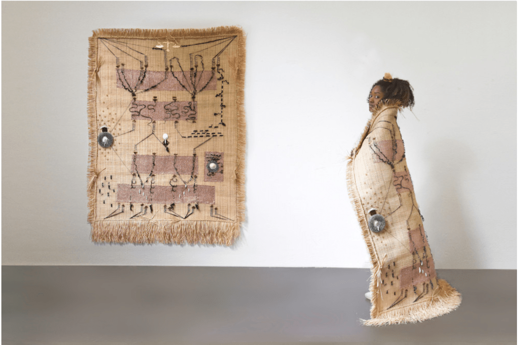 Les formes issues des objets du Dja sont moulées dans le plâtre ou bien découpées dans différents matériaux. Elles sont connectées les unes aux autres par des matières conductrices (notamment du cuivre), des fils brodés ou bien des assemblages. Les vêtures, à la fois tentures, sculptures et vêtements performatifs, comportent aussi des éponges métalliques qui servent à récurer. Leur présence à la fois familière et étrange, fait écho au travail domestique, au travail invisible des femmes. L’éponge, chargée d’assignations patriarcales, est ici réemployée pour sa brillure, sa dangerosité et sa préciosité. Les vêtures contiennent la créolisation, les corps, les voix, les déplacements, les violences, les transformations, des nomades, des exilées, des errant.es, des invisibilisé.es dont l’artiste nous donne à voir et à entendre. « Le différent, et non pas l’identique, est la particule élémentaire du tissu du vivant, ou de la toile tramée des cultures. »[5] Les récits de leurs histoires maillées, entremêlées sont activés et incarnés par la performance. Le corps de l’artiste revêt, relie, traverse, cultive, touche, caresse, transmet, s’irrite, avance, scande et se tient debout. Elle transmet et transcende à la fois les fragments d’une mémoire immémoriale et les manifestations archipéliques d’un corps présent.