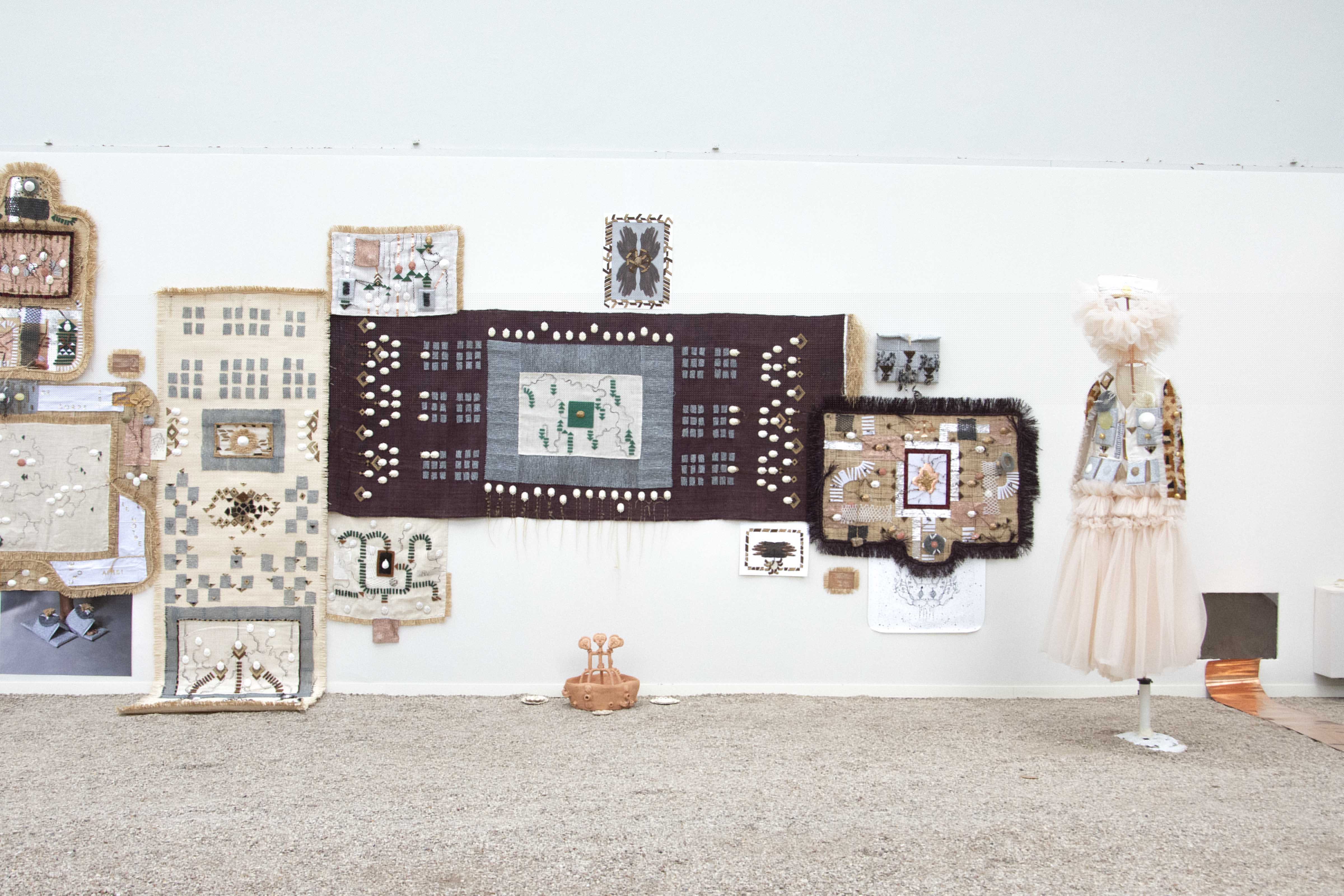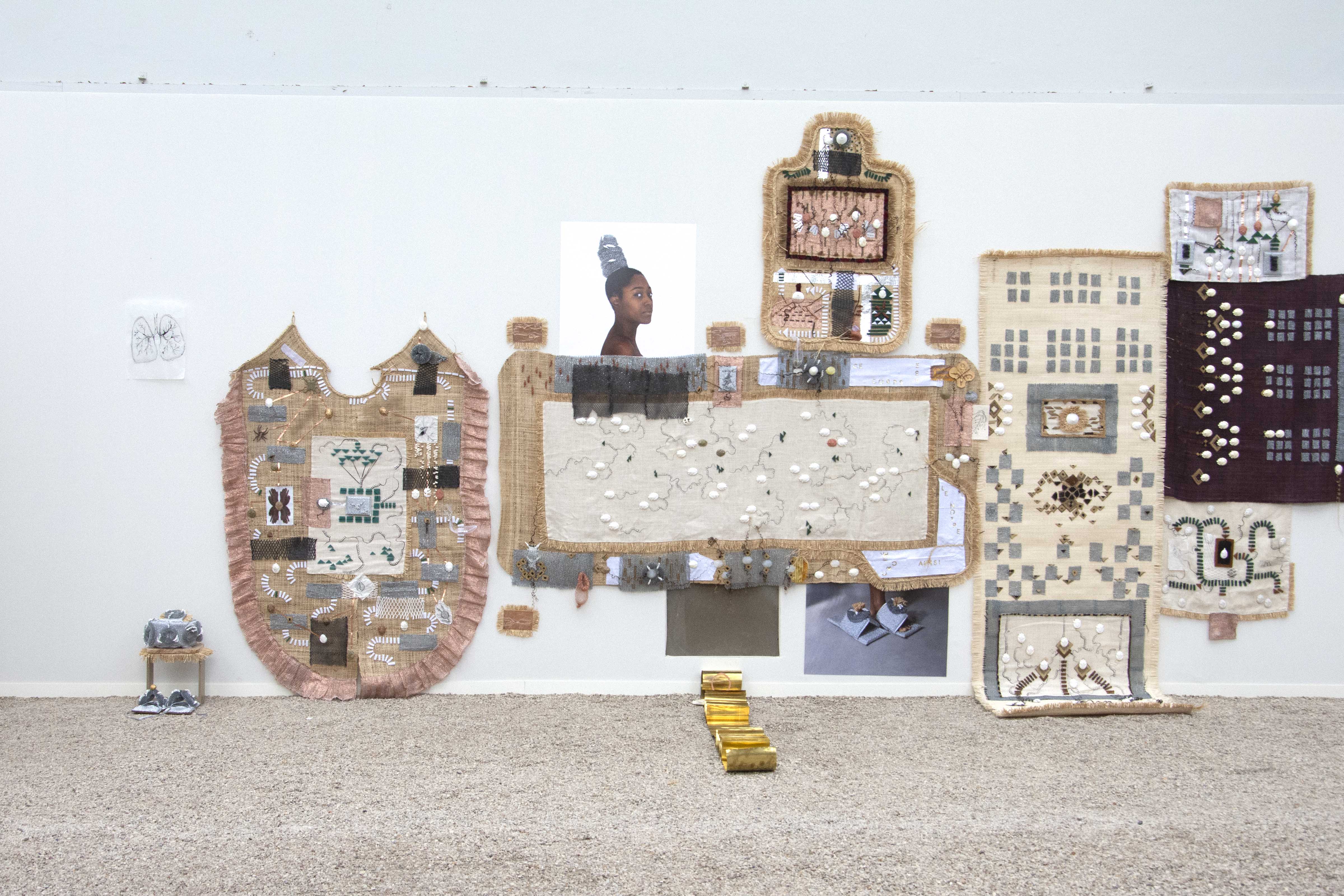 Les formes issues des objets du Dja sont moulées dans le plâtre ou bien découpées dans différents matériaux. Elles sont connectées les unes aux autres par des matières conductrices (notamment du cuivre), des fils brodés ou bien des assemblages. Les vêtures, à la fois tentures, sculptures et vêtements performatifs, comportent aussi des éponges métalliques qui servent à récurer. Leur présence à la fois familière et étrange, fait écho au travail domestique, au travail invisible des femmes. L’éponge, chargée d’assignations patriarcales, est ici réemployée pour sa brillure, sa dangerosité et sa préciosité. Les vêtures contiennent la créolisation, les corps, les voix, les déplacements, les violences, les transformations, des nomades, des exilées, des errant.es, des invisibilisé.es dont l’artiste nous donne à voir et à entendre. « Le différent, et non pas l’identique, est la particule élémentaire du tissu du vivant, ou de la toile tramée des cultures. »[5] Les récits de leurs histoires maillées, entremêlées sont activés et incarnés par la performance. Le corps de l’artiste revêt, relie, traverse, cultive, touche, caresse, transmet, s’irrite, avance, scande et se tient debout. Elle transmet et transcende à la fois les fragments d’une mémoire immémoriale et les manifestations archipéliques d’un corps présent.