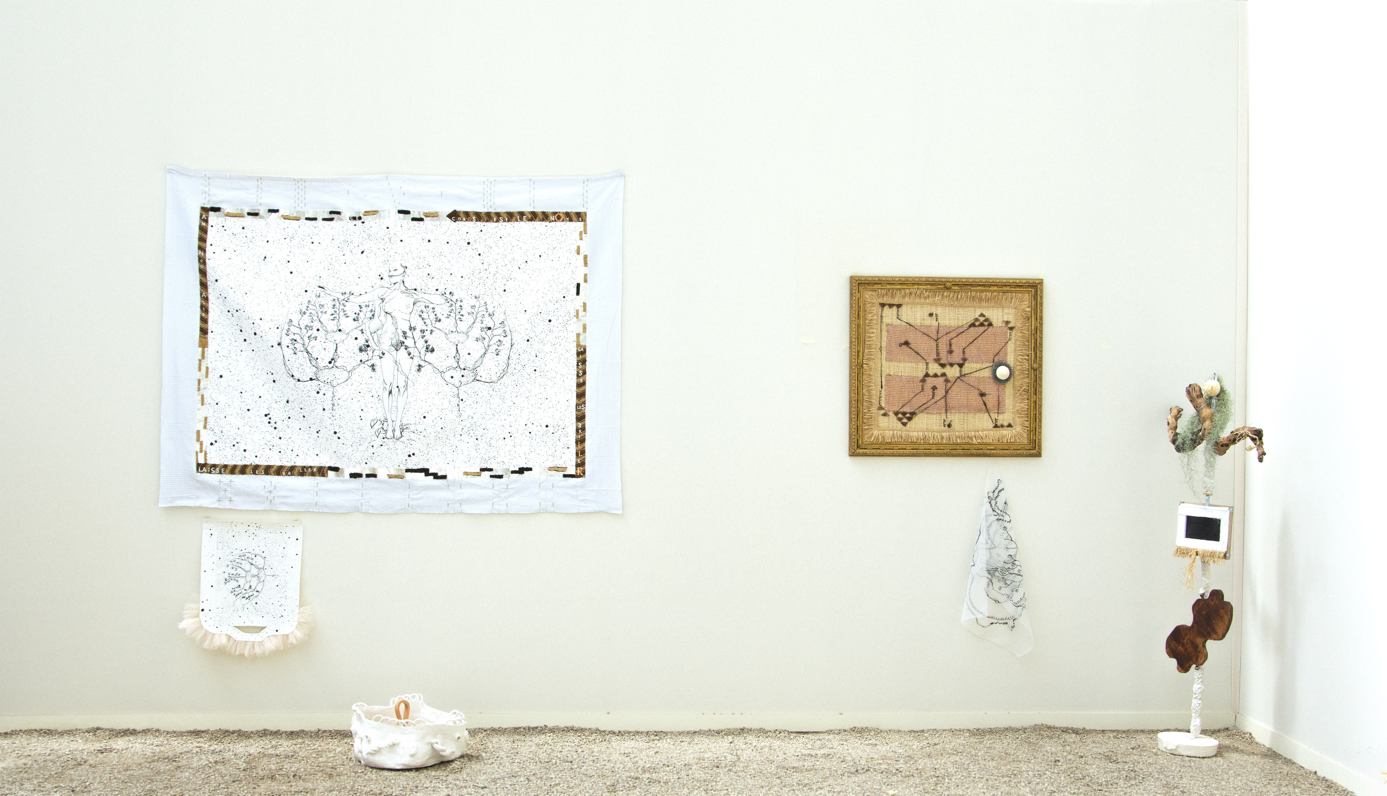 « Mes racines s’enfoncent dans les profondeurs du monde, à travers l’argile sèche et la terre humide, à travers les veines de plomb, les veines d’argent. Mon corps n’est plus qu’une fibre. Toutes les secousses se répercutent en moi, et le poids de la terre presse contre mes côtes. »[6] Entité vivante, humaine, végétale, cosmique, organique, Marie-Claire Messouma Manlanbien déclame les récits pluriels d’une histoire contée en étendue qui remonte loin dans le passé et qui s’étend au futur. Les œuvres polysémiques manifestent la nécessité de comprendre et toucher ces temporalités qui nous dépassent, ces géographies archipéliques, ces cris physiques et ces alliances infinies entre ce que nous voyons, ce que nous recueillons et que ce que nous pressentons. L’artiste délivre une poésie politique, sensible, secrète et spirituelle qui nous rappelle à l’en commun pour nous défaire des pensées de la déliaison. « C’est une invitation à sortir de l’entre-soi pour prendre le large, comme condition de notre survie collective. »[7] Les œuvres présentées ensemble constituent le tissage magnétique et composite d’une pensée en constante métamorphose. Entre et parmi les trames de l’espace et du temps, le corps navette de Marie-Claire Messouma Manlanbien déploie un tissage en mouvement.