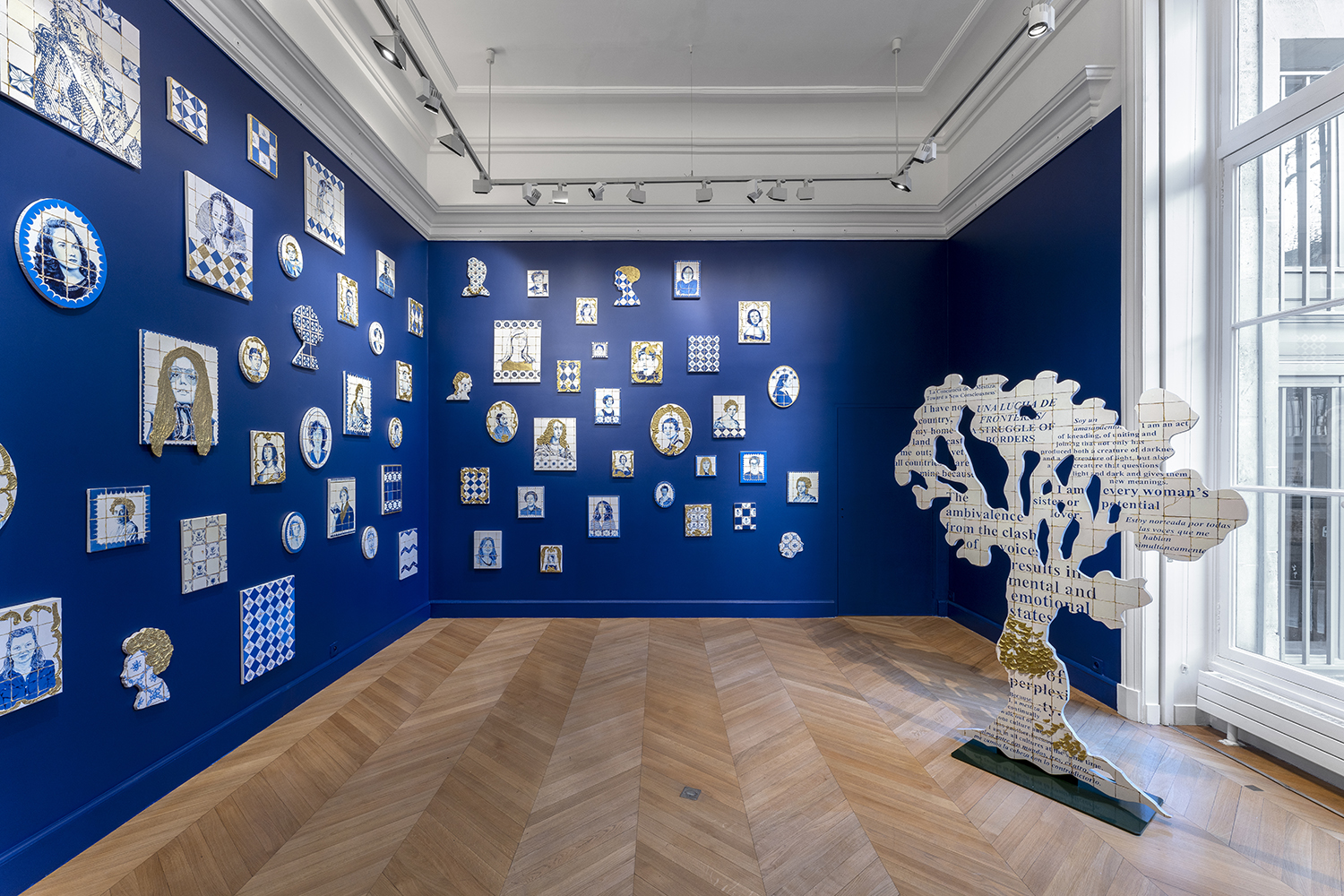 À partir d’aires culturelles plurielles, Alicia Paz puise aussi bien ses références dans le domaine des arts décoratifs (tapisserie, papier peint, assiettes de Delft, azulejos, joaillerie…), que dans les livres d’histoires, les dessins botaniques ou encore les cartes géographiques et maritimes. Elle peint sur toile des portraits de femmes. Qui sont-elles ? Des femmes qui comptent pour Alicia Paz. Des femmes qu’elle admire, qui l’ont soutenu, qui l’inspirent ou qui la bouleversent. Elles sont ses amies, des membres de sa famille, des femmes anonymes et des femmes célèbres (femmes politiques, scientifiques, poétesses, autrices, théoriciennes, militantes, chanteuses, artistes…). D’un portrait vers un autre apparaissent Nina Simone, Sor Juana Inés de la Cruz, Virginia Woolf, Marie Curie, Sonia Delaunay, Elvia Carrillo Puerto, Rosa Luxemburg, Angela Davis, Ana Mendieta, Billie Holiday, Olympe de Gouges, Phillis Wheatley, Rosario Castellanos, Mary Shelley, Anna Julia Cooper, Esperanza Brito, Audre Lorde et bien d’autres. Alicia Paz réunit des femmes issues d’époques, de cultures, de classes et de géographies différentes. Ensemble (juntas) elles sont les actrices de leur propre histoire (herstory). Au sein d’une pensée plastique organique et située, Alicia Paz rassemble les géographies, les temporalités, les expériences et les luttes des protagonistes représentées. Loin d’une éternelle représentation patriarcale où les femmes sont envisagées comme des objets, sensuels, silencieux et dociles, ici, les femmes s’expriment activement et revendiquent une histoire partagée.