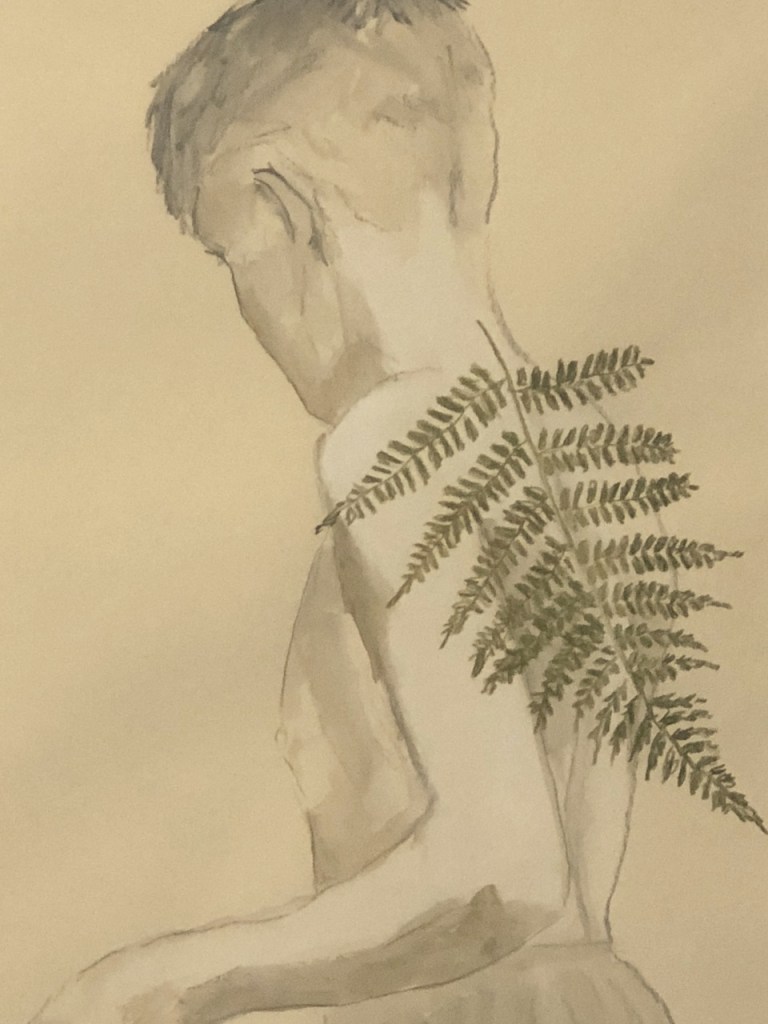 Le dessin ne porte pas de titre. Aucun indice ne nous est donné. Nous voyons une très jeune personne, un enfant sur le chemin de l’adolescence. Le corps chétif est en mouvement, il nous retour le dos ou bien s’apprête à se retourner vers nous. Son dos est surmonté d’une grande feuille de fougère. À la manière d’une aile – celle d’un ange – le jeune humain se végétalise. La tige de la fougère prolonge sa nuque délicate. Comme nous pouvons l’observer dans plusieurs autres œuvres d’Edi Dubien (né en 1963, vit et travaille entre Vendôme et Paris), l’enfant appartient pleinement au domaine du vivant. Il y existe en alliance symbiotique avec les différents règnes : minéraux, végétaux, animaux. Les corps mêlés y sont souvent en transition dans la fabrication de nouvelles alliances vivantes.