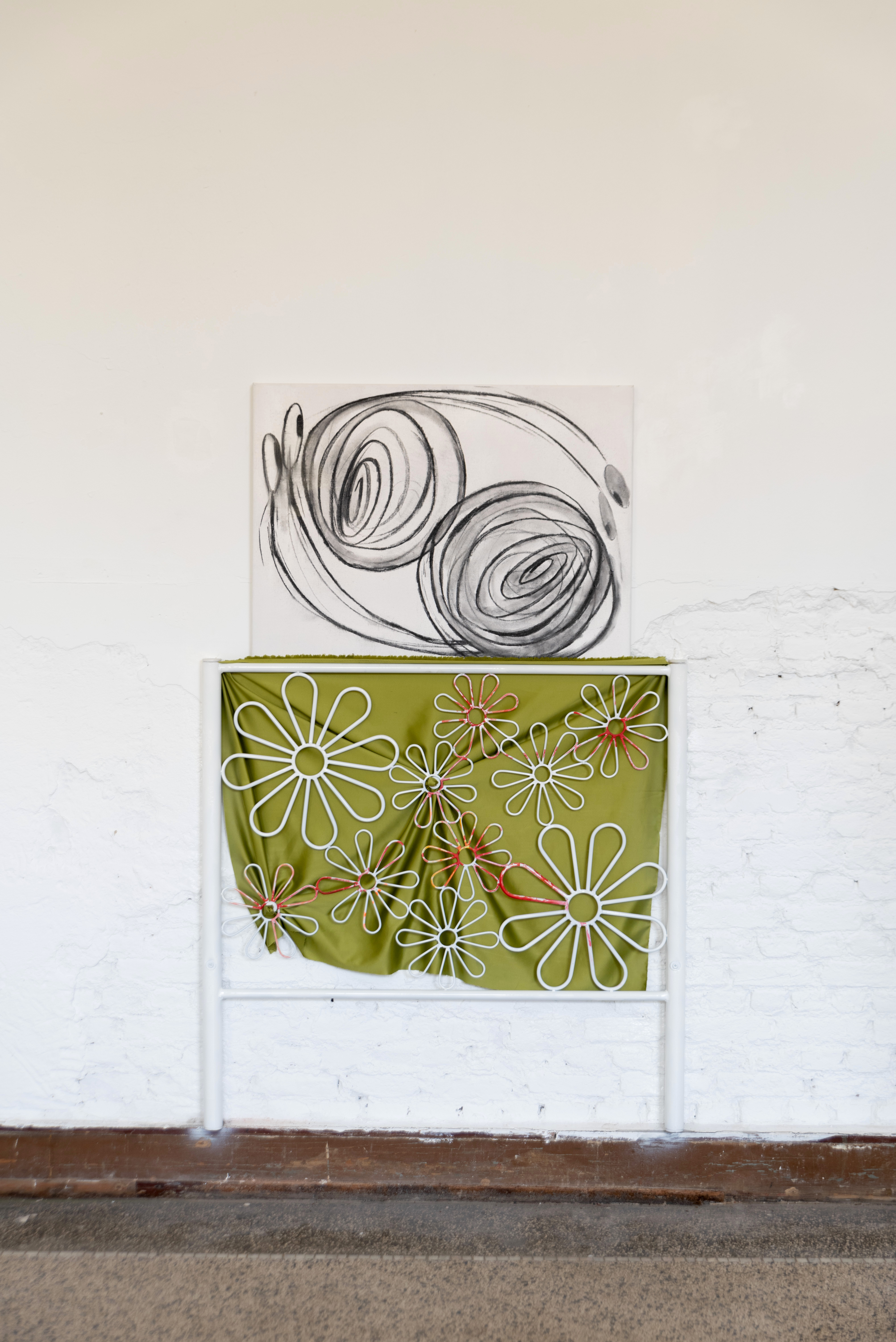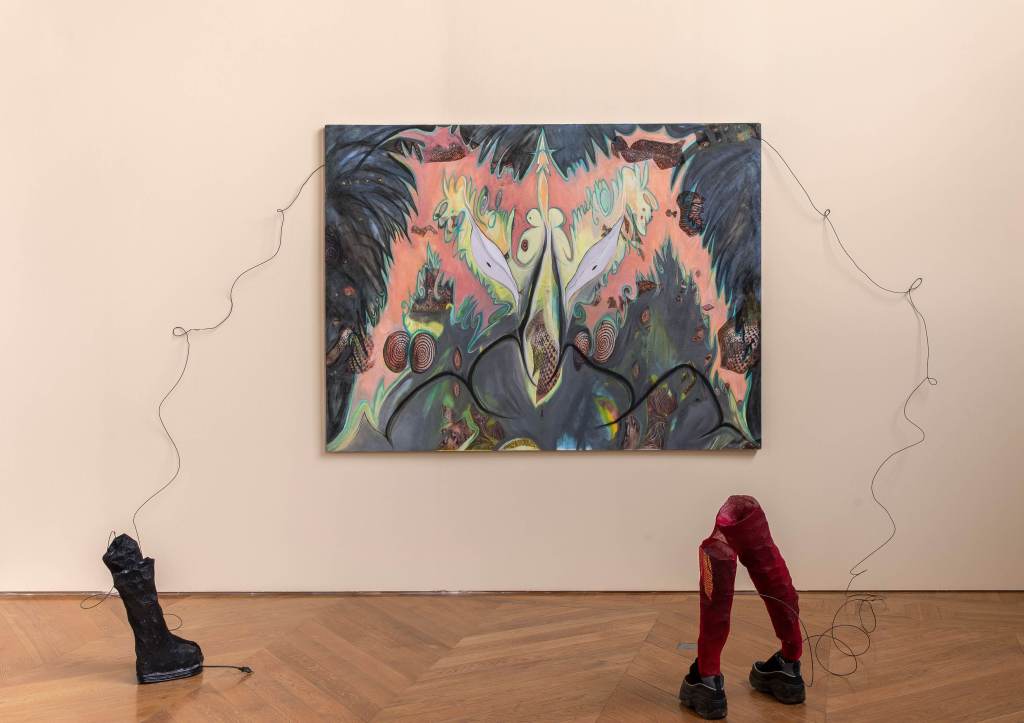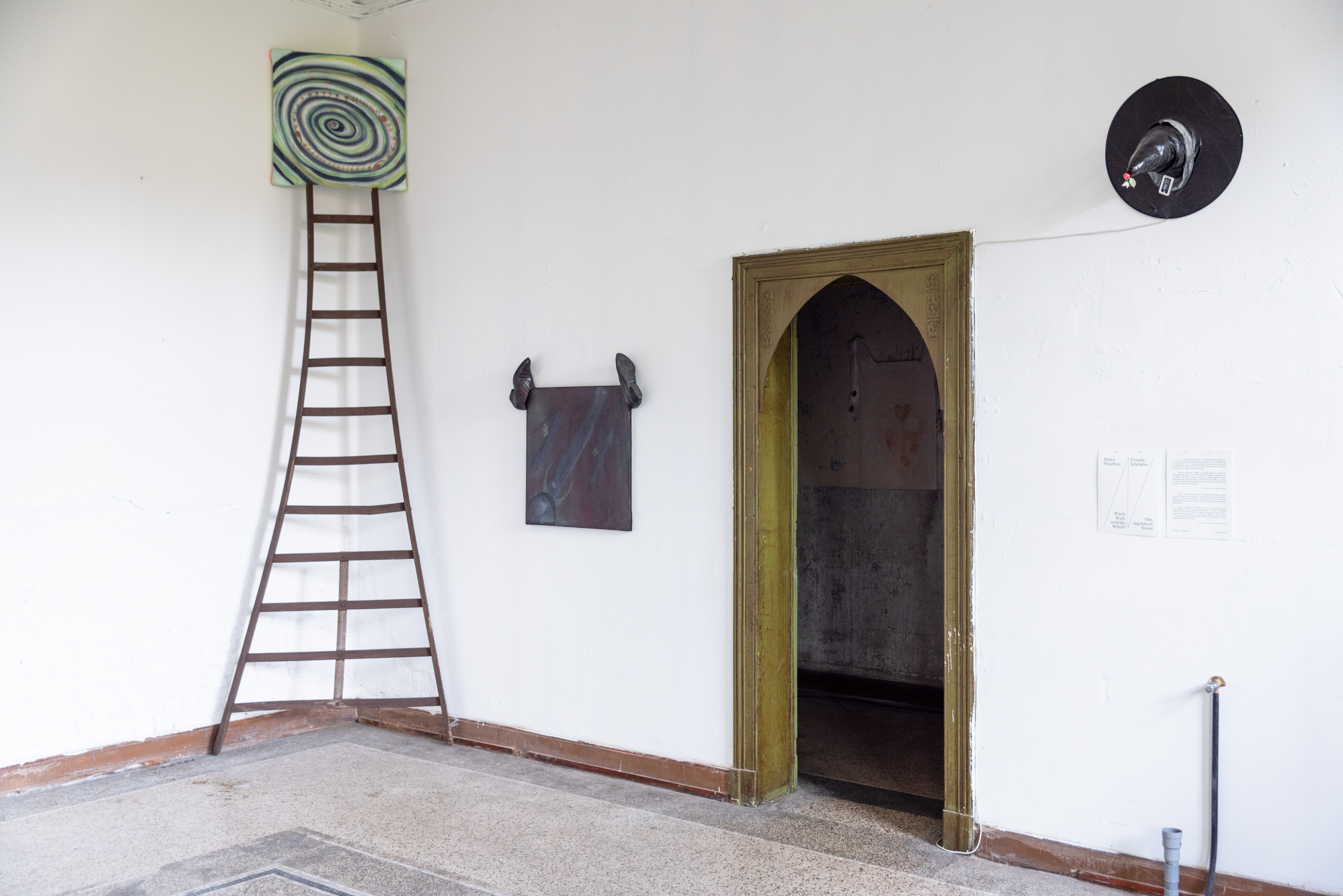 Les peintures et les installations picturales d’Hatice Pınarbaşı incarnent une langue étrange peuplée de signes récurrents : des motifs végétaux, des lettres romaines, des yeux, des escargots, des spirales, des vêtements ou encore des chaussures. Cette langue est physique, elle prend l’espace, du sol aux murs sans oublier les airs. Peinture sur objets, peinture sur tissus, tissus peintures, cartons colorés, motifs dessin. Rien n’est sacralisé. Tous les éléments sont pensés en relation pour tendre vers une oralité des formes, des couleurs et des signes. L’artiste fabrique une langue squatteuse, bavarde, quasi inaudible, faussement indélicate. Une langue performative au creux de laquelle Hatice Pınarbaşı crypte un récit autobiographique situé, critique et magique.