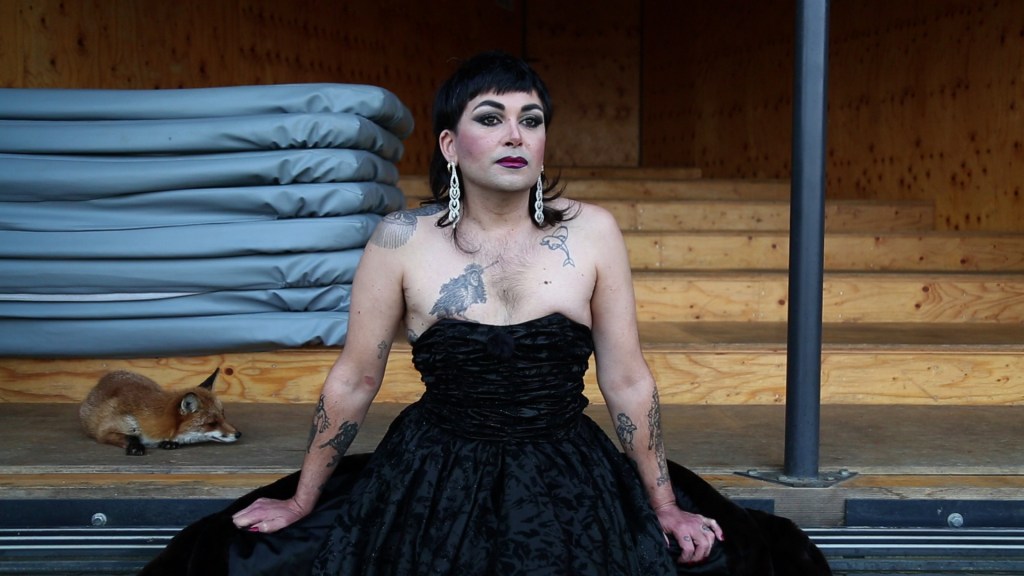 Alors, approchons-nous des fauves. Nous nous trouvons tout près de la ville. On entend les klaxons, les moteurs, le bruissement constant des machines. Comme sur une île. Un territoire entouré d’eau – peuplé d’animaux désirants. Des créatures sauvages et domestiquées. Aucun danger les un.es envers les autres. La cohabitation est paisible et tendre. L’eau, les arbres, la végétation et les chants des oiseaux lient les créatures. Un grizzli, des humain.es, un loup blanc, un renard, des rapaces, un cheval, des moutons, un louveteau. Ensemble et séparés, elles vivent des moments intenses. Les attitudes sont bienveillantes et distantes. Entre les silences, elles déclament des récits poétiques, des histoires d’amour, des chagrins nourris d’attirance et de regrets. T’embrasser le dos. Les créatures sont liées à d’étranges abris. Des architectures singulières pour des corps singuliers. Une maison nuage. Une bergerie. Un refuge coquillage. De la mélisse pour l’apaisement. Du sel rose pour la purification. Ouvertes à toustes, les petites maisons abritent une faune qui semble recluse. Comme isolée du reste de la société urbaine et vrombissante. Des corps invisibilisés, voire inacceptables. Is he willing, can he play? Des loups. Des corps travestis. Un grizzli. Des corps jugés nuisibles par une pensée humaine rétrograde et mortifère. Ici, ielles évoluent sereinement. Les pattes dans l’eau, le visage au soleil. Les créatures désirantes nous racontent les complexités des sentiments amoureux. Les violences et les beautés des amours. Et si tu crois un jour que tu m’aimes, viens me retrouver. Pense à moi.