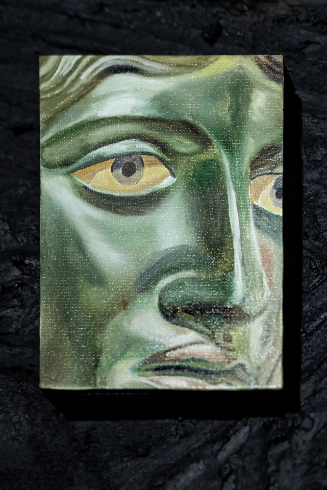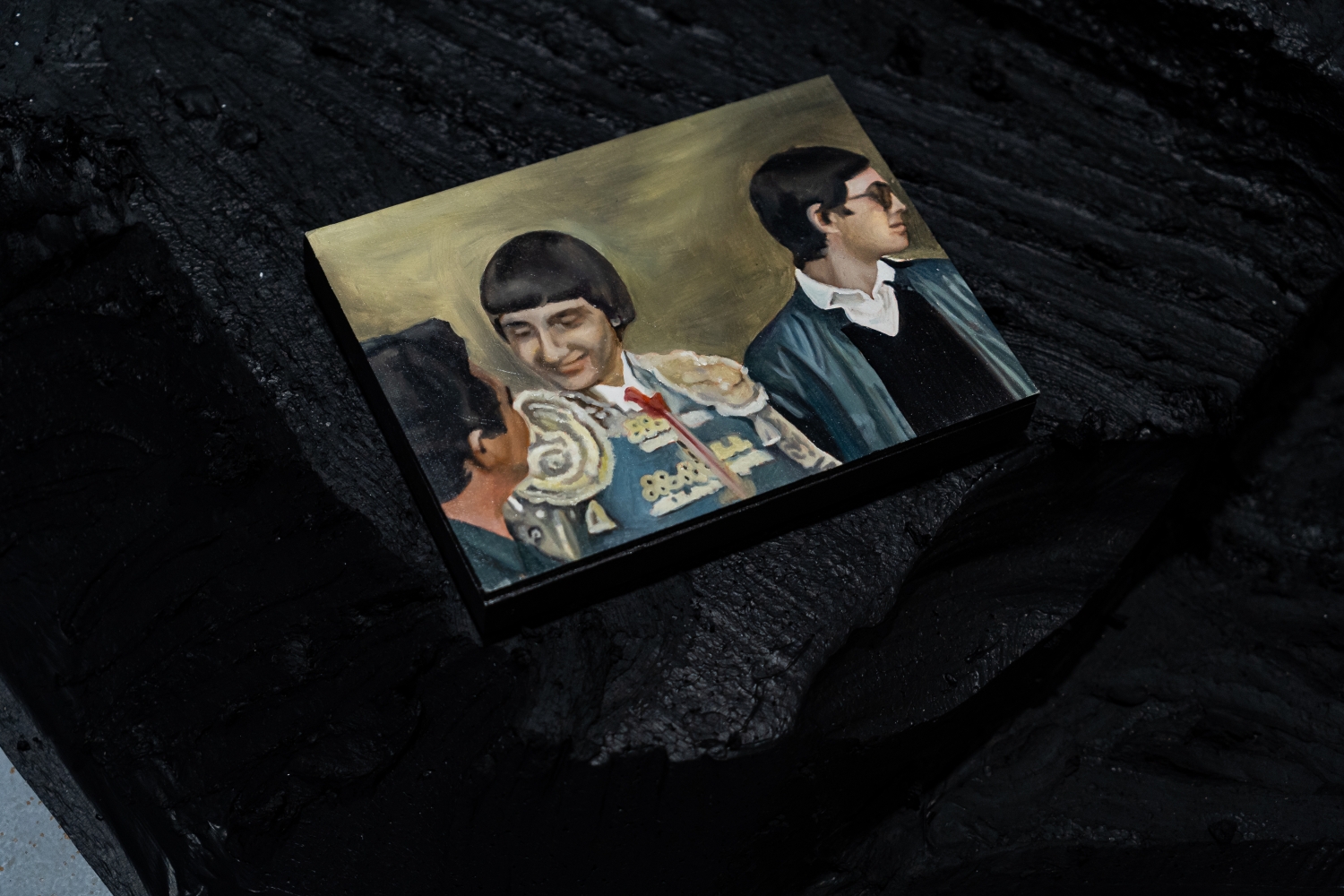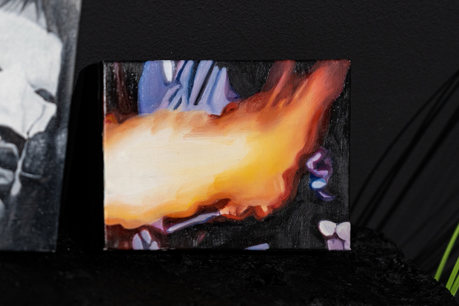 It is the compost by which it becomes possible for us to dream the obscure, to think beneath flesh, beneath surfaces and appearances. ‘What we believe shapes the world.’ In the exhibition space as in the painting surface, the artist sculpts the black paste with her fingers to form swampy areas, riptides, torrents, paths or even mounds. She looks for what is buried, everything that is difficult for us to say or to show. The mounds, hillocks of black paste, conceal what has been buried. Graves, buried cities, swallowed up by the earth and by time. On the canvas, Chloë Saï Breil-Dupont buries elements beneath black paste. Like tightly-closed chests, the paintings contain an obscure part, an invisible part. Starhawk, a Californian witchand ecofeminist activist, speaks of the inner power: ‘Yes, the inner power is the power of the low, the dark, the earth; the power that comes from our blood, our lives, and our passionate desire for the living body of the other.’² Chloë Saï Breil-Dupont manifests through painting this ‘passionate desire for the living body of the other’. A desire freed from binary and alienating thoughts. A desire generated by a vital impulse that leads her to a deep encounter with the other, that guides her as much towards darkness, rich in dissimulations and troubles, as towards a light, a colour, a ‘meta-surreal’ interior of the individuals whose lives she explores. So perhaps the artist manages to manifest some of the inner power of those she chooses to represent. She also speaks of the ‘fire from within’. The portraits challenge certitudes, fixities and rigidities in order, on the contrary, to present individuals in becoming, beings in movement who evolve within an ecosystem, which also occurs over a long period of time, invariably mutating and becoming an ancestral metamorphosis of the living. ‘And, little by little, extend a map. Make the rest disappear. Not to pronounce any more in order to forget. Then pronounce only what is sure and move forward by feeling with the throat to pronounce a little more.’