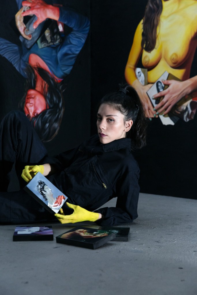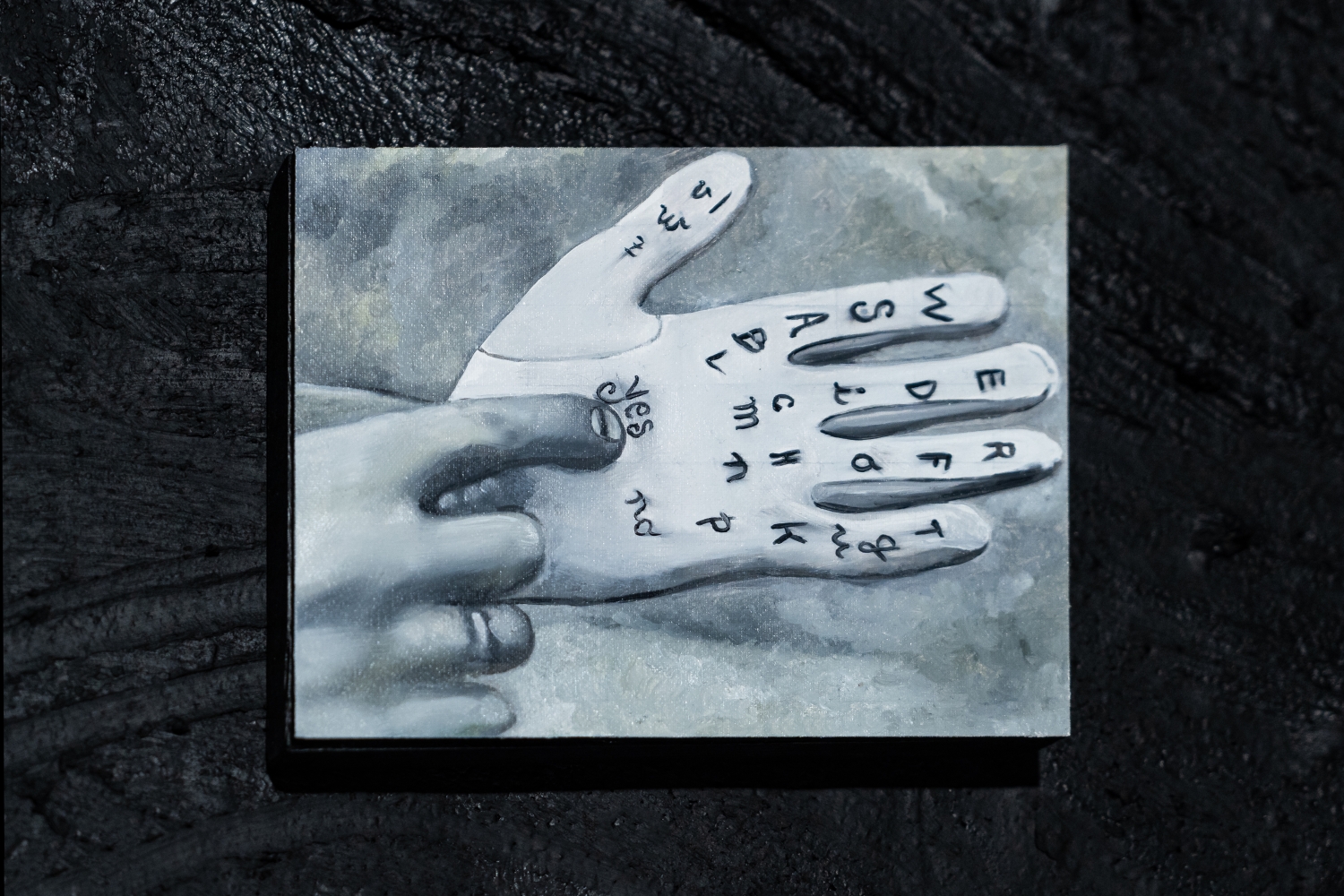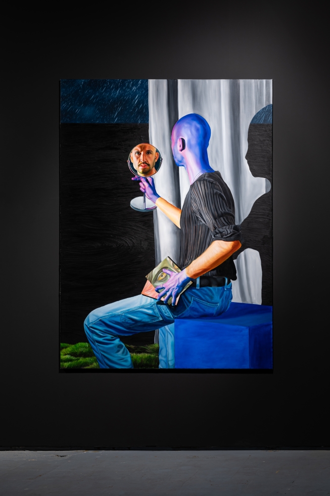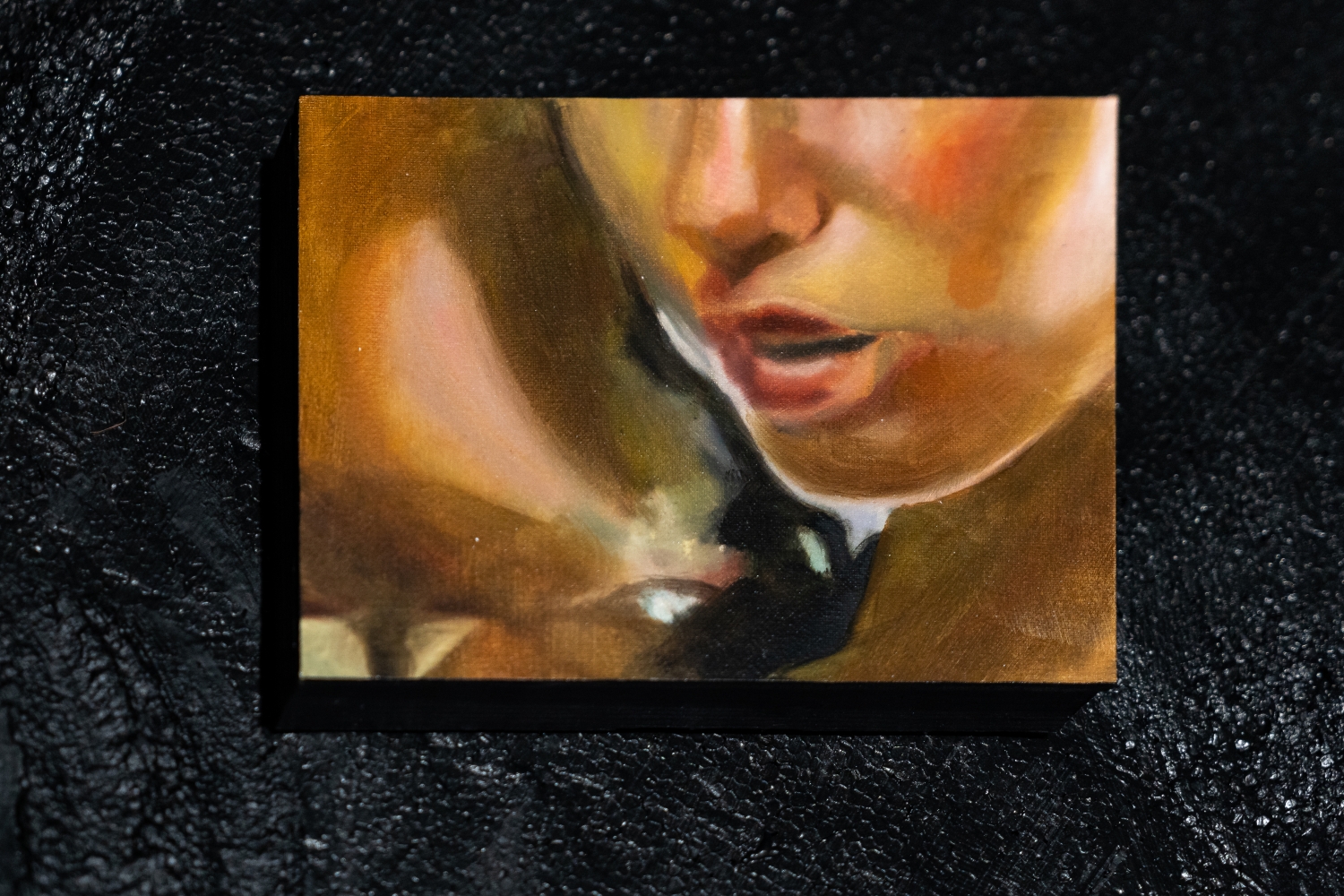 It is the compost by which it becomes possible for us to dream the obscure, to think beneath flesh, beneath surfaces and appearances. ‘What we believe shapes the world.’ In the exhibition space as in the painting surface, the artist sculpts the black paste with her fingers to form swampy areas, riptides, torrents, paths or even mounds. She looks for what is buried, everything that is difficult for us to say or to show. The mounds, hillocks of black paste, conceal what has been buried. Graves, buried cities, swallowed up by the earth and by time. On the canvas, Chloë Saï Breil-Dupont buries elements beneath black paste. Like tightly-closed chests, the paintings contain an obscure part, an invisible part. Starhawk, a Californian witchand ecofeminist activist, speaks of the inner power: ‘Yes, the inner power is the power of the low, the dark, the earth; the power that comes from our blood, our lives, and our passionate desire for the living body of the other.’² Chloë Saï Breil-Dupont manifests through painting this ‘passionate desire for the living body of the other’. A desire freed from binary and alienating thoughts. A desire generated by a vital impulse that leads her to a deep encounter with the other, that guides her as much towards darkness, rich in dissimulations and troubles, as towards a light, a colour, a ‘meta-surreal’ interior of the individuals whose lives she explores. So perhaps the artist manages to manifest some of the inner power of those she chooses to represent. She also speaks of the ‘fire from within’. The portraits challenge certitudes, fixities and rigidities in order, on the contrary, to present individuals in becoming, beings in movement who evolve within an ecosystem, which also occurs over a long period of time, invariably mutating and becoming an ancestral metamorphosis of the living. ‘And, little by little, extend a map. Make the rest disappear. Not to pronounce any more in order to forget. Then pronounce only what is sure and move forward by feeling with the throat to pronounce a little more.’