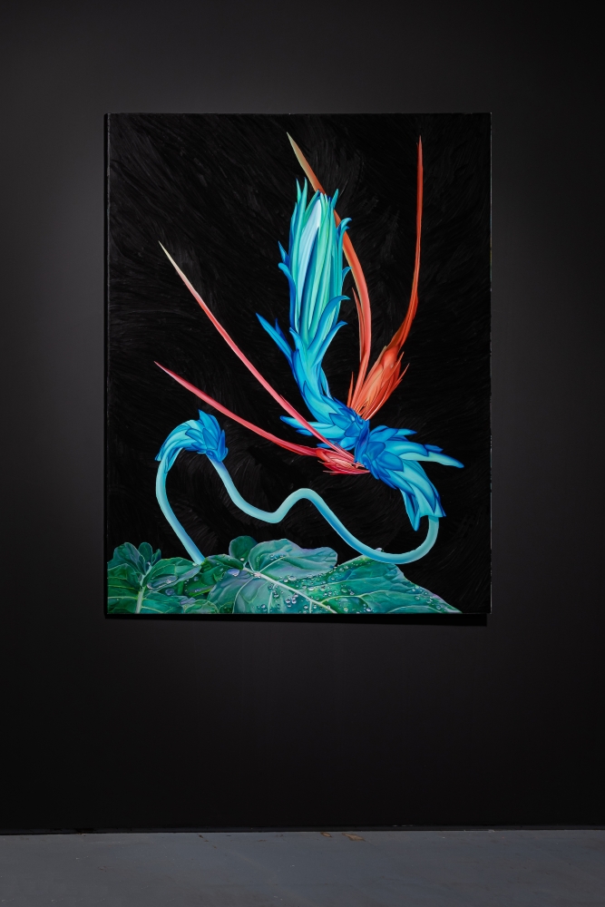 Metaphorically and conceptually, black paste embodies not only what binds Chloë Saï Breil-Dupont to her loved ones and the cyborg plants whose portraits she creates, but also what binds the individuals represented to their own memories, their own experiences, their own existences and interdependencies. The black paste connects everything. ‘It stores the whole, the atoms that constitute the whole. It is the beginning, where we come from and also where we will return. It is the proof, the memento that no matter what we do, I have been you, you have been me and we have been this plant.’¹ Physically, on the canvas as in space, it is the cooked result of a mixture of beeswax, Dammar resin, black pigments obtained by the calcination of materials. The black paste is applied by hand around the figure in the form of plant motifs, water currents or air currents. It is thick and matte. It generates densities. On the canvas, it absorbs light – thus bodies, human and non-human, are their own source of light. The artist explains that black paste is ‘a paint for bats, for beings who see with something other than their eyes’. The black paste tells us that there are a multitude of ways to see, to remember, to feel an image, a light, an object, a body, a texture.