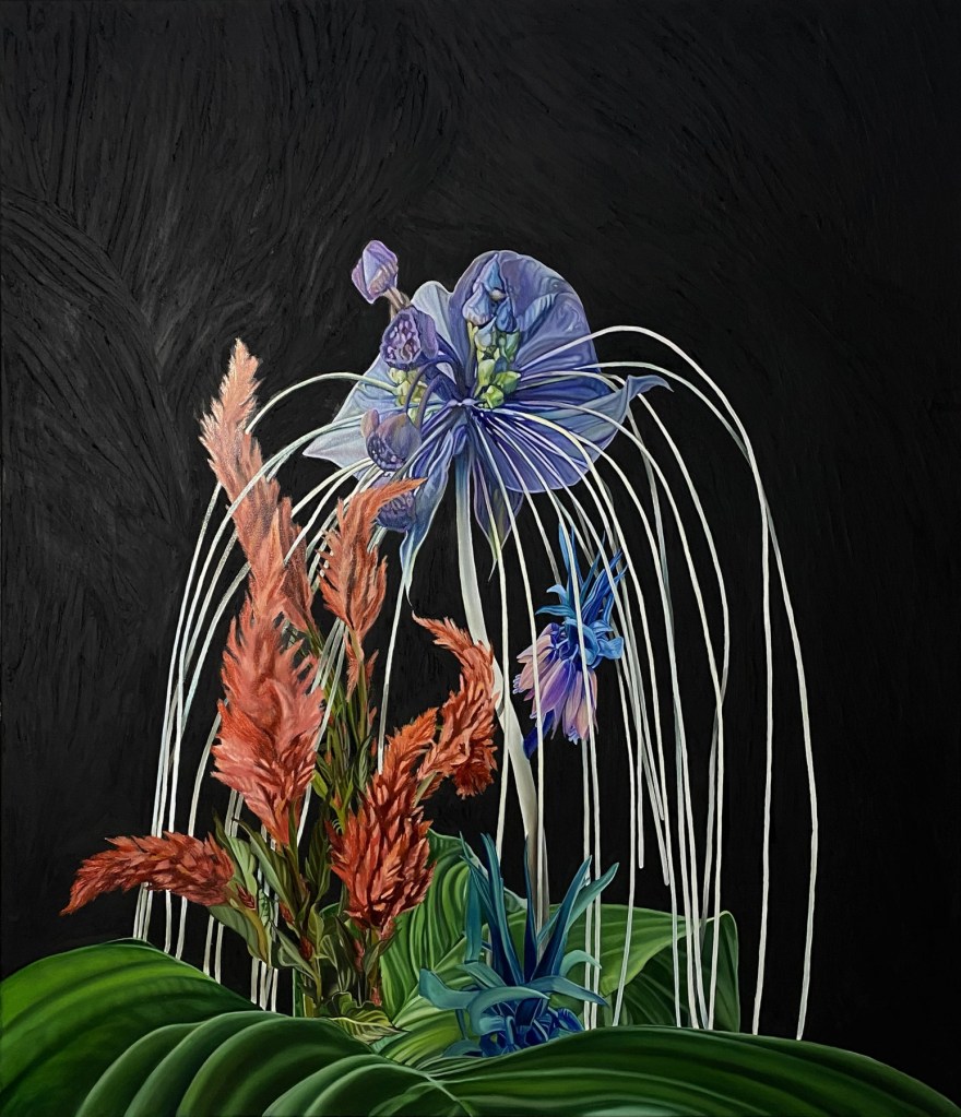 Métaphoriquement et conceptuellement la pâte noire incarne ce qui lie non seulement Chloë Saï Breil-Dupont à ses proches aux plantes cyborgs dont elle réalise les portraits, mais aussi ce qui lie les individus représentés à leurs propres mémoires, à leurs propres expériences, à leur propres existences et interdépendances. La pâte noire relie tout. “Elle stocke le tout, les atomes qui constituent le tout. Elle est le départ, d’où nous venons et aussi où nous retournerons. Elle est la preuve, le memento que quoi que nous fassions, j’ai été toi, tu as été moi et nous avons été cette plante.” Physiquement, sur la toile comme dans l’espace, elle est le résultat cuisiné d’un mélange de cire d’abeille, de résine de Dammar, de pigments noirs obtenu par la calcination de matières. La pâte noire est appliquée à la main autour de la figure sous la forme de motifs végétaux, de courants d’eau ou de courants d’air. Elle est épaisse et mate. Elle génère des densités. Sur la toile, elle absorbe la lumière – ainsi les corps, humains et non humains, sont leur propre source de lumière. L’artiste explique d’ailleurs que la pâte noire est “une peinture pour chauve-souris, pour les êtres qui voient autrement qu’avec les yeux”. La pâte noire nous signifie qu’il existe une multitude de manières de voir, de se souvenir, de ressentir une image, une lumière, un objet, un corps, une texture.