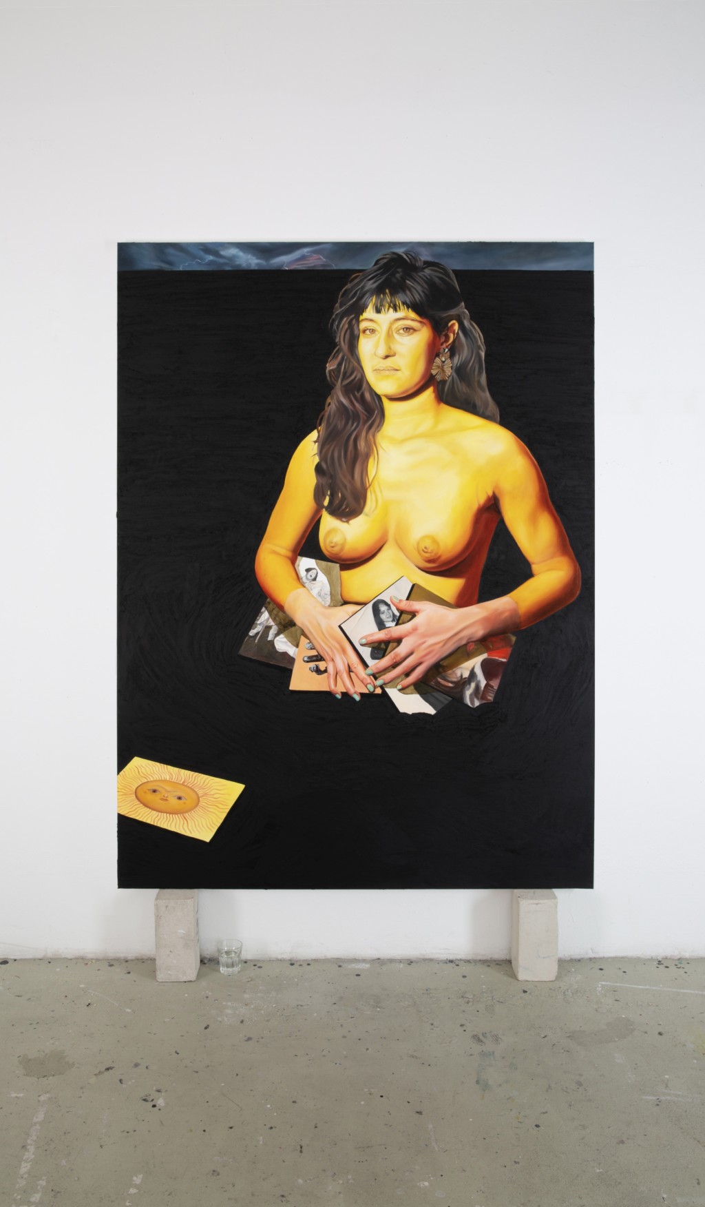 It is the compost by which it becomes possible for us to dream the obscure, to think beneath flesh, beneath surfaces and appearances. ‘What we believe shapes the world.’ In the exhibition space as in the painting surface, the artist sculpts the black paste with her fingers to form swampy areas, riptides, torrents, paths or even mounds. She looks for what is buried, everything that is difficult for us to say or to show. The mounds, hillocks of black paste, conceal what has been buried. Graves, buried cities, swallowed up by the earth and by time. On the canvas, Chloë Saï Breil-Dupont buries elements beneath black paste. Like tightly-closed chests, the paintings contain an obscure part, an invisible part. Starhawk, a Californian witchand ecofeminist activist, speaks of the inner power: ‘Yes, the inner power is the power of the low, the dark, the earth; the power that comes from our blood, our lives, and our passionate desire for the living body of the other.’² Chloë Saï Breil-Dupont manifests through painting this ‘passionate desire for the living body of the other’. A desire freed from binary and alienating thoughts. A desire generated by a vital impulse that leads her to a deep encounter with the other, that guides her as much towards darkness, rich in dissimulations and troubles, as towards a light, a colour, a ‘meta-surreal’ interior of the individuals whose lives she explores. So perhaps the artist manages to manifest some of the inner power of those she chooses to represent. She also speaks of the ‘fire from within’. The portraits challenge certitudes, fixities and rigidities in order, on the contrary, to present individuals in becoming, beings in movement who evolve within an ecosystem, which also occurs over a long period of time, invariably mutating and becoming an ancestral metamorphosis of the living. ‘And, little by little, extend a map. Make the rest disappear. Not to pronounce any more in order to forget. Then pronounce only what is sure and move forward by feeling with the throat to pronounce a little more.’