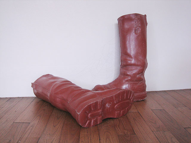 Le corpus d’Etienne Bossut comprend un ensemble d’œuvres qu’il est possible d’envisager comme autoportrait fragmenté : Mon fauteuil (1976), Mes Bottes (1979), Mon Frigo (1980), Ma Cabane (1996-1997), Mes valises (1979). Les titres des œuvres attestent d’une possession, ces objets lui appartiennent ou bien lui ont appartenu à un moment de sa vie. Il en a réalisé les images. « Ce sont des trucs à moi desquels je peux causer (comme on dit) par exemple Mon fauteuil faisait parti des meubles dans ma communauté à Saint-Galmier, mes bottes (vraiment les miennes) venaient de Manufrance à Saint-Etienne, mon frigo (FRIGECO) à été récupéré vraiment crade dans un atelier de métallurgie à Saint-Chamond, ma cabane donnée à la fin de l’entreprise FAURE à Firminy, tout ça autour de moi, dans la Loire (on ne peut s’empêcher de penser que la Loire qui m’a inspiré dès le début, se retrouve encore à son estuaire Nantes (Bitte Schoën) avec d’autres histoires à chaque titre. »[21] Le fauteuil, les bottes ou la cabane ont subi les affres du temps et l’usure de leur fonction. Ils sont ainsi marqués par leur utilisation. Malgré leur fabrication sérielle, ces marques font d’eux des objets uniques de par leur vécu, de par l’importance que l’artiste leur accorde. On note une différence entre Mon fauteuil (1976), Fauteuils (1992) et Des fauteuils (1992). L’artiste se joue de la dimension personnelle inscrite dans la décision d’employer un pronom possessif dans le titre. « La qualité spécifique de l’objet, sa valeur d’échange relève du domaine culturel et social. Sa singularité absolue par contre lui vient d’être possédée par moi – ce qui me permet de me reconnaître en lui comme être absolument singulier. »[22] Ce développement de Jean Baudrillard s’inscrit dans une réflexion plus globale posée sur la collection, la possession d’objets selon des critères dont nous déterminons la substance. Baudrillard poursuit : « Nous retrouverons une structure homologue, sur le plan sociologique, dans le système du modèle et de la série. Ici et là, nous constatons que série ou collection sont constitutives de la possession de l’objet, c’est-à-dire de l’intégration réciproque de l’objet et de la personne. »[23] Le tirage en résine représente une manière et un moyen pour l’artiste de s’approprier le modèle (l’objet original) et d’en étirer l’existence, l’histoire et la présence, déplaçant de fait l’objet de sa fonction et de son contexte.