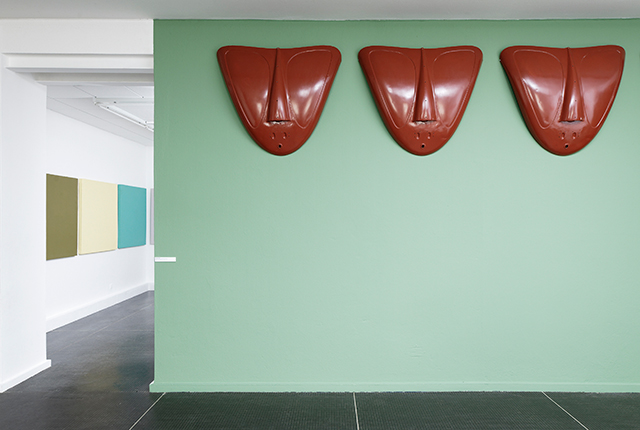 L’œuvre intitulée Série noire (1989) réunit neuf tirages d’un capot arrière du cabriolet Volkswagen Hebmuller, un véhicule produit en Allemagne et mis sur le marché dès 1949. Les tirages sont formés de résine teintée de la couleur marron. L’artiste les présente alignés à l’horizontale en haut du mur. Ils nous surplombent. Le titre et la forme du capot font écho aux masques africains sculptés dans différents bois. Série Noire fait référence aux artistes modernes ayant ressenti de besoin de puiser leur inspiration au creux de pratiques artistiques extraoccidentales. Etienne Bossut réalise cette œuvre en 1989, alors qu’au Centre Pompidou et à la Grande Halle de La Villette se jouait l’exposition Les Magiciens de la Terre.[20] S’il n’a pas vu l’exposition et si l’œuvre ne participe en aucun cas d’une réponse critique à l’exposition, Série Noire est symptomatique des recherches (critiques et esthétiques) issues du postcolonialisme. Chaque tirage du même capot a été réalisé à la main. L’artiste tient au « fait main », au travail réalisé à l’atelier, au temps de fabrication, à un savoir-faire technique, au plaisir de la manipulation des matériaux, au toucher. En opposition aux modes de production industrielle, il préfère la fabrication à la main. Un mode artisanal qui implique un temps différent, un soin spécifique apporté à chaque tirage. En ce sens, Série noire, dans sa dimension sérielle, peut porter un regard critique quant aux artefacts présupposés artisanaux destinés aux acteurs et aux actrices du tourisme de masse.