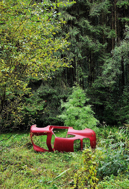 L’artiste ne réalise pas les tirages de toutes sortes d’objets. Nous identifions des typologies récurrentes et principalement domestiques : assises, voitures, contenants, outils de travail et des objets-surfaces tels que le miroir ou la toile. Ils ne sont ni extraordinaires ni spectaculaires. Bien au contraire, dans les sociétés occidentales, ils appartiennent à l’ordre du commun. Nous pouvons y projeter nos propres histoires, nos souvenirs ou même nos désirs. Etienne Bossut fabrique une archéologie du présent. Les œuvres, des tirages en résine d’objets manufacturés, apparaissent autant comme les photographies, les fantômes, les ruines et les archives de notre époque. En 1985, il réalise Réflexion qui articule le tirage doré d’un cadre de miroir et deux tirages d’un bidon en métal de 100 litres légèrement enfoncés sur le haut. Les deux bidons sont disposés de part et d’autre du cadre vide. Si le face à face est bien réel, la réflexion rendue impossible par l’absence du miroir. Tels deux fantômes incapables de se voir et de dialoguer, nous associons au bidon et au miroir un sentiment d’impuissance. Plusieurs œuvres font aussi clairement référence à la ruine, une thématique classique de l’histoire de l’art, qui, ramenée aux objets contemporains, souligne un regard critique quant à une forme de décadence de la société de consommation ou une vanité des productions à grande échelle. L’œuvre Parthénon bidon (1980) est exposée en milieu extérieur. Sur la terre et dans les herbes hautes, cinq tirages en résine grise d’un même bidon en métal (200 litres) jonchent telles les ruines d’un temple ancien. Un bidon est à demi enseveli dans le sol, un autre est renversé, deux bidons empilés évoquent la base persistante d’une colonne. Trente ans après, Etienne Bossut installe sur le toit du CRAC de Sète une œuvre intitulée Désœuvrement (2009). Il s’agit d’un tirage en résine rouge vif d’un bidon criblé de trous. Le bidon qui a manifestement été pris pour cible menace de tomber dans le vide. « Le spectacle est le mauvais rêve de la société moderne enchaînée, qui n’exprime finalement que son désir de dormi. Le spectacle est le gardien de ce sommeil. »[27] Ici, la notion de ruine est associée à la violence et le désespoir. Une analyse que nous retrouvons au regard d’un objet qui bénéficie de deux regards différents, d’abord New… (1998-1999), la coque couchée sur le côté comme le nouveau jouet déjà abandonné ; ensuite Pas ce soir (2007), la carcasse criblée de trous de la coccinelle, « voiture que tout le monde a eu ». Les œuvres traduisent une relation au temps et à la violence, elles adoptent un statut de monument et véhiculent une valeur mémorielle.