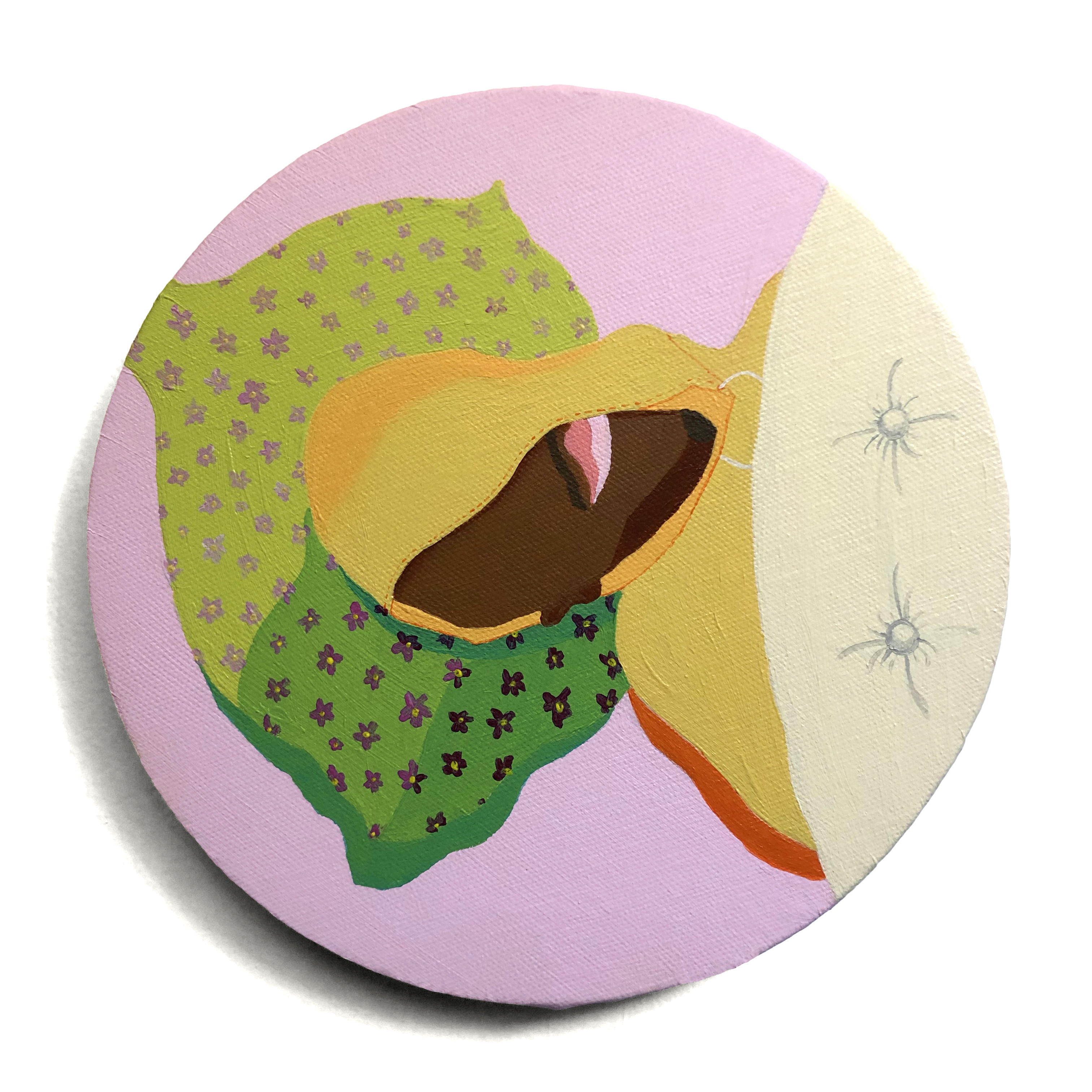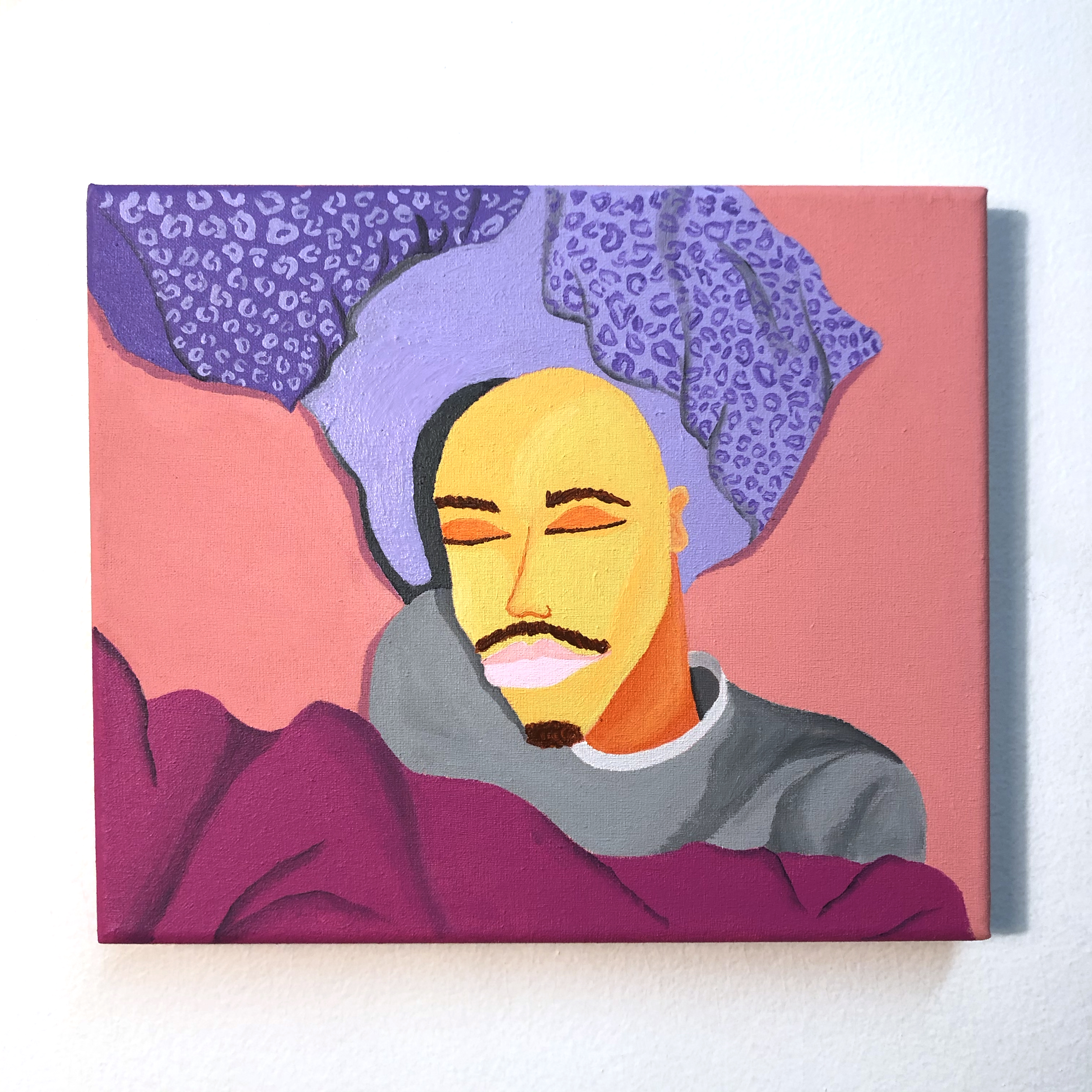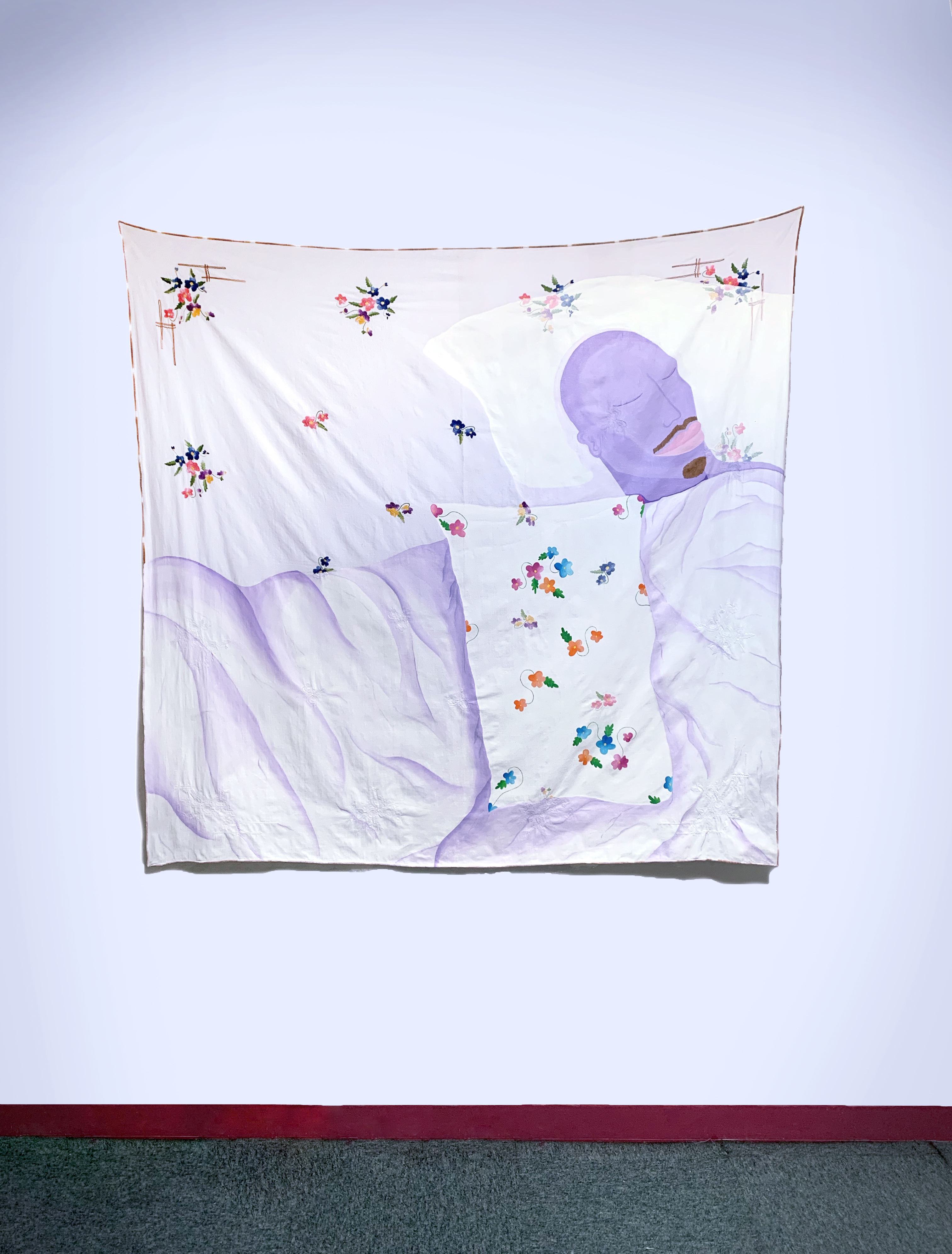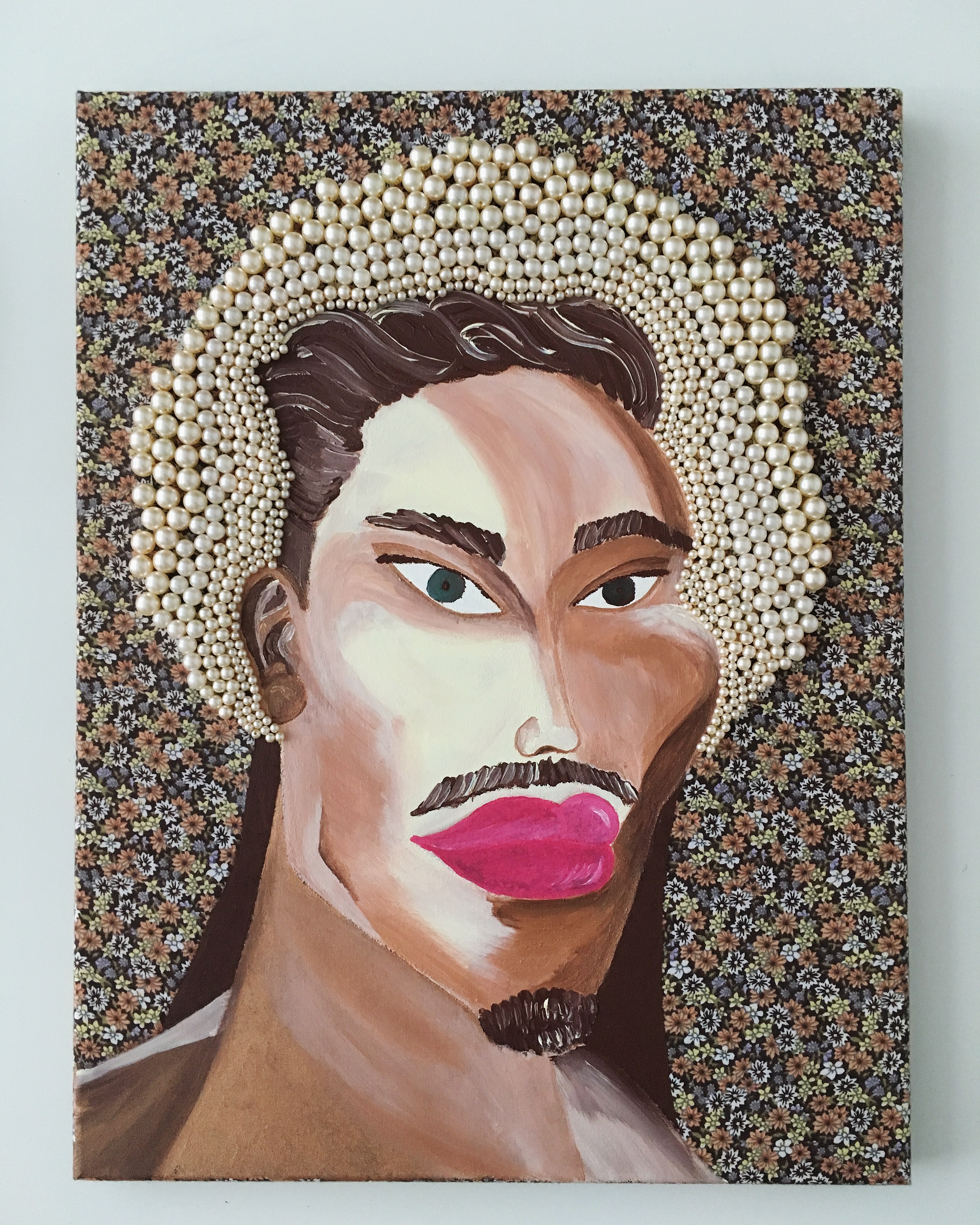 acrylique sur tissu fleuri, perles cousues, 70 x 58cm,