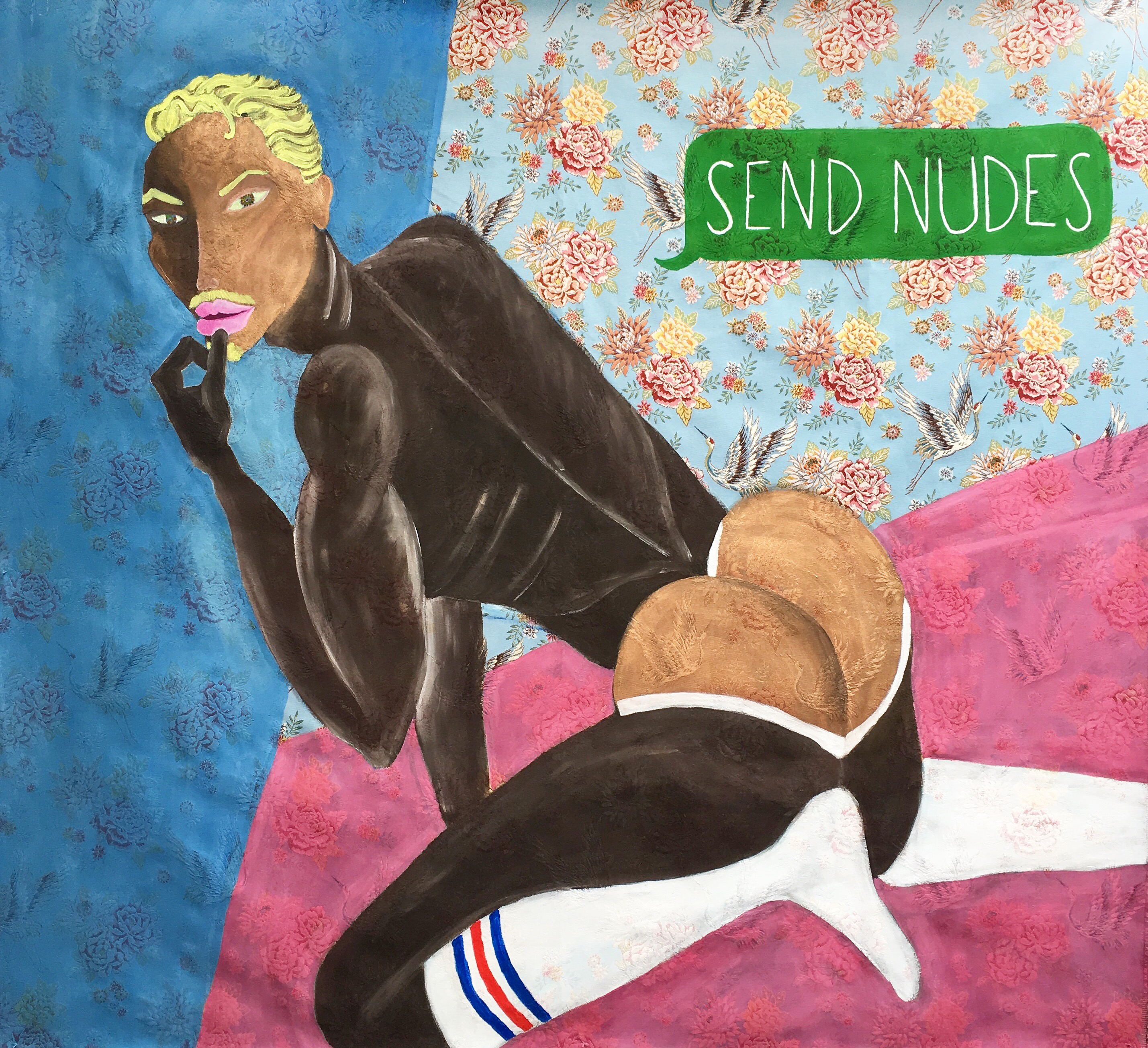Richard Otparlic représente des corps masculins – le sien, celui de son compagnon ou ceux d’icônes instagramables. Si son propre corps représente une ressource d’inspiration importante pour son imagerie, il y ajoute des modèles glanés sur les réseaux sociaux : des mannequins masculins posant pour vendre des sous-vêtements. Des corps hypersexualisés, photoshopés, idéalisés, que l’artiste s’approprie, s’emploie à dessiner, à peindre, à vectoriser et à imprimer. Il observe des corps génériques, numériquement modifiés à coups “d’interventions chirurgicales, de filtres, en clair, de tous les moyens possibles pour entrer dans une pseudo-normalité.” Alors, l’artiste queerise les silhouettes de ses “créatures”. Leurs fesses sont exagérément rondes, leurs torses trapèzes sont excessivement musclés. Les traits de leurs visages sont soulignés de maquillages éclatants. Leurs peaux sont dotées de couleurs venues de contes de fées : mauve clair, vert pâle, jaune, rose fuchsia, lavande ou saumon. Des couleurs douces, joyeuses et tendres auxquelles s’ajoutent des motifs textiles : des nuages, des slips, des fleurs, des cactus, des pois, des carreaux. Auxquelles s’ajoutent aussi des motifs brodés à la main, des perles cousues, des strass ou encore des cheveux naturels.