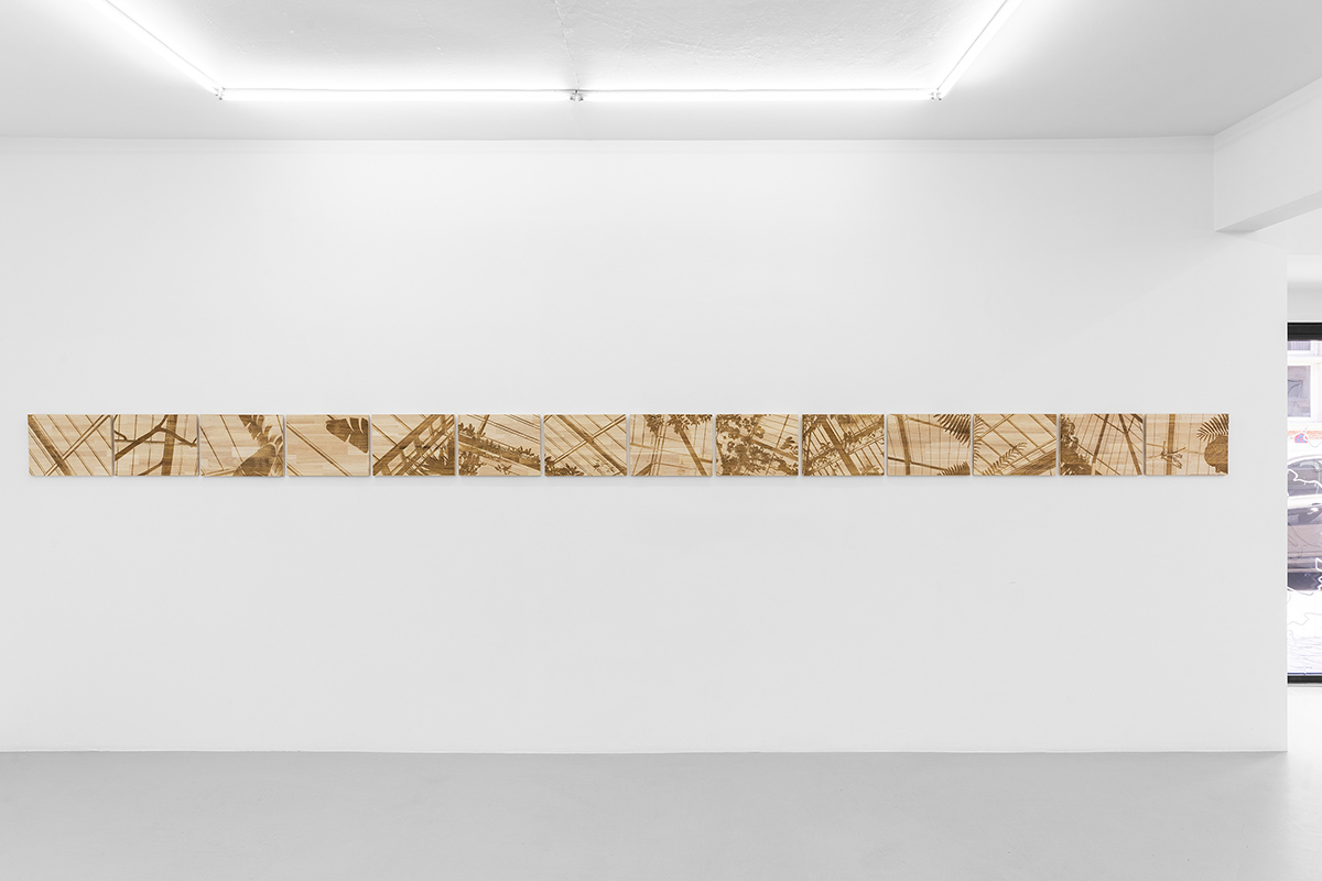 Dans cette géographie coloniale, vivante et mémorielle, la Belgique trouve une place évidente.[2] Michèle Magema explore la circulation du vivant à partir des jardins coloniaux belge et congolais. En effet, après une étude des échanges maritimes entre Anvers et Matadi, l’artiste poursuit ses recherches et s’intéresse aujourd’hui au jardin d’Eala (créé en 1900) à Mbandaka en République Démocratique du Congo, aux serres royales de Laeken (créées en 1873) à Bruxelles et au jardin botanique de Meise (créé en 1797, forme actuelle en 1958). Elle observe avec attention les plans des jardins, les architectures, les choix botaniques et le déplacement des végétaux d’un continent vers l’autre. Les jardins coloniaux comportent une dimension plurielle : scientifique, agricole et économique. En ce sens, les œuvres manifestent un dialogue, un lien (passé et présent) entre les deux jardins, et par extension entre les deux pays.