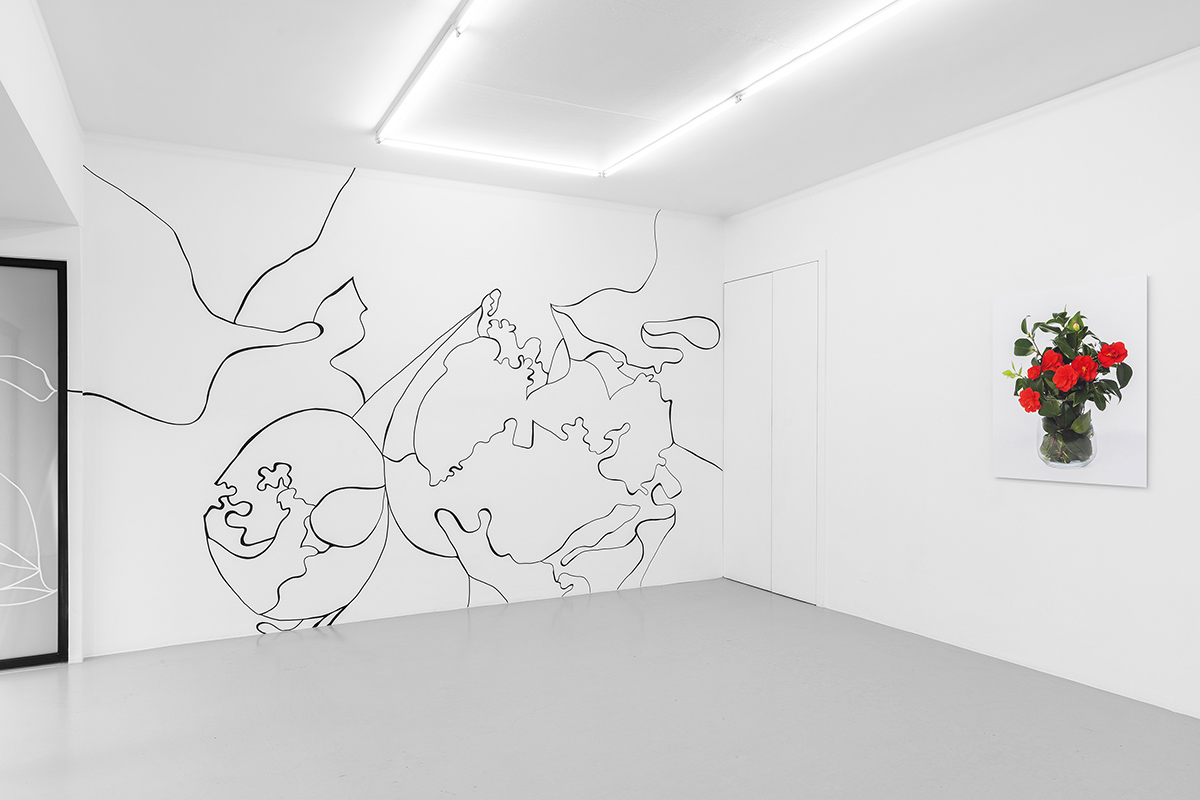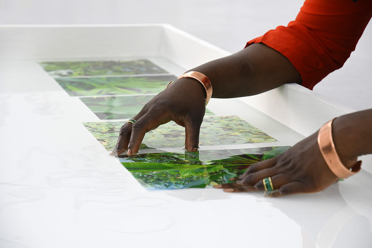 The artist sows clues, tenuous elements of a common history that act as botanical cuttings, like the wall drawing – The Silence of Nsinga – which interweaves the maps of the three gardens. Drawings of vines, of cartographic and architectural lines become intertwined and form a territory with interconnected narratives. Dénètem Touam Bona writes: «The wisdom of lianas lies not only in the experience of these cosmopoetic links, but also in the possibility of turning them into the taut strings of a combat bow. This is why I see in lianas – as a figuration of allied plants and biomes – the auxiliary spirits of the pioneering struggles of the indigenous against the total commodification of living things and the standardization of ways of existence.» Further on, in the series Sambou Masodi – De l’autre côté du jardin, Michèle Magema engraves the architectural lines of Belgian greenhouses on the surface of rubber tree boards, which she combines with representations of indigenous Congolese plants. A drawing shows the artist’s parents – Les gardiens des Nti – in their garden in France. Images of plants from Central Kongo (her parents’ region of origin), made in situ in the greenhouses of Meise, appear in coloured waters. The photographic portrait of camelia flowers, Leopold II’s favourite, evokes the king’s involvement in the development of colonial gardens in Belgium (Les camélias de Léopold secundo – Rouge). Through mapping, revealing, engraving and crossing narratives, the artist establishes a physical relationship with unofficial and official documents and with geographical realities. With patience and determination, she studies the colonial orchestration of the gardens and its impact on human bodies. Underlying all this, the notion of acclimatization unfolds in space. The botanical and biogeographical vocabulary then determines what is endemic (indigenous) or exotic. The acclimatization, whether agreed upon or not, affects human or non-human elements.