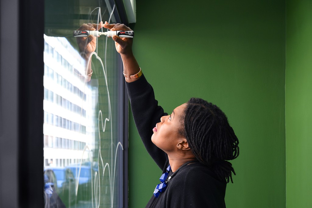 L’artiste sème des indices, les éléments ténus d’une histoire commune pour opérer à des boutures, à l’image du dessin mural – Le Silence de Nsinga – qui entrelace les cartes des trois jardins. Les dessins de lianes, de lignes cartographiques et architecturales s’enchevêtrent pour former un territoire dont les récits sont enlianés. Dénètem Touam Bona écrit : “La sagesse des lianes consiste non seulement dans l’expérience de ces liens cosmopoétiques, mais aussi dans la capacité à faire d’eux les cordes tendues d’arc de combat. C’est pourquoi je vois dans les lianes – en tant que figuration des plantes et des biomes alliées – les esprits auxiliaires des luttes pionnières des “indigènes” contre la marchandisation intégrale du vivant et l’uniformisation des modes d’existence.”[3] Plus loin, à la surface de planches d’hévéa, la série Sambou Masodi – De l’autre côté du jardin, où Michèle Magema grave les lignes d’architecture des serres belges qu’elle allie à des représentations de plantes indigènes congolaises. Un dessin figure les parents de l’artiste – Les gardiens de nos Nti – dans leur jardin en France. Dans les eaux colorées se révèlent des images de plantes du Kongo Central (région d’origine de ses parents) réalisées in situ dans les serres de Meise. Le portrait photographique de fleurs de camélias – la préférée de Léopold II – évoque l’implication du roi dans l’élaboration des jardins coloniaux en Belgique (Le camélia de Léopold- Blanc). Alors, par la cartographie, la révélation, la gravure et le croisement des récits, l’artiste installe un rapport physique tant envers les documents (officieux et officiels) qu’aux réalités des lieux. Avec patience et détermination, elle étudie l’orchestration coloniale des jardins et l’incidence de celle-ci sur les corps. Car, en filigrane, c’est la notion d’acclimatation qui se déploie dans l’espace. Le vocabulaire botanique et biogéographique détermine alors qui relève de l’endémisme (indigénisme) ou de l’exotisme. L’acclimatation, consentie et non consentie, des individus, qu’ils soient humains ou non humains.