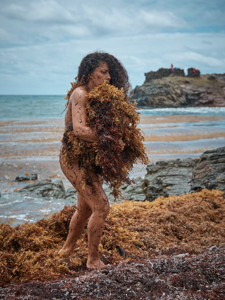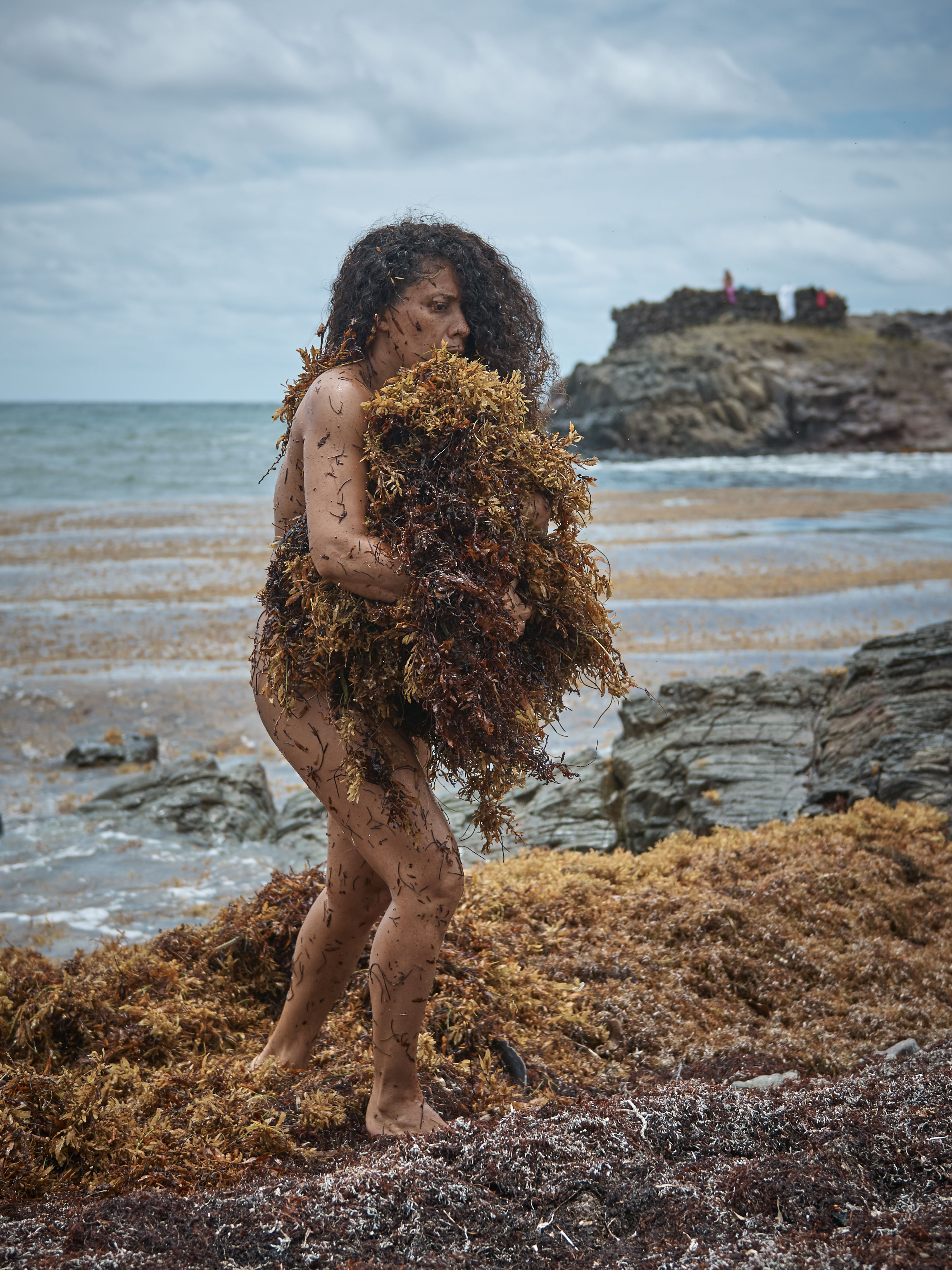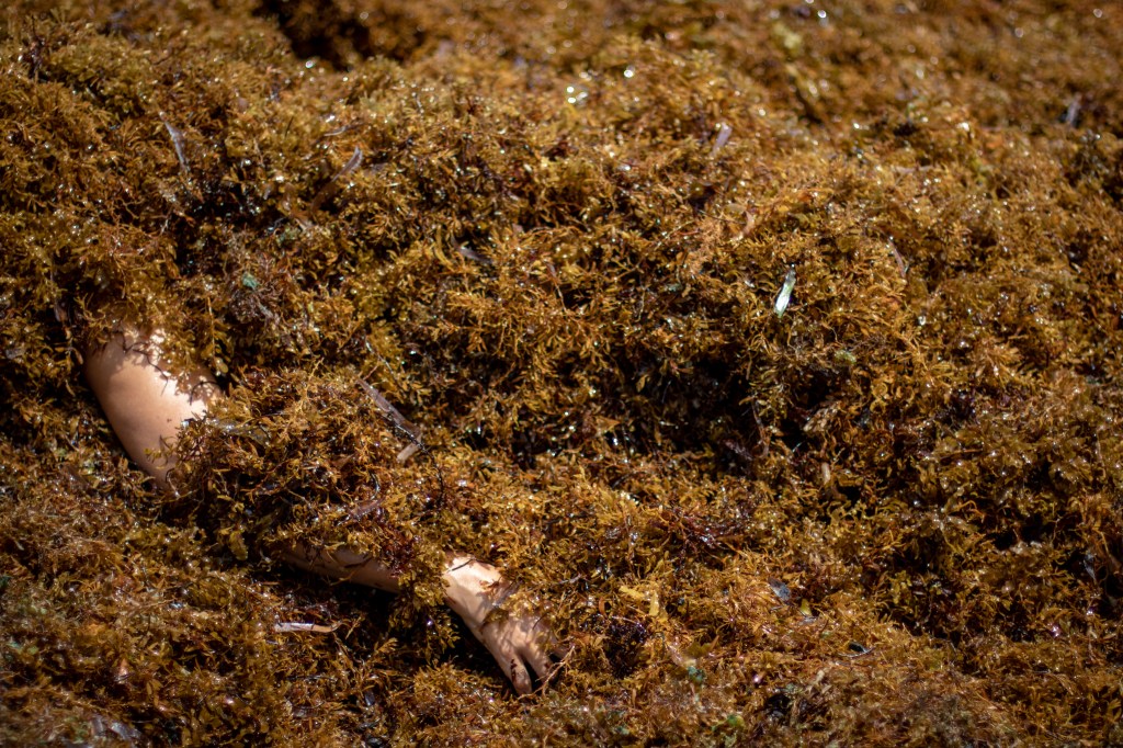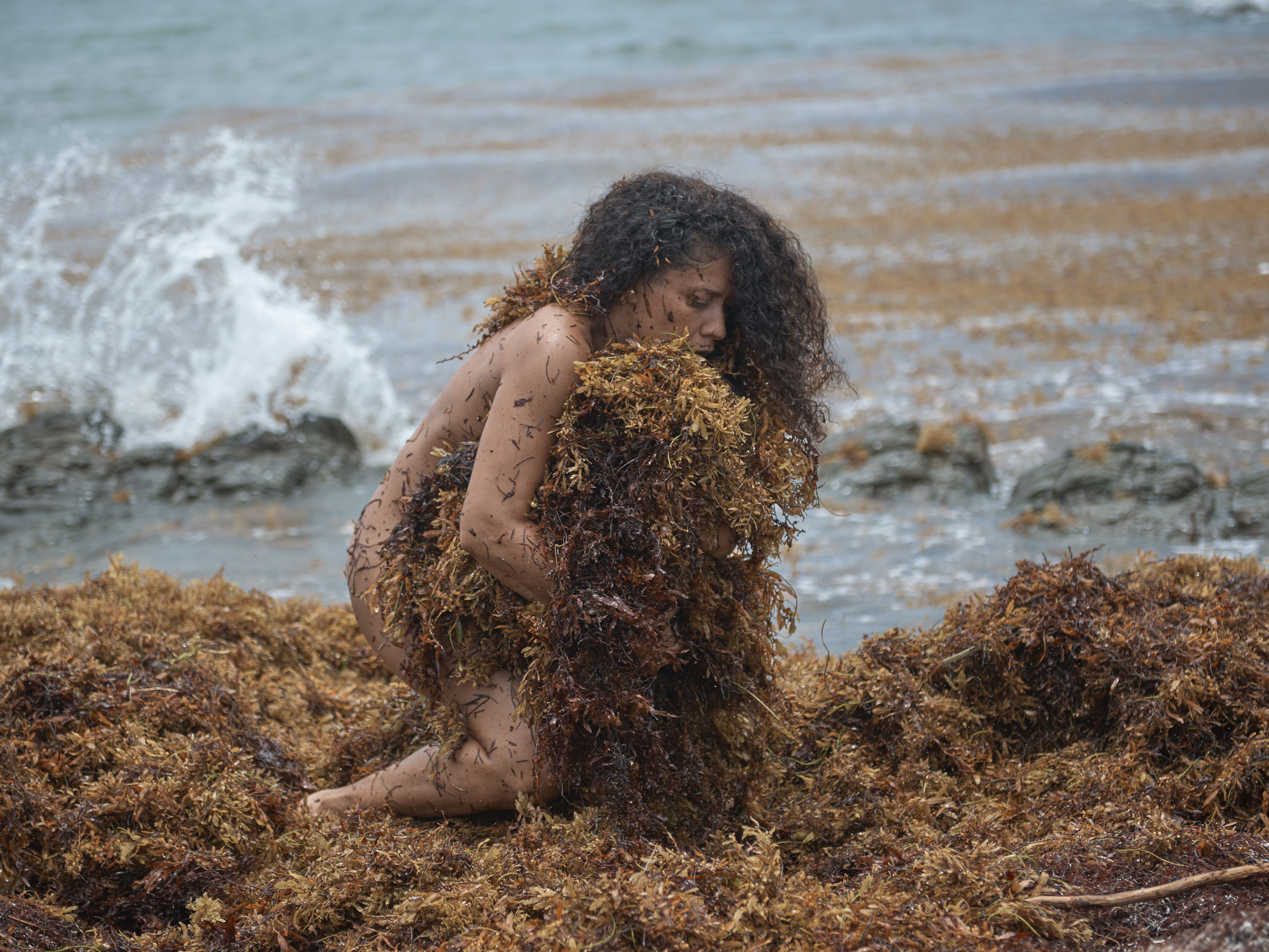 Depuis 2017, Annabel Guérédrat construit un projet au long cours, Ensargasse-moi. Il se déploie sous la forme de performances pensées comme des rituels de contamination amoureuse : des enterrements dans la sargasse pouvant mener à une métamorphose des corps vivants, des enlacements toxiques, des enlisements dans et avec la sargasse fraîche. Le corps nu et pailleté, l’artiste se love dans les amas de sargasse échouée. “J’ai cherché instinctivement à m’ensevelir ; à faire des sargasses une deuxième peau, de sorcière, pour renaître autrement, différente, changée. Créer un rituel, un acte magique pour moi.”