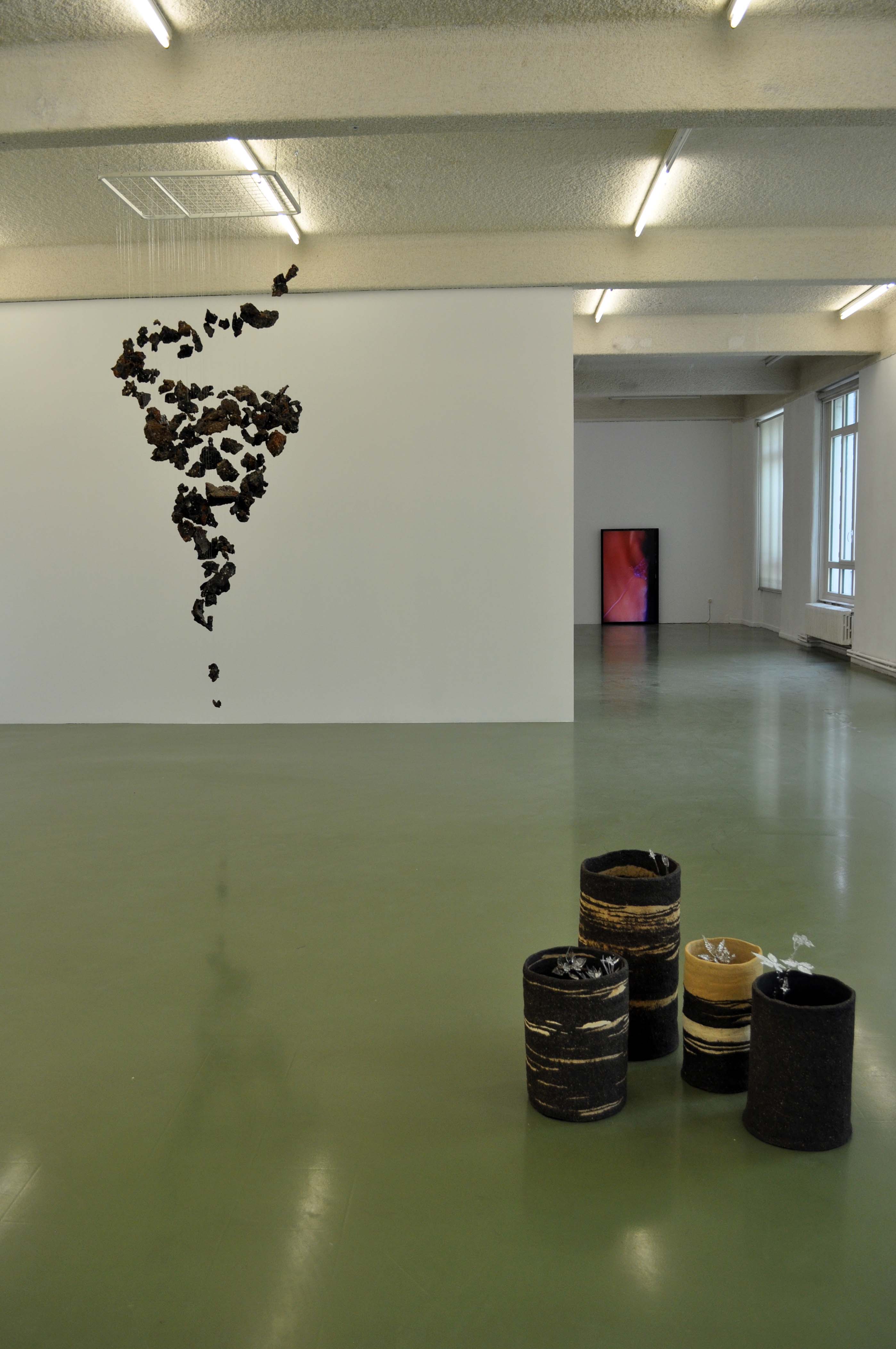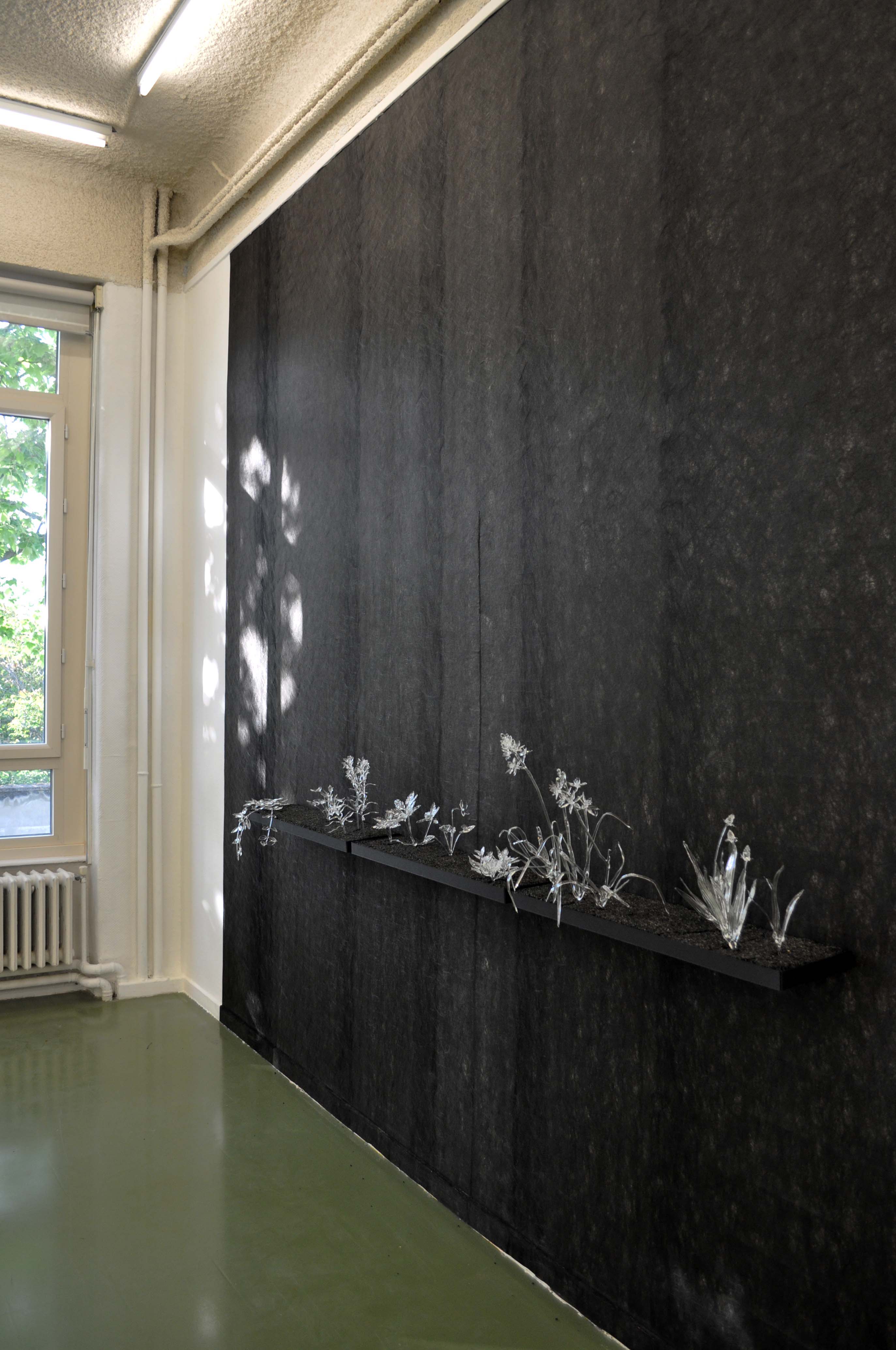 Mathilde Caylou agit dans le lieu qu’elle choisit d’expérimenter physiquement. Lors de sa résidence à Vénissieux, elle est d’abord déconcertée par le contexte urbain. Elle prend rapidement conscience de l’importance donnée par la ville aux espaces verts. Le sol est envisagé comme l’étendue commune qui relie l’urbain au rural. L’artiste s’est ainsi intéressée aux multiples relations qui existent entre les humain.es et les êtres végétaux. Dans un contexte citadin, elle a rencontré différent.es acteur.trices d’une végétalisation des espaces urbains : les habitant.es, les paysagistes et les jardinier.ères qui entretiennent et prennent soin des espaces verts, ou encore les membres des associations des jardins ouvriers et partagés. Elle se rend dans les serres municipales et y découvre des arbustes et autres végétaux en culture qui vont aussi bien être plantés dans la ville, ou placés d’une façon plus ornementale dans les bureaux et les cérémonies officielles. Mathilde Caylou fouille aussi les archives municipales pour comprendre le fonctionnement des espaces verts. Elle établit également un inventaire des plantes rudérales qui participent à une végétalisation non maîtrisée des espaces. Au-delà de la ville, de ses potagers, des espaces aménagés et des parterres fleuris, elle s’est rendue aux Grandes Terres, un espace agricole protégé situé à proximité du centre de Vénissieux. Elle rencontre les paysan.nes qui y travaillent les sols pour y faire pousser une autre catégorie végétale, à savoir les plantes nourricières. Au fil de sa recherche, l’artiste échange avec un ensemble de personnes afin de pouvoir recueillir des gestes, des comportements, des choix et des manières de penser les relations humaines au monde végétal. Du rôle politique au rôle social des plantes, Mathilde Caylou en cartographie les réalités et les usages. Elle observe et identifie progressivement les plantes sociales, les plantes ornementales, les plantes rudérales et les plantes nourricières. Quatre familles végétales qui cohabitent sur un même territoire et qu’elle incorpore à la conception des nouvelles œuvres présentées au centre d’art.