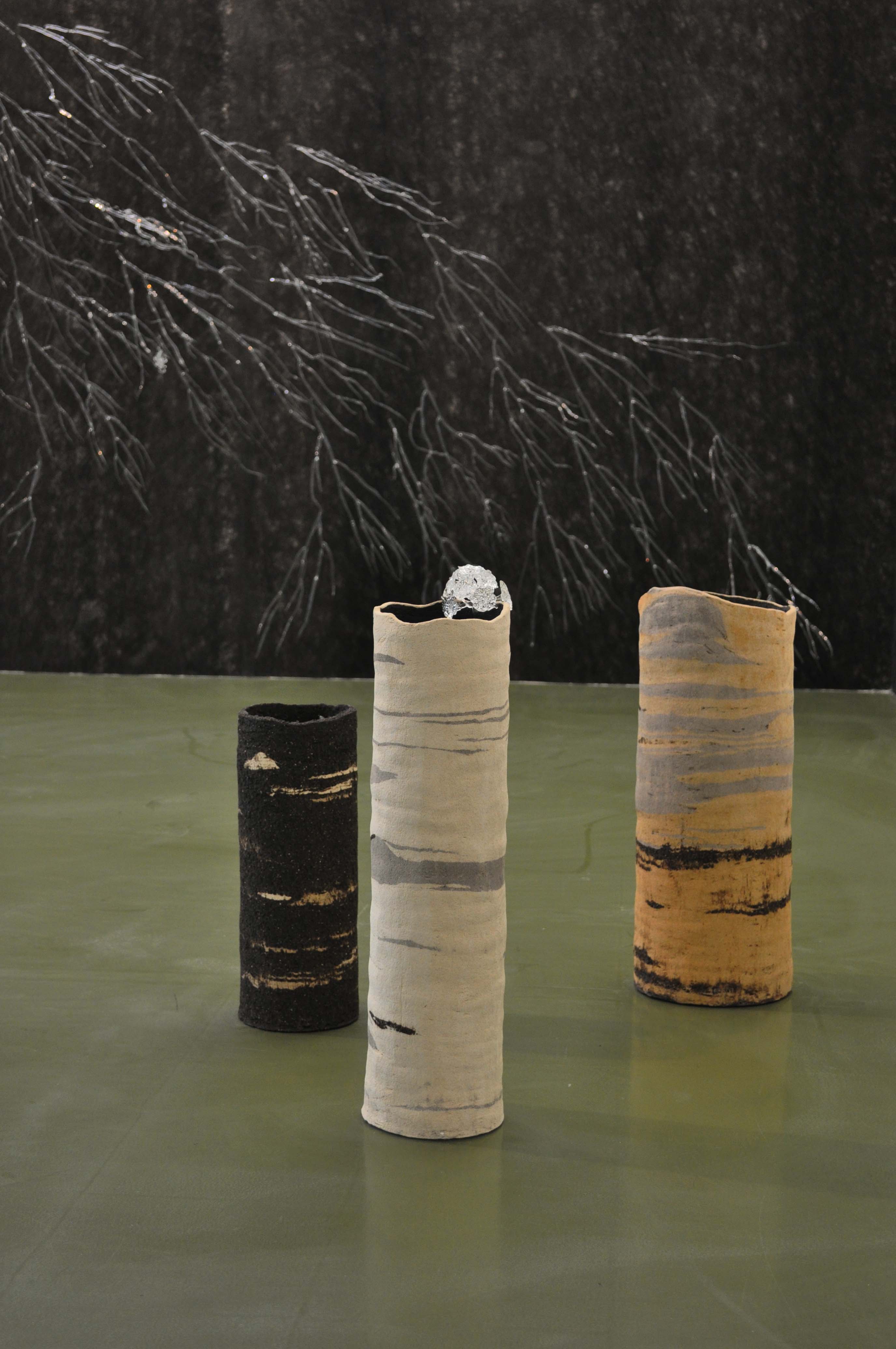 Les œuvres de Mathilde Caylou résultent d’une observation sensible et physique du vivant. C’est par une approche de terrain, qu’elle prête une attention particulière à la conception des écosystèmes, à l’occupation des sols, à l’organisation de la coexistence des êtres humains et non humains. Imprégnée depuis longtemps des mondes paysans, elle est à l’écoute des pratiques et raisonnements de celles et ceux qui appréhendent les sols quotidiennement. En ce sens, elle collabore régulièrement avec des paysan.nes qui sont, du fait de leurs activités, les artisan.es des territoires ruraux. Du découpage géométrique des sols aux plantations d’arbres ou de céréales, en passant par les pâturages herbagers ou les vignobles, ielles entretiennent, organisent et façonnent les biotopes qu’ielles habitent. Alors, le sol devient un point d’ancrage et de connexion entre les territoires arpentés. Les œuvres portent les empreintes de sols prélevés et augmentés par le travail du verre. D’une manière quasi exclusive, Mathilde Caylou travaille en effet une matière terrienne qui provient directement du sol. Le verre, à la fois fragile et solide, lui permet de transformer les réalités de lieux dont elle nous transmet les topographies et les histoires. Son souffle et ses gestes s’incorporent à la matière translucide. Celle-ci transporte les lieux prélevés dans un espace mental, organique et poétique où se déploient nos propres imaginaires nourris de terre, d’air, d’eau et de feu.