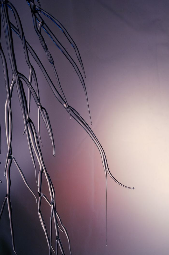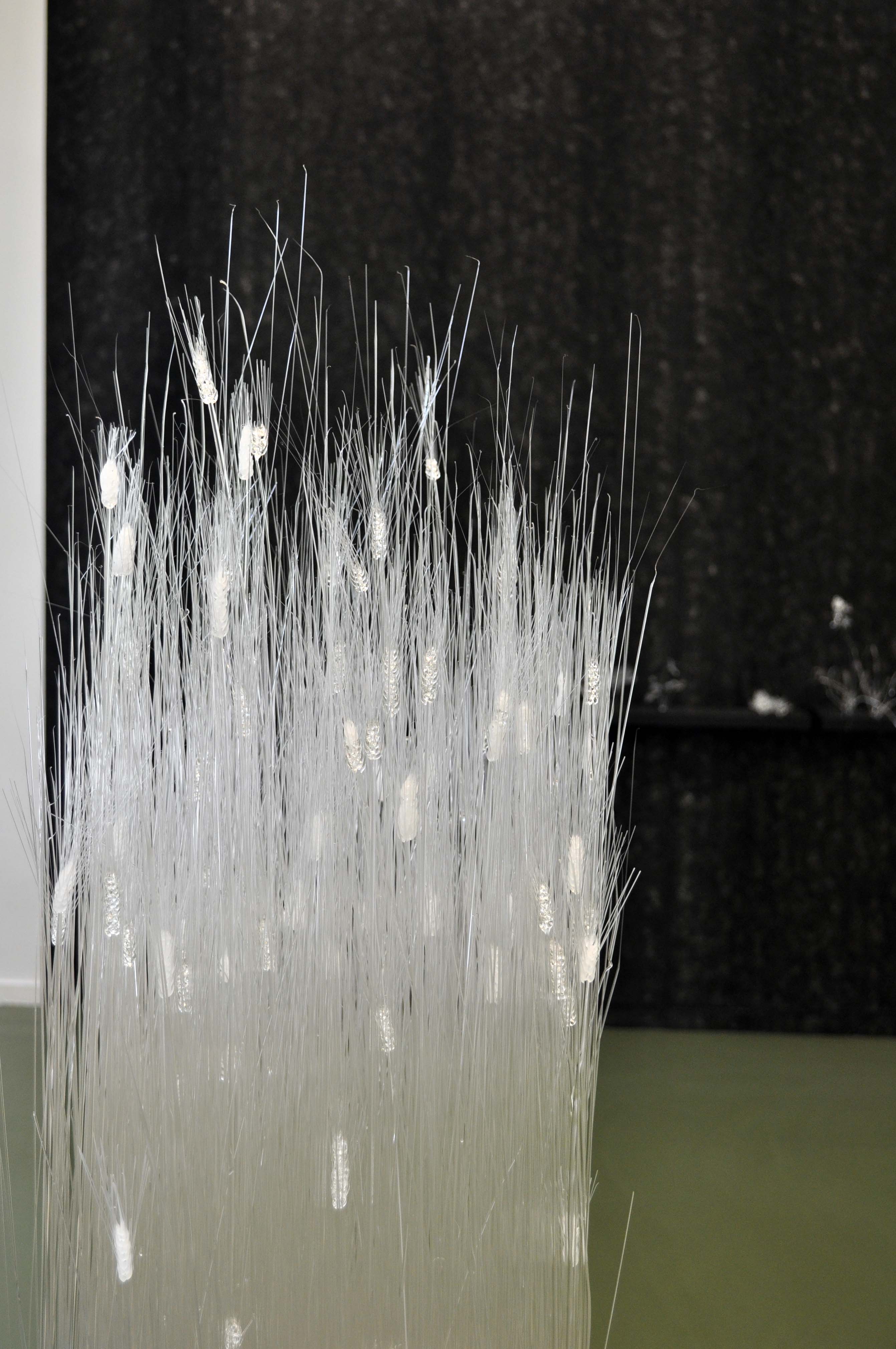 Des parterres fleuris aux champs de céréales, Mathilde Caylou explore le mouvement végétal selon différentes échelles et pratiques. Les acteurs et les actrices de ce mouvement collectif portent un même souci envers les sols et la végétalisation d’un écosystème mouvant parce qu’il est en constante redéfinition. En ce sens, les questions de la transposition et de la transformation plastique des lieux sont au cœur de sa démarche artistique. Les œuvres modifient nos comportements et nos rapports de perception en nous situant, par exemple, sous le sol. C’est l’ensemble du vivant qui y trouve une traduction lumineuse et transparente : des gouttes de pluie, des épis de blé, de la terre, des herbes folles, des racines, de la glace ou encore du bouillard. Les œuvres, pensées comme des installations ou plus exactement des objets de contemplation comme le précise l’artiste, nous engagent physiquement. Elles nous invitent à prendre le temps de nous immerger dans la matière et dans ces lieux prélevés. Les éléments rhizomatiques, des racines et des branches, portent des mouvements alliant non seulement les terrestres (tous les êtres qui habitent la Terre sans distinction d’espèce), mais aussi les espaces souterrains et les espaces célestes. Entre plongée, suspension et élévation, les œuvres de Mathilde Caylou transcendent les réalités des lieux pour nous mener vers d’autres champs de réflexion. Chacune d’entre elles est un écosystème à part entière. Un monde nouveau. Il n’est alors pas impossible de formuler des récits issus de spéculations narratives, et de repousser davantage les frontières de nos imaginaires anthropocentrés. Aux dimensions poétiques et narratives des œuvres, s’ajoute une portée politique. Elles peuvent en effet être envisagées comme les archives extrêmement vulnérables d’un monde vivant qui l’est tout autant. Ici, tous les fragments du vivant sont moulés, soufflés et figés dans le verre, et se présentent à nous de façons évanescente et fantomatique. La fragilité terrestre sous-tend les gestes et les intentions de Mathilde Caylou qui nous invite subtilement à penser nos relations à nos écosystèmes respectifs, aux interdépendances et aux manières dont nous nous affectons chacun et chacune.