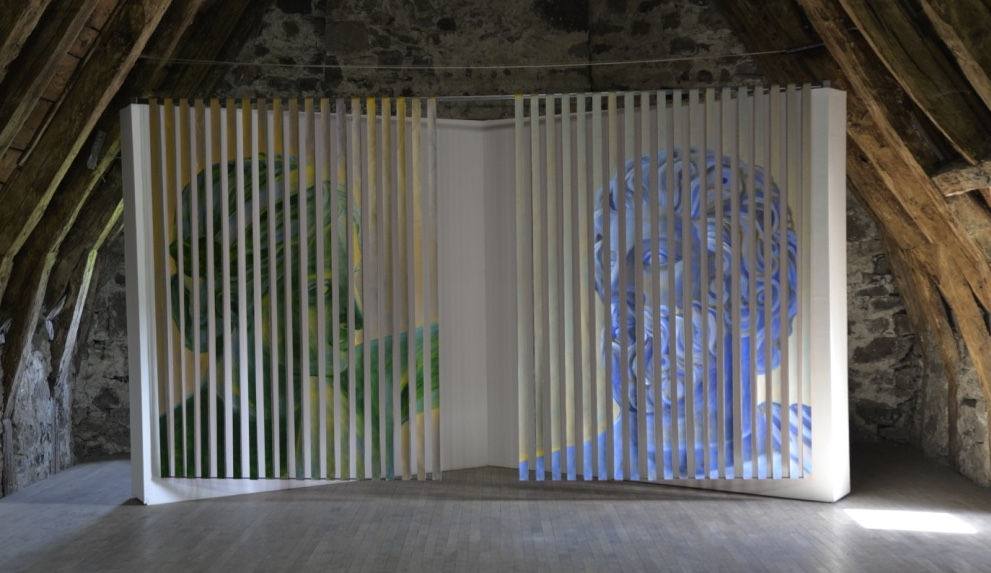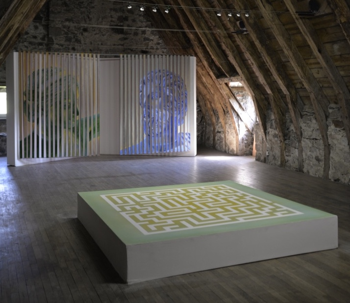Echoes est un projet au long cours formé de différents chapitres. Débuté en 2018 à la Galerie Claire Gastaud à Clermont Ferrand, le premier chapitre était consacré aux lucioles, aux présences fragiles et lumineuses qui peuplent nos mémoires. Le second chapitre, activé à la galerie Odile Ouizeman à Paris en 2019, convoquait les figures de dormeurs et de dormeuses. Des corps en sommeil qui ouvraient les champs du rêve, de l’attente et de l’inconscient. Le troisième chapitre présenté aujourd’hui au Château de la Trémolière invite à une plongée en eaux troubles dans le vortex mémoriel de Coraline de Chiara. Un vortex qui, inévitablement, forme des échos avec les nôtres. L’artiste propose des énigmes iconographiques. Il s’agit alors de se déplacer au sein d’un labyrinthe dont la solution est difficile à trouver. Nous sommes accueilli.es par une sculpture labyrinthique, une architecture mentale qui adopte une forme à la fois complexe et radicale. Par sa matérialité et sa rigueur formelle, elle tranche avec les tapisseries florales qui l’entourent. L’œuvre impose l’idée d’une déambulation à la fois individuelle et collective au sein de nos propres vécus, de nos propres mémoires, mais aussi au sein de l’exposition en elle-même. Coraline de Chiara brouille les plans des images pour se jouer des lectures plurielles, des effets de perception, de dimension et d’interprétation. Tout y est à décrypter. Puisque l’artiste travaille la mémoire pour la réveiller, elle fait remonter des images, des sensations, des émotions enfouies dans les couches profondes de cette matière abyssale.