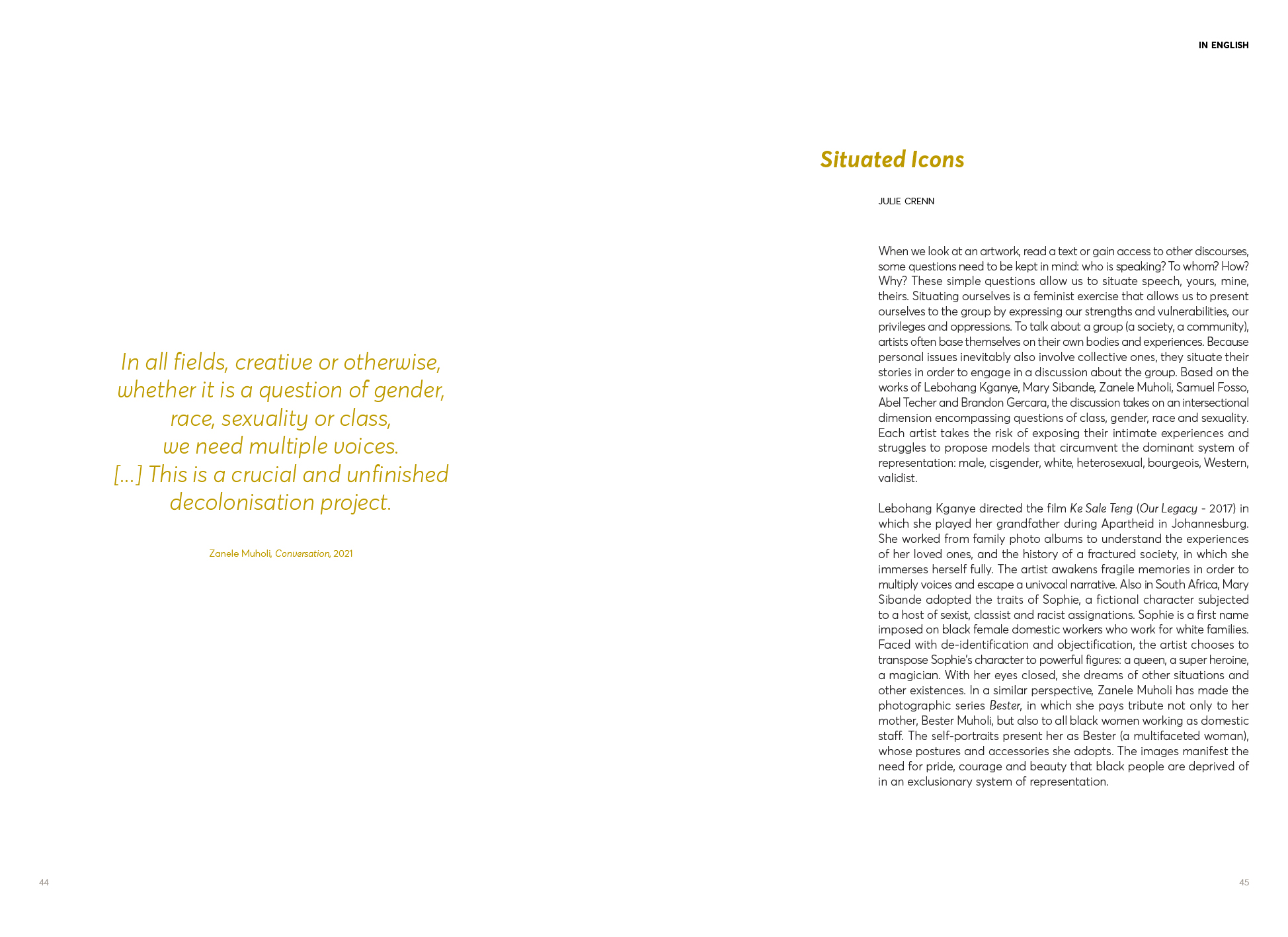 Artistes invité.es / Raphaël Barontini, Valérie Belin, Oleg Dou, Samuel Fosso, Thierry Fontaine, Meschac Gaba, Brandon Gercara, Lubaina Himid, Pieter Hugo, Lebohang Kganye, Barthi Kher, Jean-Marc Lacaze, Lionel Lauret, Pascal Lièvre, Alice Mann, Zanele Muholi, Lionel Sabatté, Mary Sibande, Abel Techer, Wilhiam Zitte.