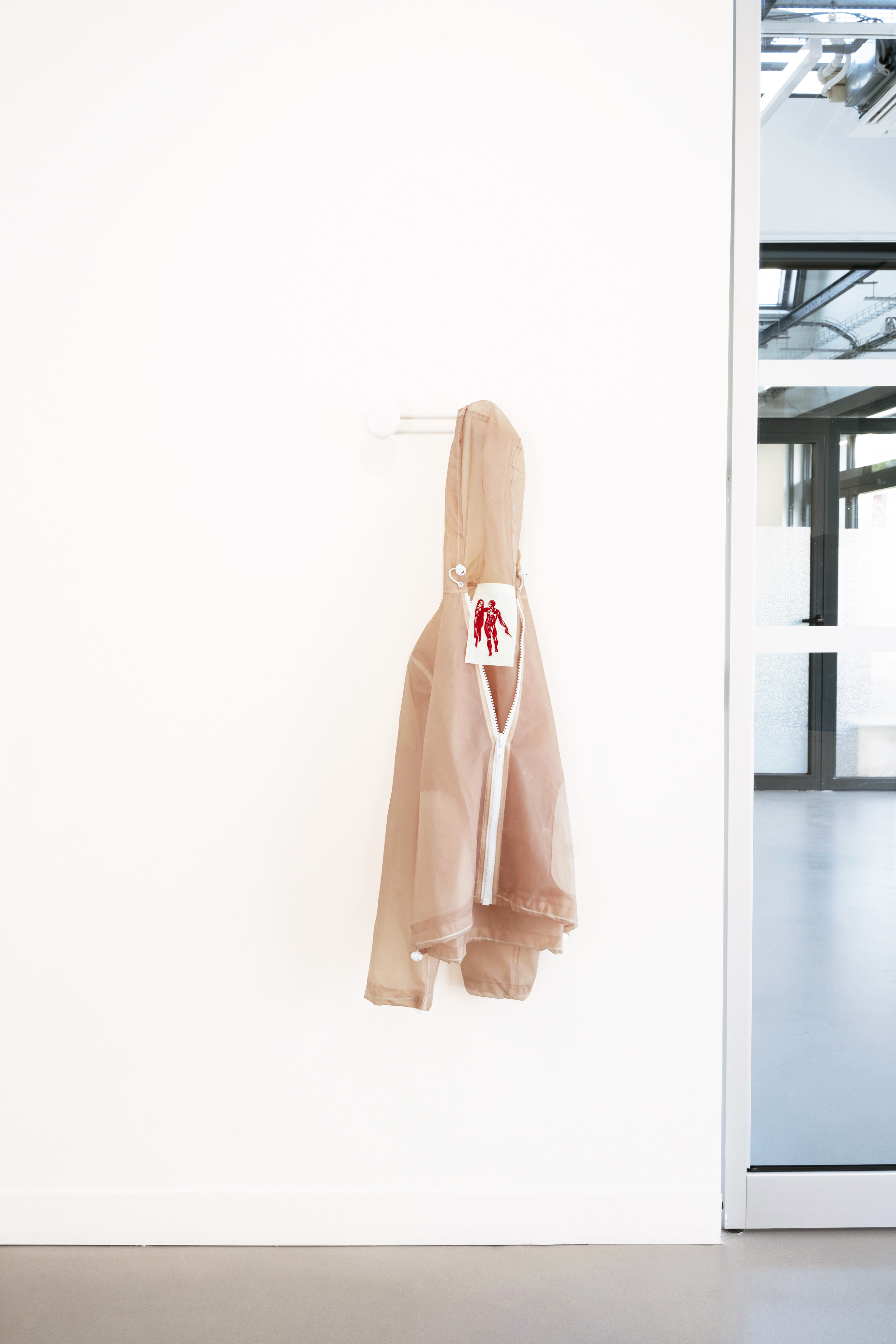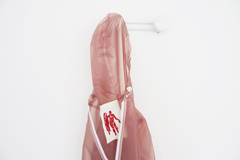 Installation, imperméable plastique, broderie numérique, patère métallique, 2021