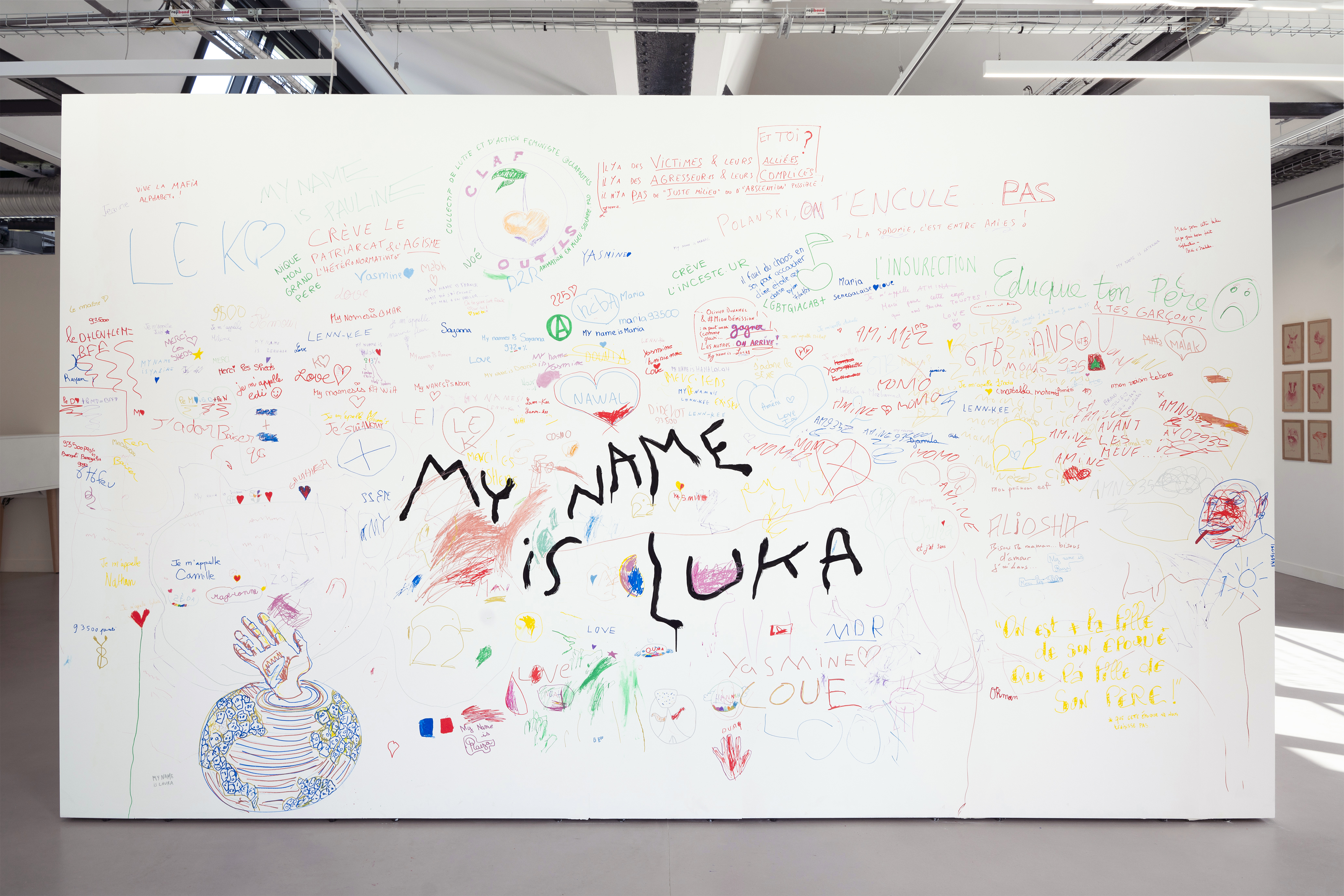 L’histoire de l’art et les réalités actuelles de l’art nous démontrent qu’il est difficile de discuter des questions de l’enfance. Les représentations, les matériaux, les formes se prêtent à des interprétations plurielles, souvent à de profonds malentendus, des contresens ou deviennent des prétextes pour lutter contre l’art. Pourtant le vandalisme, les demandes de censure et les procès ne donnent en rien le droit à une poignée de personnes de décider d’une manière univoque de parler de l’enfance. Elle reste un territoire complexe à traduire plastiquement, à penser sous la forme d’une exposition ou à mettre en mots. L’imaginaire collectif véhicule un fantasme, une utopie merveilleuse où, lorsque l’enfance est évoquée, il est immédiatement question d’innocence, de naïveté, de tendresse ou de joie de vivre. Ce sont là les ingrédients d’une enfance heureuse et préservée de toute forme de maltraitance que, il faut bien le dire, peu d’entre nous ont vécu. Pour une grande majorité des humain.es, l’enfance n’est pas un pays joyeux peuplé de monstres gentils, un paradis où pour chacun.e la vie serait plus facile. L’exposition My name is luka propose de réfléchir au silence qui entoure les enfant.es. Un silence inhérent à des situations traumatisantes, des paroles blessantes, des gestes et des comportements insupportables. Parce que pour la grande majorité d’entre nous, l’enfance ne résonne pas avec bonheur et sécurité, il me paraît important, voire urgent, d’aborder ces silences pour accompagner la libération des paroles, pour libérer les corps et pour fabriquer un espace collectif de partage, de soutien et d’entraide. Dans un monde idéal, l’espace d’exposition doit être un safe space où chacun.e peut, à travers une visite, un atelier, une rencontre, une question, un regard, comprendre qu’iel est la ou le bienvenu.e dans cet espace où il devient possible de partager son ressenti, son expérience, son silence, ses propres traductions plastiques. Les artistes invité.es traduisent le silence en lui donnant des formes, des représentations, des mots. Les œuvres sont autant de témoignages que de chemins pluriels pour sortir de soi, dire, se reconstruire, réparer, transmettre, apprendre à vivre avec un ensemble de traumas et trouver une manière d’incarner l’indicible.