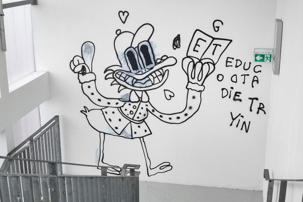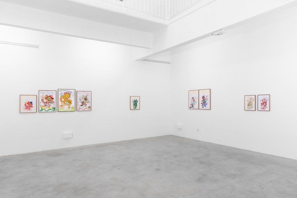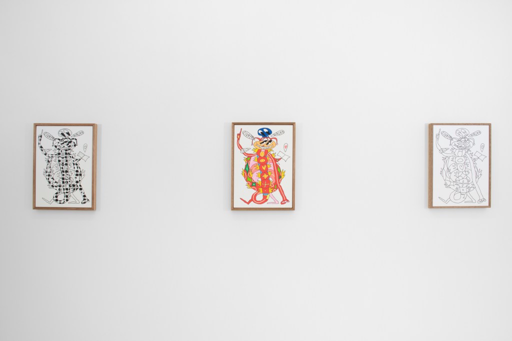 Depuis une quinzaine d’années, Adrien Vermont travaille à la déconstruction, voire à la destruction des récits fondateurs en Occident. Ceux-ci structurent un système patriarcal, néocolonial, capitaliste, classiste, monothéiste qui génère des normes porteuses de valeurs violentes. Après avoir remis en question des vérités scientifiques, l’artiste s’emploie à infuser une pensée philosophique et socialement engagée au sein de ses peintures dont il faut se méfier des apparences. Les figures animales peuplent le projet au très long cours : Sollertia Animalis (2013 – in progress). Sollertia Animalis explose la pensée binaire qui, encore aujourd’hui, s’obstine à opposer nature et culture. L’artiste précise : “or la seconde ne peut exister sans la première. Elle en découle. Au-delà de la bête opposition, il faudrait chercher la complémentarité en toutes choses.” Les serpents, les dauphins, les escargots, les chenilles ou encore les chiens nous livrent des messages dont la furiosité est en prise avec les réalités de nos sociétés. Ils nous interpellent sans retenue et toujours avec le sourire quant aux violences policières, financières, éducatives, machistes, écologiques, racistes et tant d’autres. En anglais, en latin et parfois en français, ils s’adressent à nous sous la forme de textes inscrits à l’intérieur de bulles. Parce que l’artiste travaille la plasticité du langage, les mots ne sont pas toujours faciles à décrypter, il nous faut produire un effort pour accéder aux messages scandés : Sic parvis magna (“Comme les grands, les petits”) – Ce que l’un chante, l’autre ne l’entend que par son oreille – Fuck police, hang bankers, Burn politics, etc. Les messages renvoient à une critique de l’ensemble des systèmes de domination qui contraignent les existences de plus de 90% des êtres vivants. Adrien Vermont déploie une pensée picturale fondée sur la ligne et la couleur. La ligne est brutale, inspirée des dessins d’enfants, des cartoons et d’une histoire de l’art sélective. Des peintures pariétales à Cy Twombly, en passant par Bonnard, Tracey Emin et Matisse, il étudie les manières de poser la couleur, ses écritures, ses matières et ses valeurs. Les oeuvres véhiculent une réflexion critique portée envers une conception académique et élitiste de l’art dit contemporain. Pour cela il s’appuie sur sa propre culture : une culture populaire où South Park, Tex Avery et Disney sont des références majeures au même titre que Giotto, Louise Bourgeois ou Artemisia Gentileschi. Avec un esprit de célébration de ses références, Adrien Vermont injecte dans ses peintures les personnages, la sémantique familière, les modes d’écriture, les stratégies de lignes et les synergies de couleurs issues des dessins animés, des bandes dessinées et des mangas. L’artiste peint sur papier libre ou bien contrecollé sur toile, sur carton – il peint à même les murs, il sérigraphie les dessins réalisés sur tablette numérique. Ces mêmes dessins peuvent aussi être imprimés sur tee-shirts. Il déchire et recompose les oeuvres sur papier. Les gestes, les supports et les choix techniques (peinture acrylique, peinture à l’encaustique, stylet sur écran, sérigraphie, impression) participent d’une remise en cause de ce qui fait oeuvre : sa matérialité, sa valeur, ses modes de reproduction, son originalité, etc. C’est avec une liberté sans borne qu’Adrien Vermont bouscule un ensemble de lieux communs, de vérités héritées, de convictions nécessairement trompeuses, excluantes et aliénantes. C’est dans une perspective radicale et joyeuse que l’artiste fabrique, avec les figures animales, une farandole aussi drôle que politique. Les personnages aux allures folles et furieuses transmettent ainsi des notions philosophiques de manières insolentes et hilarantes. La joie et la rage sont conjuguées au profit d’une critique de nos contradictions, de nos névroses, de l’extrême violence, de l’absurdité et de l’invalidité des systèmes autoritaires qui sabrent nos libertés fondamentales. Les peintures manifestent un refus catégorique de toute forme d’autorité : en art comme dans la vie. Il s’agit alors de déconstruire le socle classique, excluant et assignant, en proposant des contrepieds. Ces derniers nous engagent à voir, à entendre et à comprendre les bribes d’une pensée plastique, politique et philosophique. Ainsi, les sources populaires participent d’un langage contemporain, un langage efficace et commun qui est encore largement dénigré, voire méprisé par les tenant.es des normes artistiques. L’artiste pense que “la profondeur d’une idée, d’une pensée complexe, peut-être contenue dans une forme simple (mais pas simpliste).” Par ce langage commun, Adrien Vermont tend à rendre accessible une réflexion millefeuille où s’articulent des engagements explicites, une pensée philosophique en peinture et le travail de la peinture elle-même. L’artiste invoque notre libre arbitre pour nous amener à douter et à renverser des vérités imposées. Je doute, donc je suis. Pour nous libérer par nous-mêmes des pouvoirs dévastateurs, des constructions et des schémas hérités qu’il nous faut ré-apprendre à désamorcer et à réécrire. »