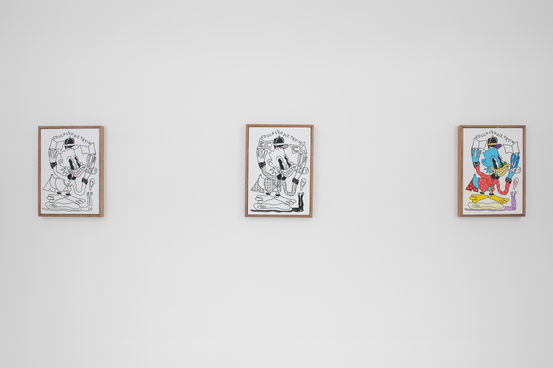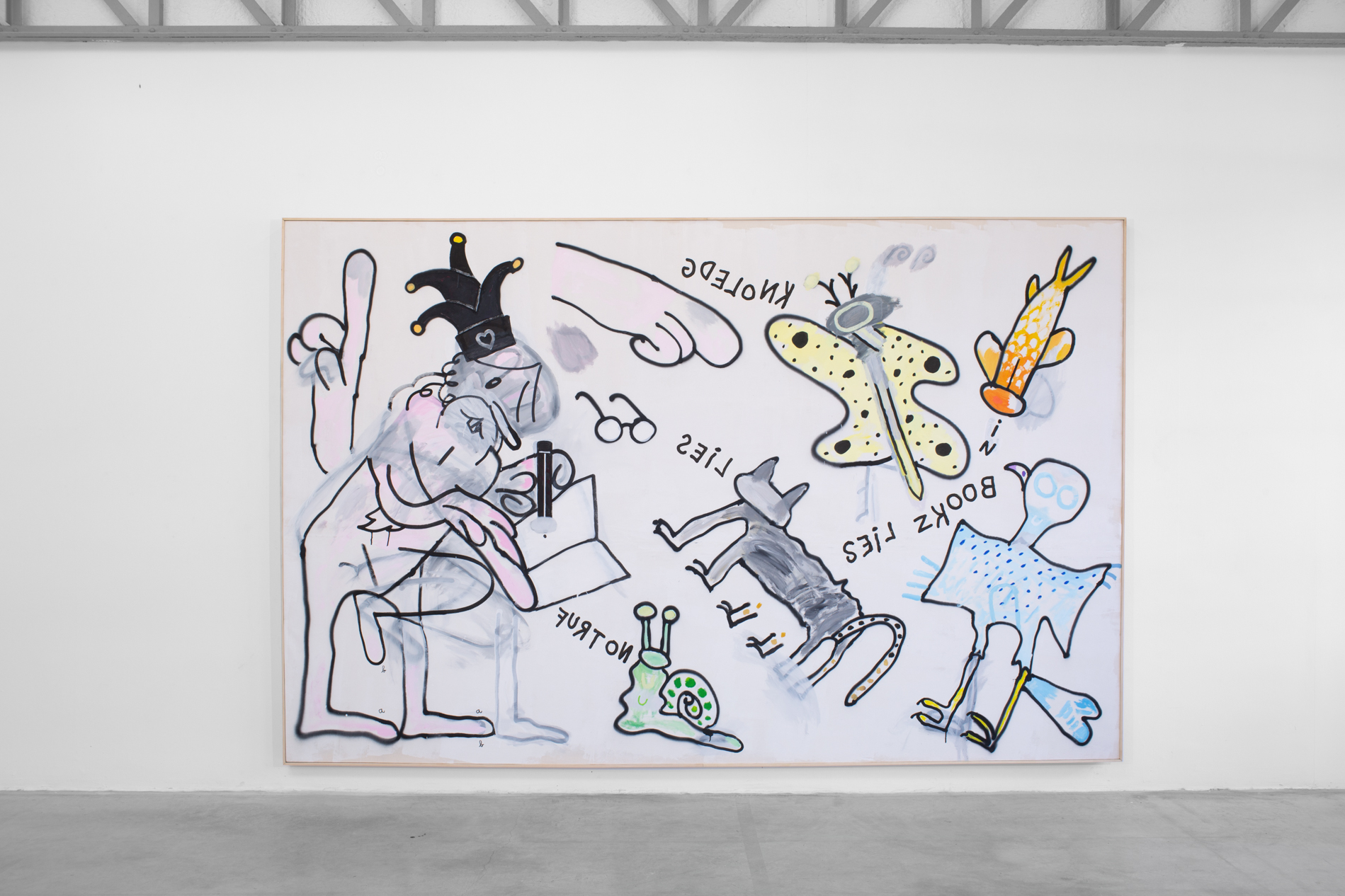 Depuis une quinzaine d’années, Adrien Vermont travaille à la déconstruction, voire à la destruction des récits fondateurs en Occident. Ceux-ci structurent un système patriarcal, néocolonial, capitaliste, classiste, monothéiste qui génère des normes porteuses de valeurs violentes. Après avoir remis en question des vérités scientifiques, l’artiste s’emploie à infuser une pensée philosophique et socialement engagée au sein de ses peintures dont il faut se méfier des apparences. Les figures animales peuplent le projet au très long cours : Sollertia Animalis (2013 – in progress). Sollertia Animalis explose la pensée binaire qui, encore aujourd’hui, s’obstine à opposer nature et culture. L’artiste précise : “or la seconde ne peut exister sans la première. Elle en découle. Au-delà de la bête opposition, il faudrait chercher la complémentarité en toutes choses.” Les serpents, les dauphins, les escargots, les chenilles ou encore les chiens nous livrent des messages dont la furiosité est en prise avec les réalités de nos sociétés. Ils nous interpellent sans retenue et toujours avec le sourire quant aux violences policières, financières, éducatives, machistes, écologiques, racistes et tant d’autres. En anglais, en latin et parfois en français, ils s’adressent à nous sous la forme de textes inscrits à l’intérieur de bulles. Parce que l’artiste travaille la plasticité du langage, les mots ne sont pas toujours faciles à décrypter, il nous faut produire un effort pour accéder aux messages scandés : Sic parvis magna (“Comme les grands, les petits”) – Ce que l’un chante, l’autre ne l’entend que par son oreille – Fuck police, hang bankers, Burn politics, etc. Les messages renvoient à une critique de l’ensemble des systèmes de domination qui contraignent les existences de plus de 90% des êtres vivants. Adrien Vermont déploie une pensée picturale fondée sur la ligne et la couleur. La ligne est brutale, inspirée des dessins d’enfants, des cartoons et d’une histoire de l’art sélective. Des peintures pariétales à Cy Twombly, en passant par Bonnard, Tracey Emin et Matisse, il étudie les manières de poser la couleur, ses écritures, ses matières et ses valeurs. Les oeuvres véhiculent une réflexion critique portée envers une conception académique et élitiste de l’art dit contemporain. Pour cela il s’appuie sur sa propre culture : une culture populaire où South Park, Tex Avery et Disney sont des références majeures au même titre que Giotto, Louise Bourgeois ou Artemisia Gentileschi. Avec un esprit de célébration de ses références, Adrien Vermont injecte dans ses peintures les personnages, la sémantique familière, les modes d’écriture, les stratégies de lignes et les synergies de couleurs issues des dessins animés, des bandes dessinées et des mangas. L’artiste peint sur papier libre ou bien contrecollé sur toile, sur carton – il peint à même les murs, il sérigraphie les dessins réalisés sur tablette numérique. Ces mêmes dessins peuvent aussi être imprimés sur tee-shirts. Il déchire et recompose les oeuvres sur papier. Les gestes, les supports et les choix techniques (peinture acrylique, peinture à l’encaustique, stylet sur écran, sérigraphie, impression) participent d’une remise en cause de ce qui fait oeuvre : sa matérialité, sa valeur, ses modes de reproduction, son originalité, etc. C’est avec une liberté sans borne qu’Adrien Vermont bouscule un ensemble de lieux communs, de vérités héritées, de convictions nécessairement trompeuses, excluantes et aliénantes. C’est dans une perspective radicale et joyeuse que l’artiste fabrique, avec les figures animales, une farandole aussi drôle que politique. Les personnages aux allures folles et furieuses transmettent ainsi des notions philosophiques de manières insolentes et hilarantes. La joie et la rage sont conjuguées au profit d’une critique de nos contradictions, de nos névroses, de l’extrême violence, de l’absurdité et de l’invalidité des systèmes autoritaires qui sabrent nos libertés fondamentales. Les peintures manifestent un refus catégorique de toute forme d’autorité : en art comme dans la vie. Il s’agit alors de déconstruire le socle classique, excluant et assignant, en proposant des contrepieds. Ces derniers nous engagent à voir, à entendre et à comprendre les bribes d’une pensée plastique, politique et philosophique. Ainsi, les sources populaires participent d’un langage contemporain, un langage efficace et commun qui est encore largement dénigré, voire méprisé par les tenant.es des normes artistiques. L’artiste pense que “la profondeur d’une idée, d’une pensée complexe, peut-être contenue dans une forme simple (mais pas simpliste).” Par ce langage commun, Adrien Vermont tend à rendre accessible une réflexion millefeuille où s’articulent des engagements explicites, une pensée philosophique en peinture et le travail de la peinture elle-même. L’artiste invoque notre libre arbitre pour nous amener à douter et à renverser des vérités imposées. Je doute, donc je suis. Pour nous libérer par nous-mêmes des pouvoirs dévastateurs, des constructions et des schémas hérités qu’il nous faut ré-apprendre à désamorcer et à réécrire. »