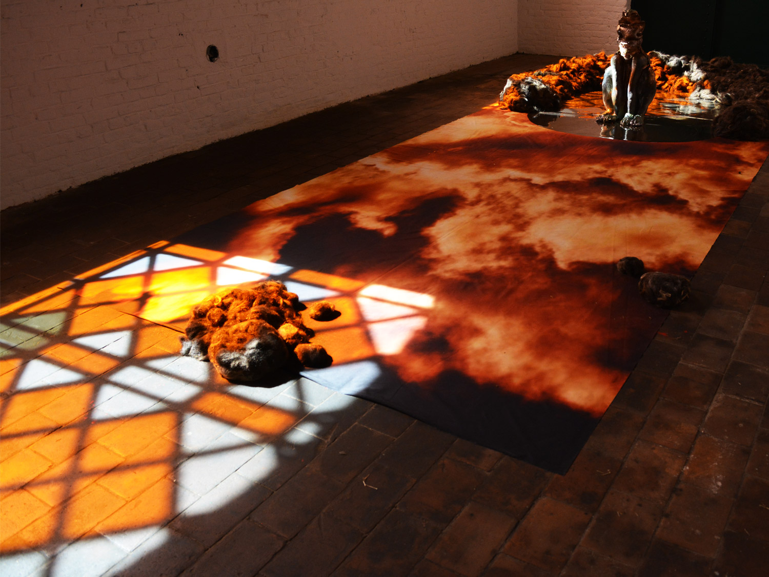 Elodie Wysocki se joue de la réception inquiétante, étrange et inconfortable que nous pouvons avoir de ses œuvres. Les corps y sont hors normes, mutants, recouverts, vidés, abîmés, blessés, fragmentés. Ils sont en mouvement, ils se dégradent et se transforment au fil du temps. Ils nous parlent de la perte, de la mort, mais aussi d’un potentiel devenir et d’une volonté d’insoumission. Par l’hybridation humaine et plus qu’humaine, l’artiste explore la notion de mutation et de métamorphose des corps : femmes oiseaux, femme grenouille, louve, etc. L’animalité constitue une réponse païenne et sorcière à un héritage catholique extrêmement pesant. Ainsi les mitres (coiffes religieuses réservées aux évêques) deviennent des oiseaux rieurs dont les visages sont prolongés de longues chevelures libres et/ou feutrées (Mitres rieuses, 2018). En 2023, dans le contexte minier de la Louvière en Belgique, elle présente Le dernier qui s’en va éteint la lumière, une installation qui allie une ambiance apocalyptique (la lumière du ciel en feu, des nuages orangés) et le rituel d’une femme grenouille agenouillée dans une mare-miroir, entourée de de pelotes de cheveux. Il s’agit d’une évocation de La Loba, une figure mythologique sud-américaine racontée par Clarissa Pinkola Estès : “Elle est circonspecte, souvent velue, toujours grosse et fuit la compagnie des autres. Elle croasse et caquette et s’exprime plus par des cris d’animaux que par des bruits humains.” Elle est La Loba, littéralement “la louve”, ou la Femme aux os car sa mission est de ramasser les ossements éparpillés des animaux sauvages. La légende dit que si elle parvient à reconstituer le squelette entier s’ensuit une cérémonie où La Loba chante auprès d’un feu pour faire revivre l’animal. “La Loba chante toujours, un chant si profond que le sol du désert tremble et pendant qu’elle chante, la bête ouvre les yeux, bondit sur ses pattes et détale dans le canyon.” Les œuvres renvoient une énergie et une force vitale, un pouvoir enfoui que Starhawk (sorcière et militante écoféministe californienne) nomme le pouvoir-du-dedans. Un pouvoir à propos duquel elle écrit en 1982 : “Oui, le pouvoir-du-dedans est le pouvoir du bas, de l’obscur, de la terre ; le pouvoir qui vient de notre sang, de nos vies et de notre désir passionné pour le corps vivant de l’autre. […] Quand nous plantons, quand nous tissons, quand nous écrivons, quand nous enfantons, quand nous organisons, quand nous soignons, quand nous courons à travers le parc, dans la brume exhalée par les séquoias, quand nous faisons ce que nous avons peur de faire, nous ne sommes pas seules. Nous sommes du monde et les uns avec les autres, et notre pouvoir-du-dedans est grand, même s’il n’est pas invincible. Si nous pouvons être blessés, nous pouvons soigner ; si chacun de nous peut être détruit, en nous il y a le pouvoir de renouveau. Et il est encore temps de choisir ce pouvoir-là.”