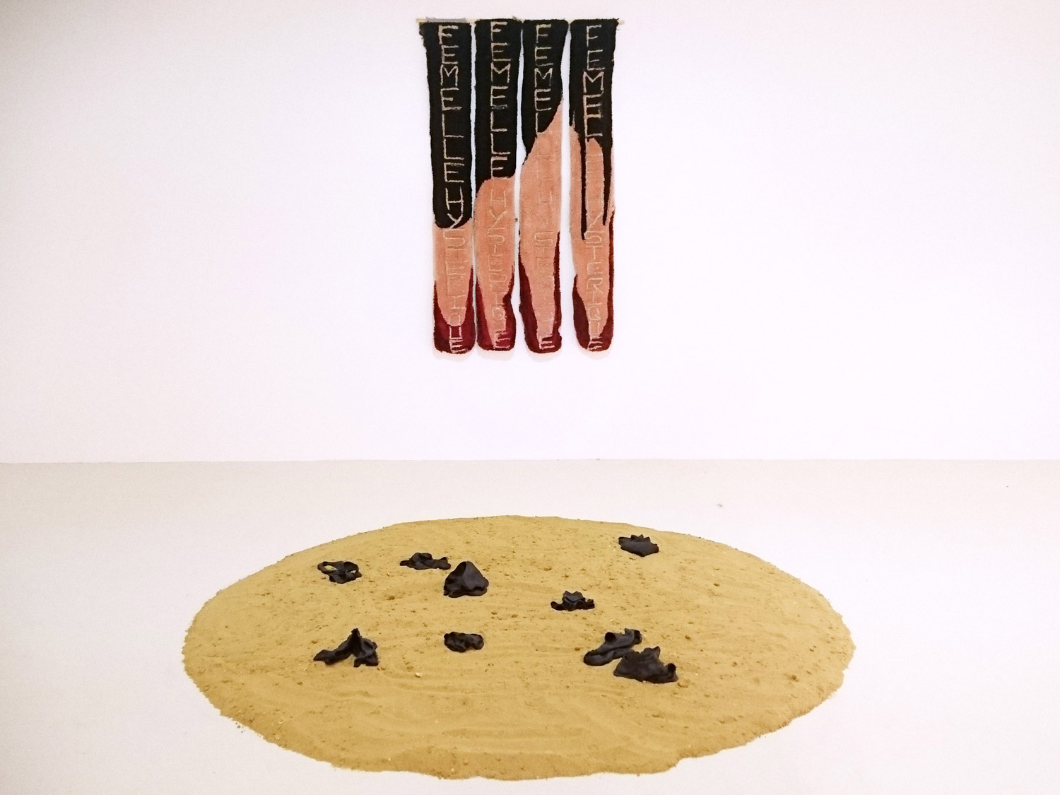 Sur l’ensemble de la surface de la Terre, il existe très peu de lieux, de (micro)sociétés ou de communautés où les femmes sont réellement libres. En existe t-il d’ailleurs vraiment ? Le patriarcat, alimenté par les monothéismes et le néolibéralisme, instaure des violences systémiques qui perpétuent un flux d’oppressions, de stéréotypes, de discriminations et d’assignations. Les femmes sont comme ci, les femmes sont comme ça… Nous le savons, les idées généralistes tuent les femmes depuis bien trop longtemps. Nous sommes cantonnées à des rôles bien précis : la mère, l’amante, la travailleuse du sexe, la sorcière, la sœur, l’épouse, la pieuse, la fille, la folle ou la pleureuse. Cantonnées aussi à des normes vestimentaires, physiques, mentales voire même sonores. N’y jamais trop, ni jamais assez. Nos sexes sont une insulte commune. Des con.nes partout. Nos existences sont vulnérables. Les chiffres sont éloquents : viols, féminicides, incestes, harcèlements, privations de libertés fondamentales, insultes, coups, menaces, violences psychiques, physiques et tant d’autres. L’histoire des femmes est celle de luttes incessantes pour obtenir la liberté de chacun.e, pour obtenir le droit de disposer de son corps, sans conditions et sans compromis. Elodie Wysocki travaille son histoire, ainsi que la nôtre, pour construire des corps aussi fragiles que puissants : des corps de femmes, des corps hybrides de tout âge et toute espèce. L’artiste s’intéresse autant aux grandes histoires, aux mythes qu’aux faits divers, les petites histoires – invisibles et silencieuses. Pour cela, elle s’attaque aux assignations et aux archétypes que le patriarcat a tatoué dans la chair de l’humanité. C’est à partir de ces violences qu’elle a notamment pensé l’œuvre intitulée Les Incomptées (2021). Telle une scène de rituel, l’installation met en regard une œuvre murale et tuftée sur laquelle est répétée le mantra : Femelle hystérique. Au sol, sur un cercle de sable jaune, sont disposées des œuvres en terre carbonisée. Elles représentent des culottes de fillettes, de femmes. Les Incomptées sont les femmes aux destins brisés, aux corps traumatisés, aux existences non essentielles – les femmes disparues à qui l’artiste rend un hommage (ou plutôt, un femmage) appuyé.